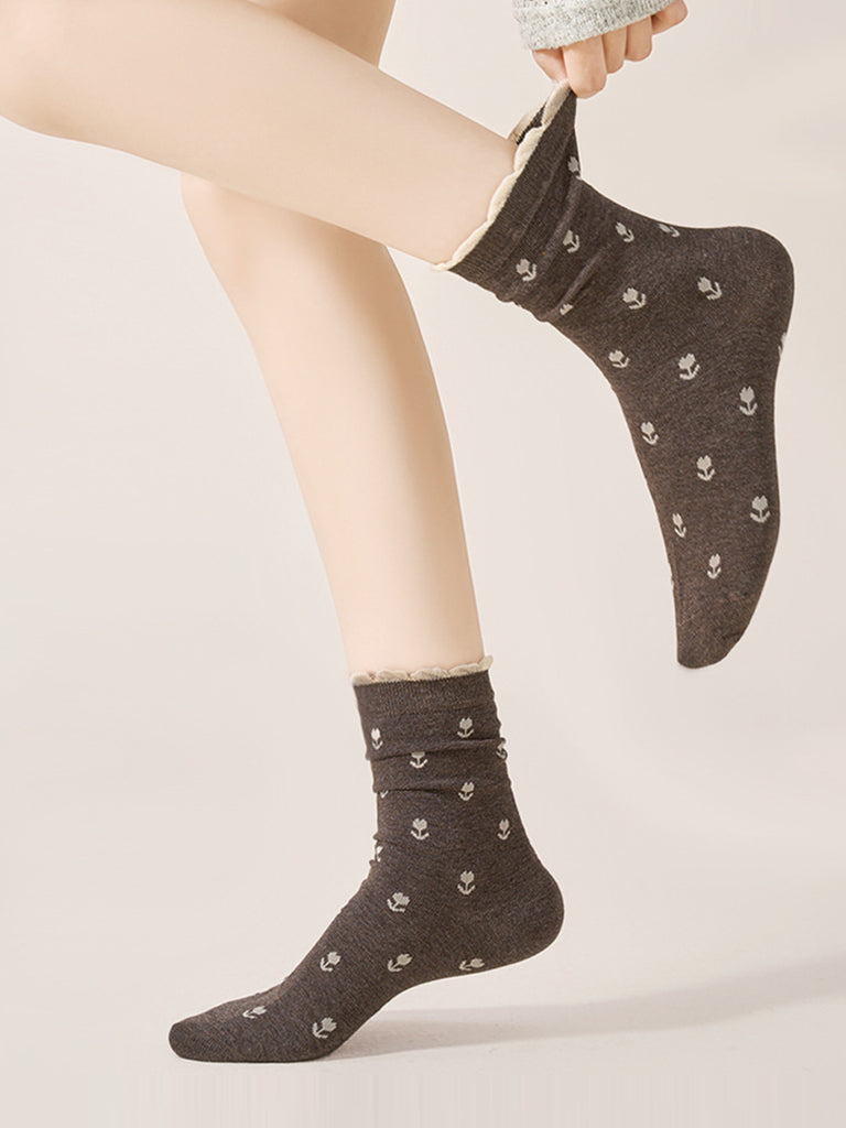 5 Pairs Women Autumn Flower Jacquard Mid Heel Socks
