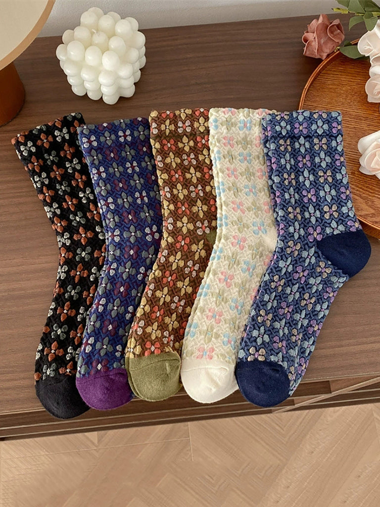 5 Pairs Women Autumn Artsy Floral Jacquard Socks