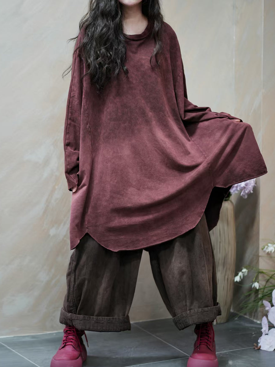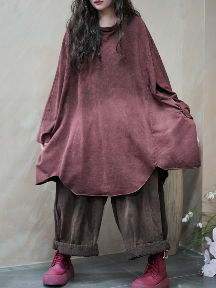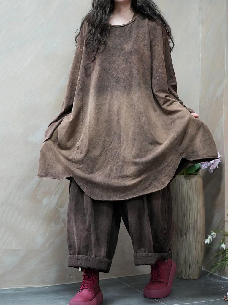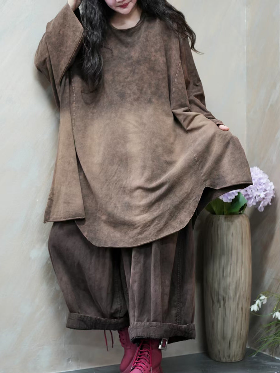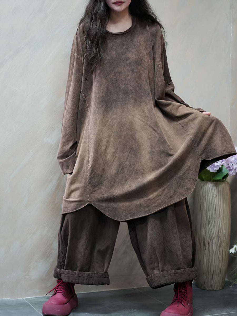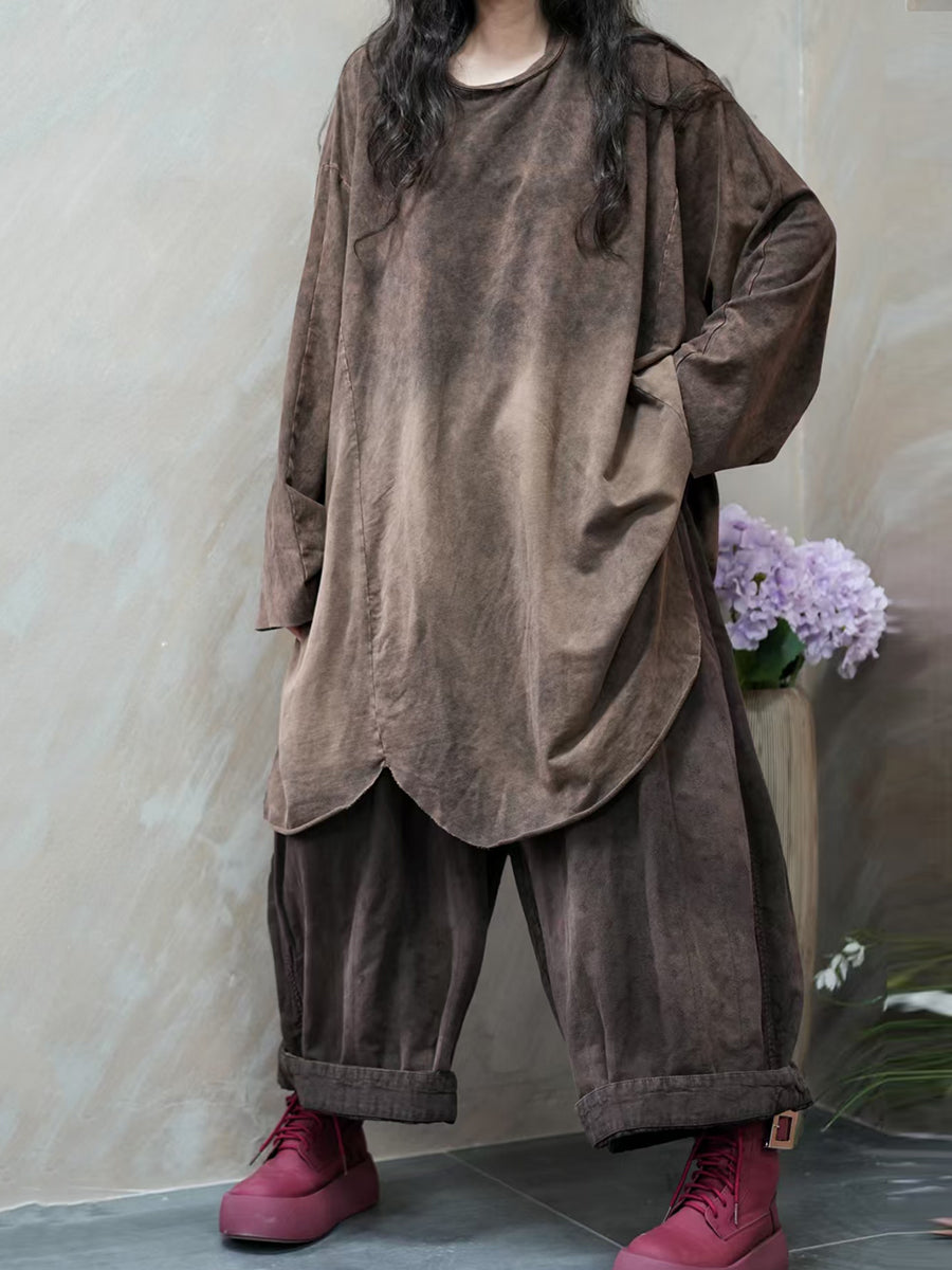 Women Autumn Retro Tie-dye O-Neck 100%Cotton Blouse