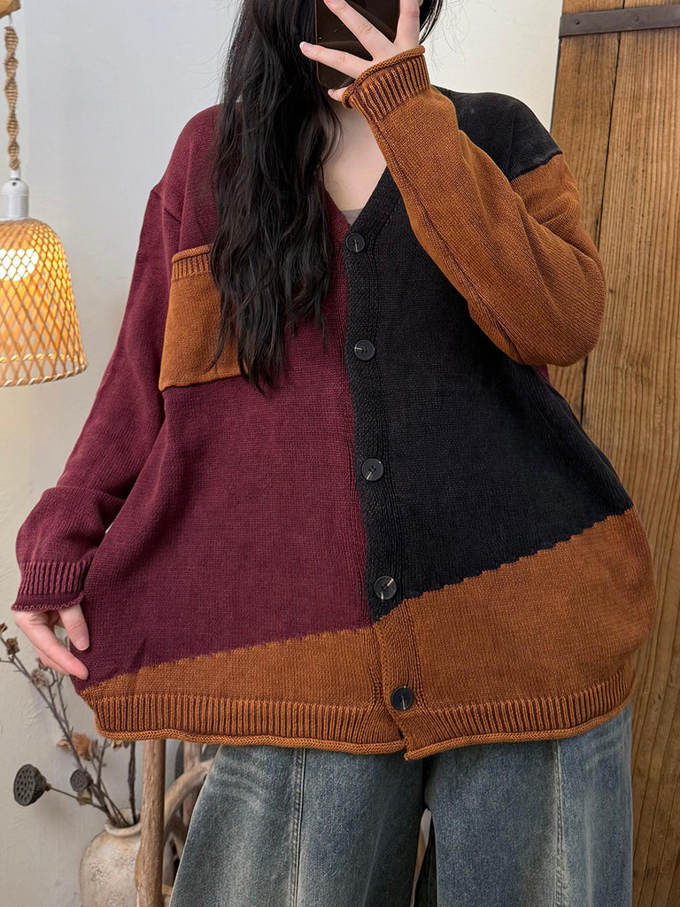 Women Vintage Colorblock V-Neck Knitted Sweater