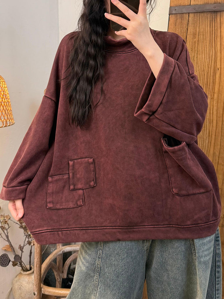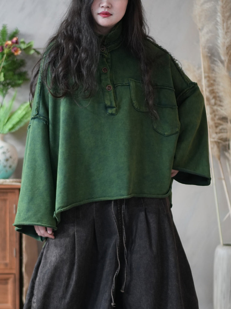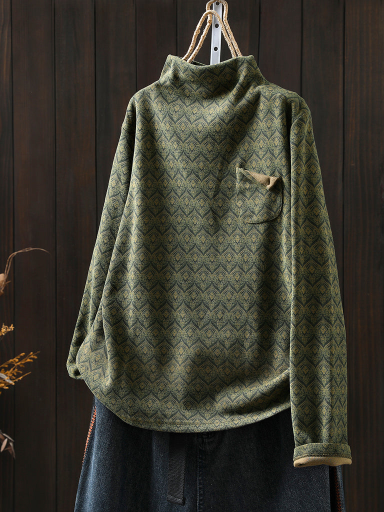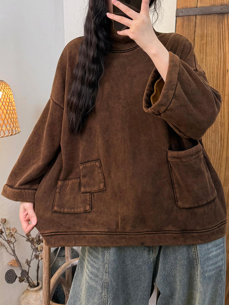 Women Vintage Autumn Stand Collar Fleece-lined Blouse