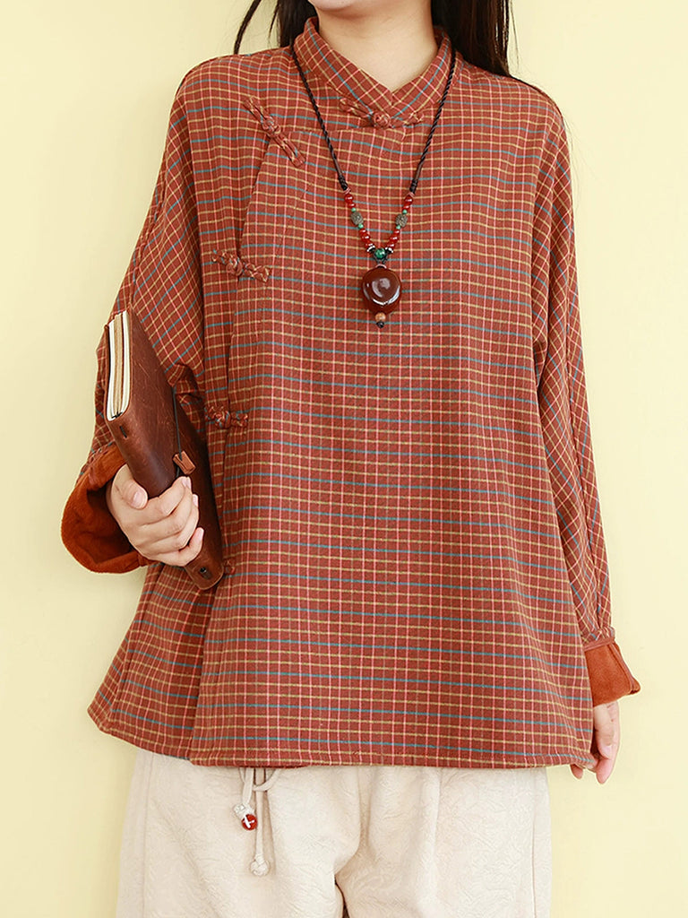 Women Winter Ethnic Plaid Stand Collar Fleece-lined Blouse