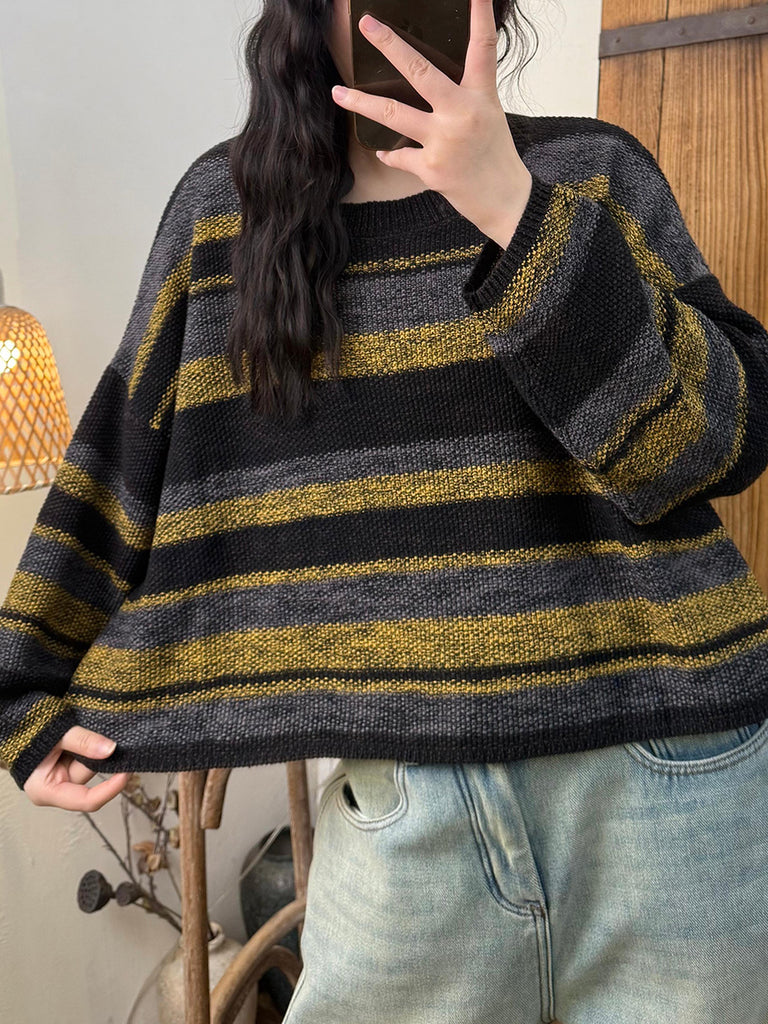 Women Autumn Retro Stripe O-Neck Sweater