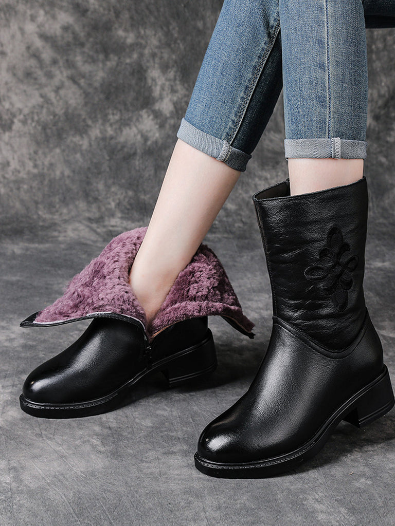 Women Winter Retro Leather Flower Spliced Ankle Boots