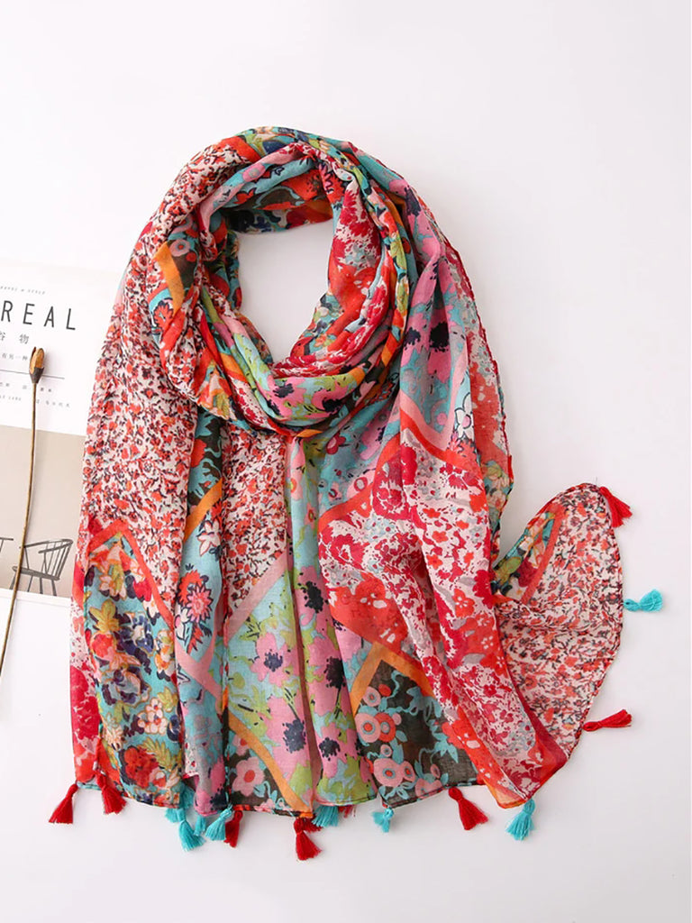 Vintage Artsy Cotton Print Tassel Scarf Shawl