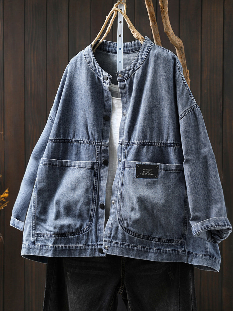 Plus Size Women Summer Retro Pure Color Stand Collar Denim Coat