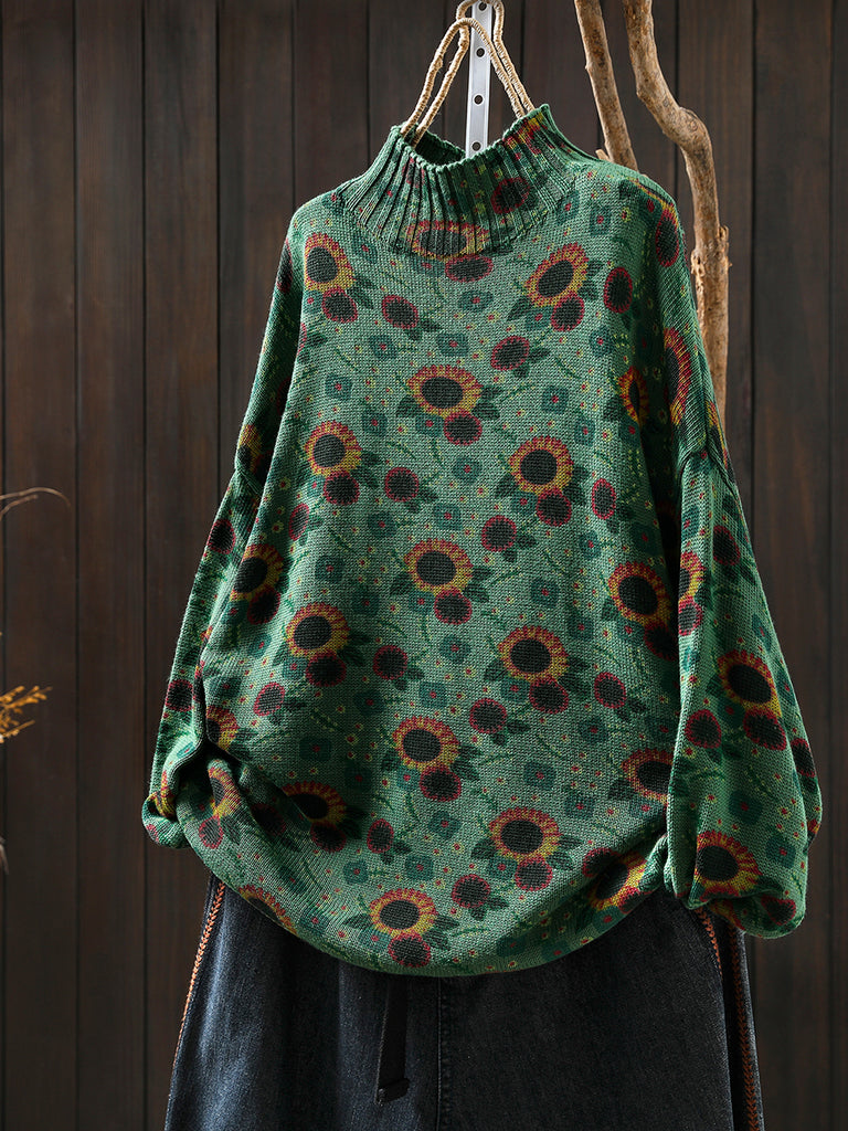Women Autumn Artsy Sunflower Half-Turtleneck Sweater