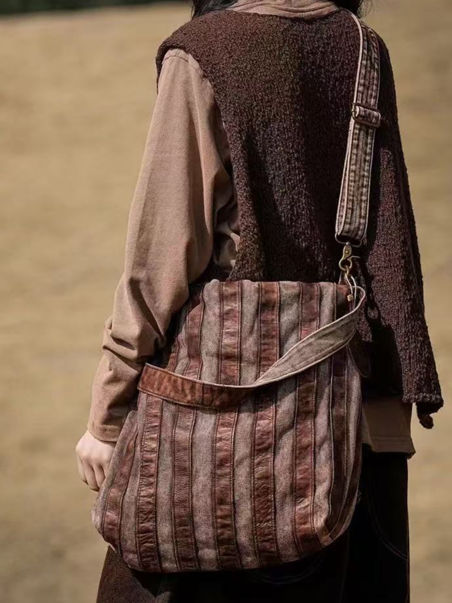 Vintage Leather Stripe Spliced Multifunctional Bag