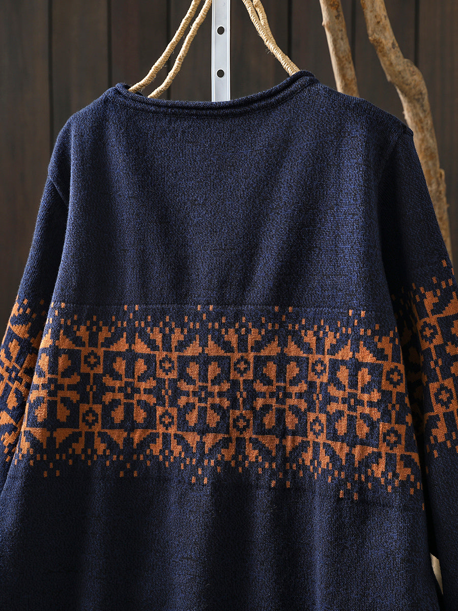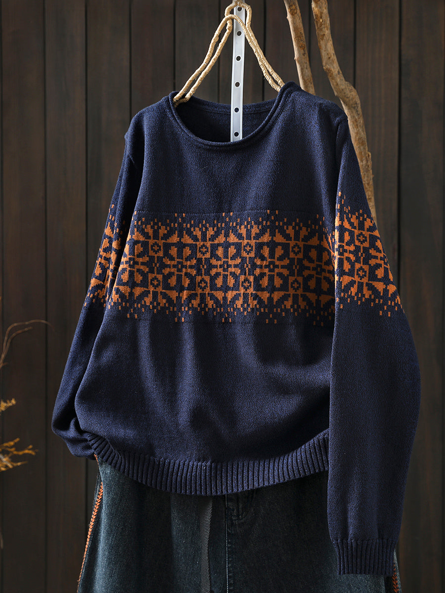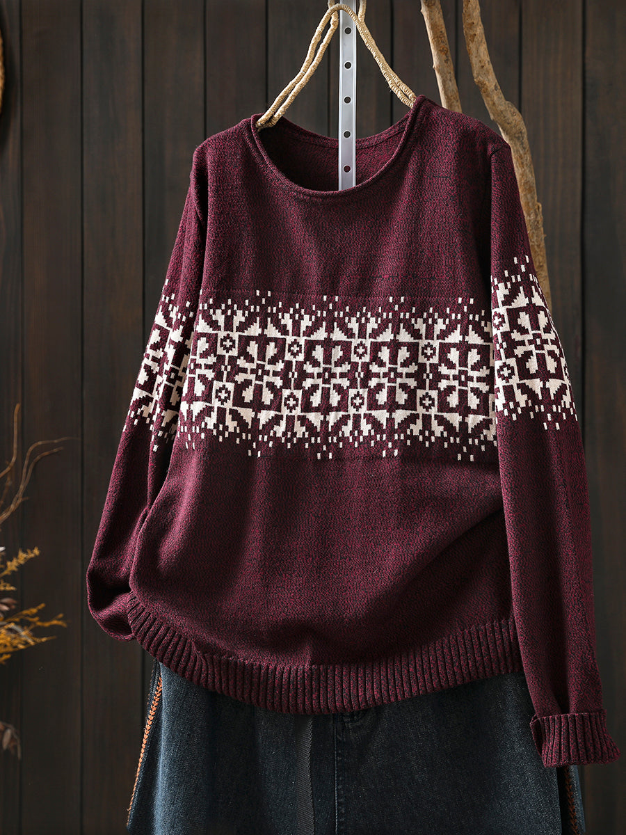Women Autumn Artsy Flower Knitted O-Neck Sweater