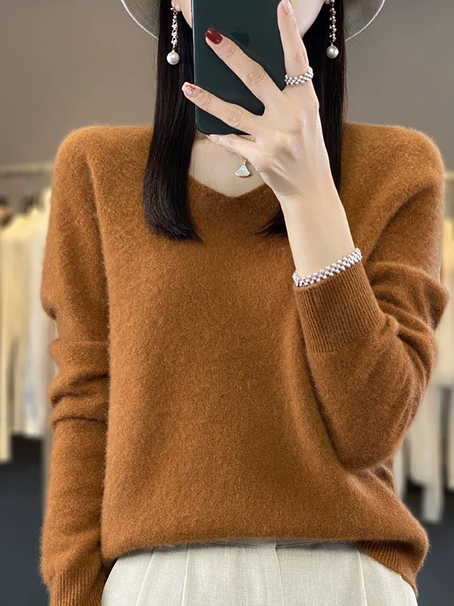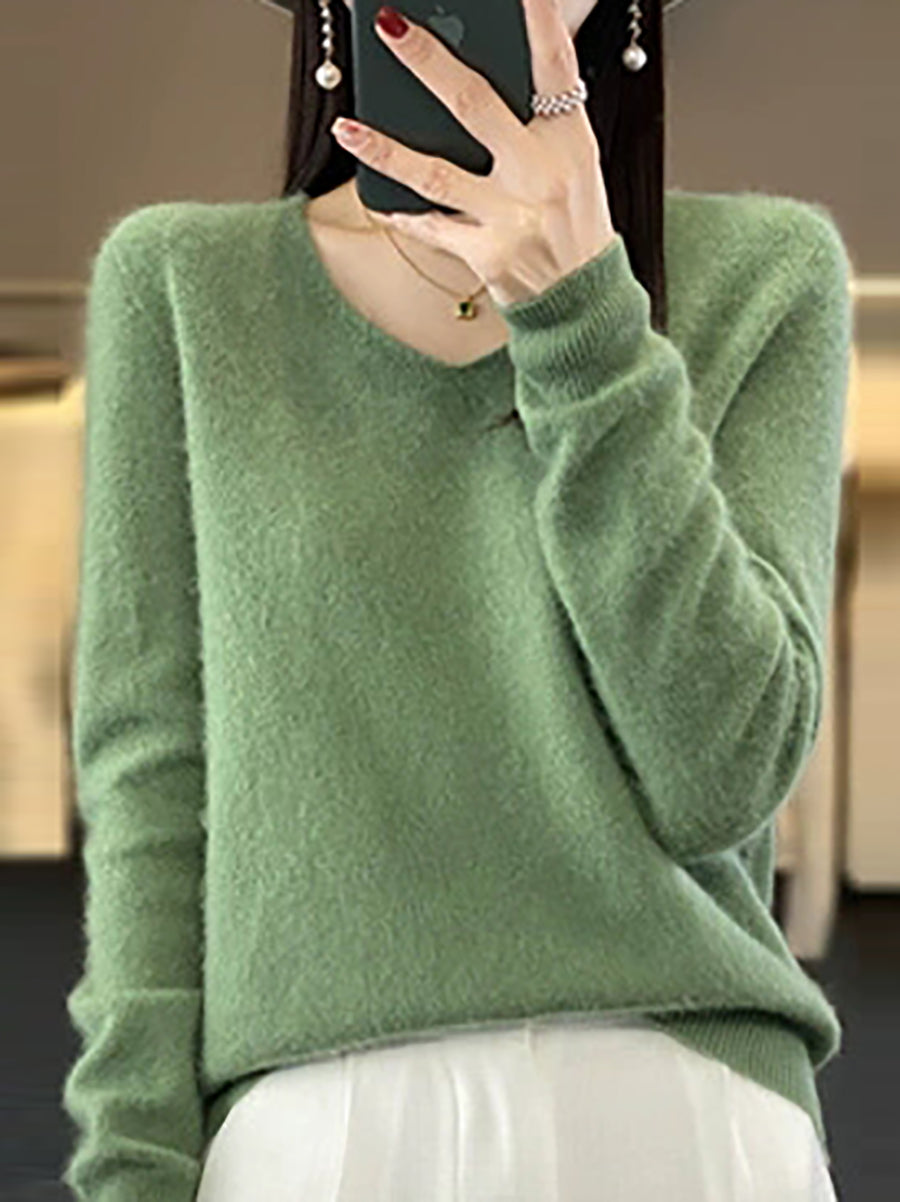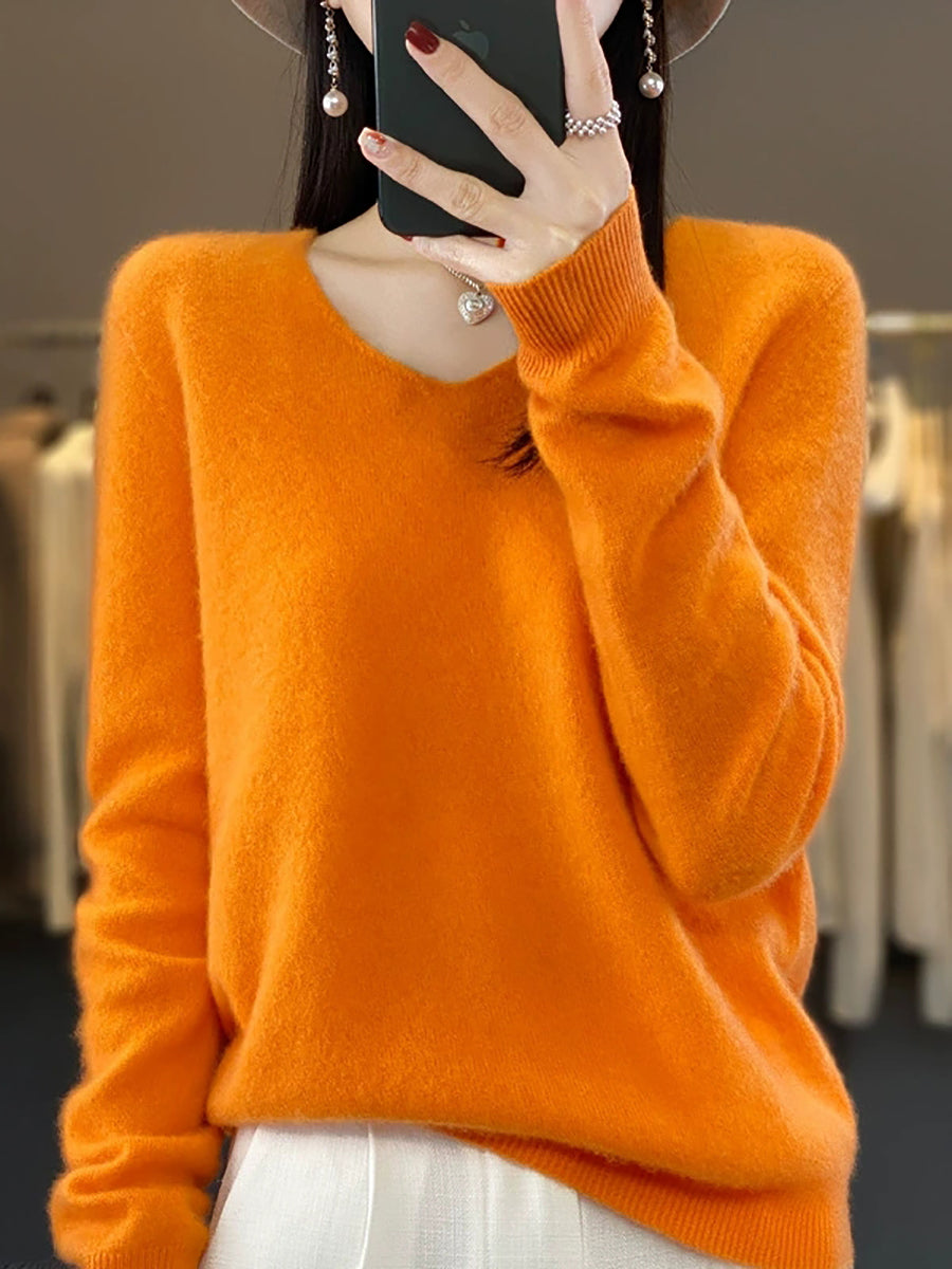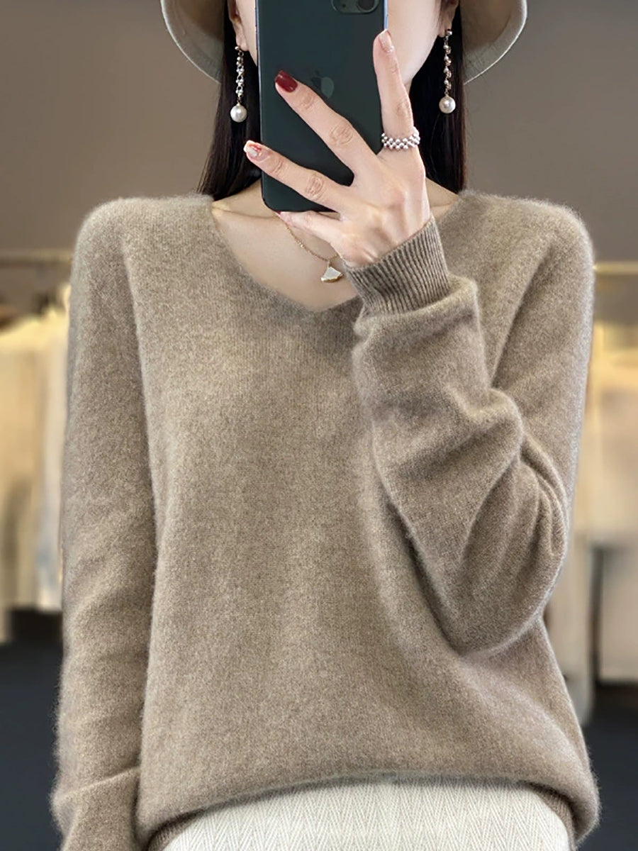 Women Autumn Artsy Pure Color V-Neck Sweater