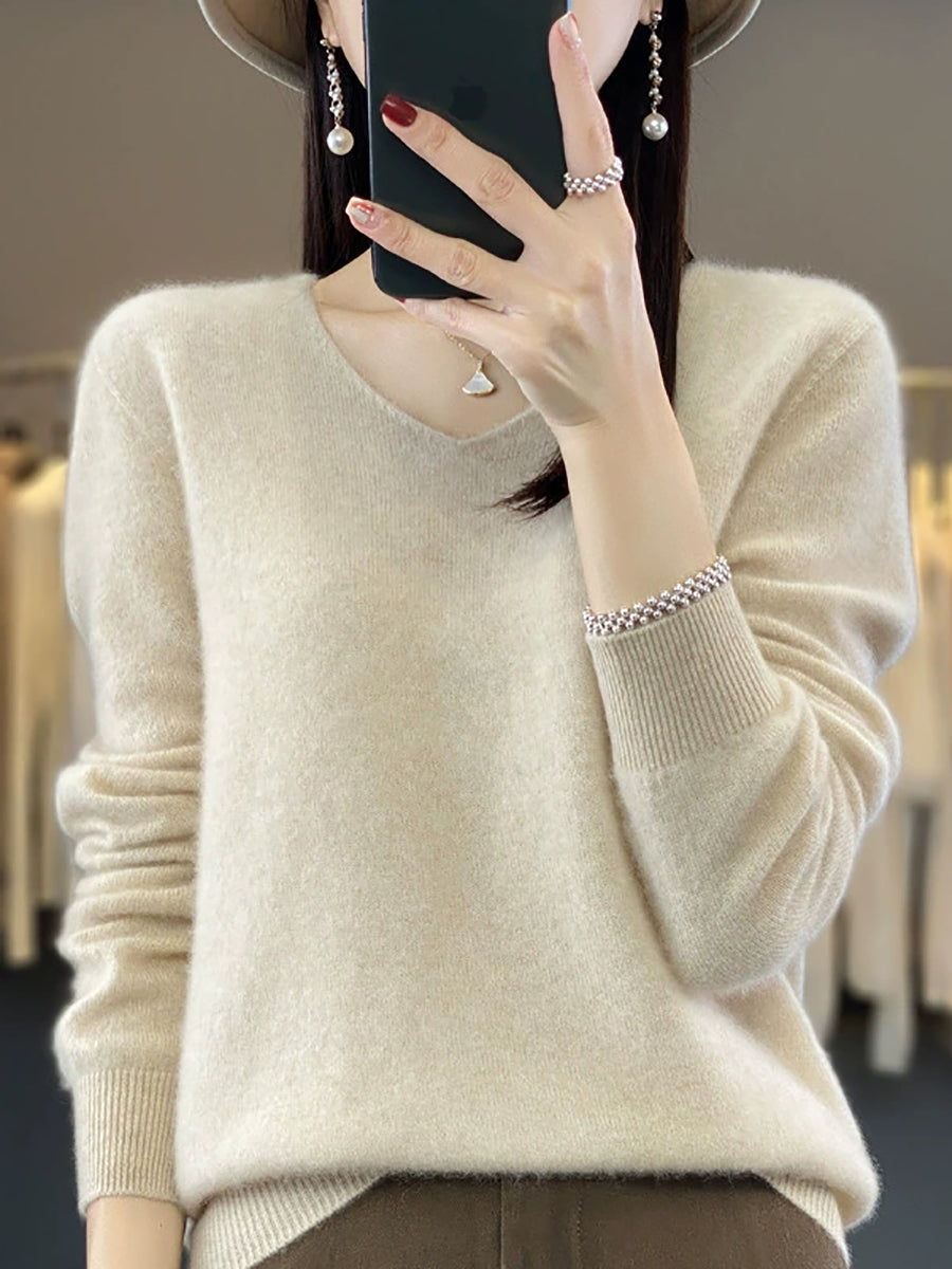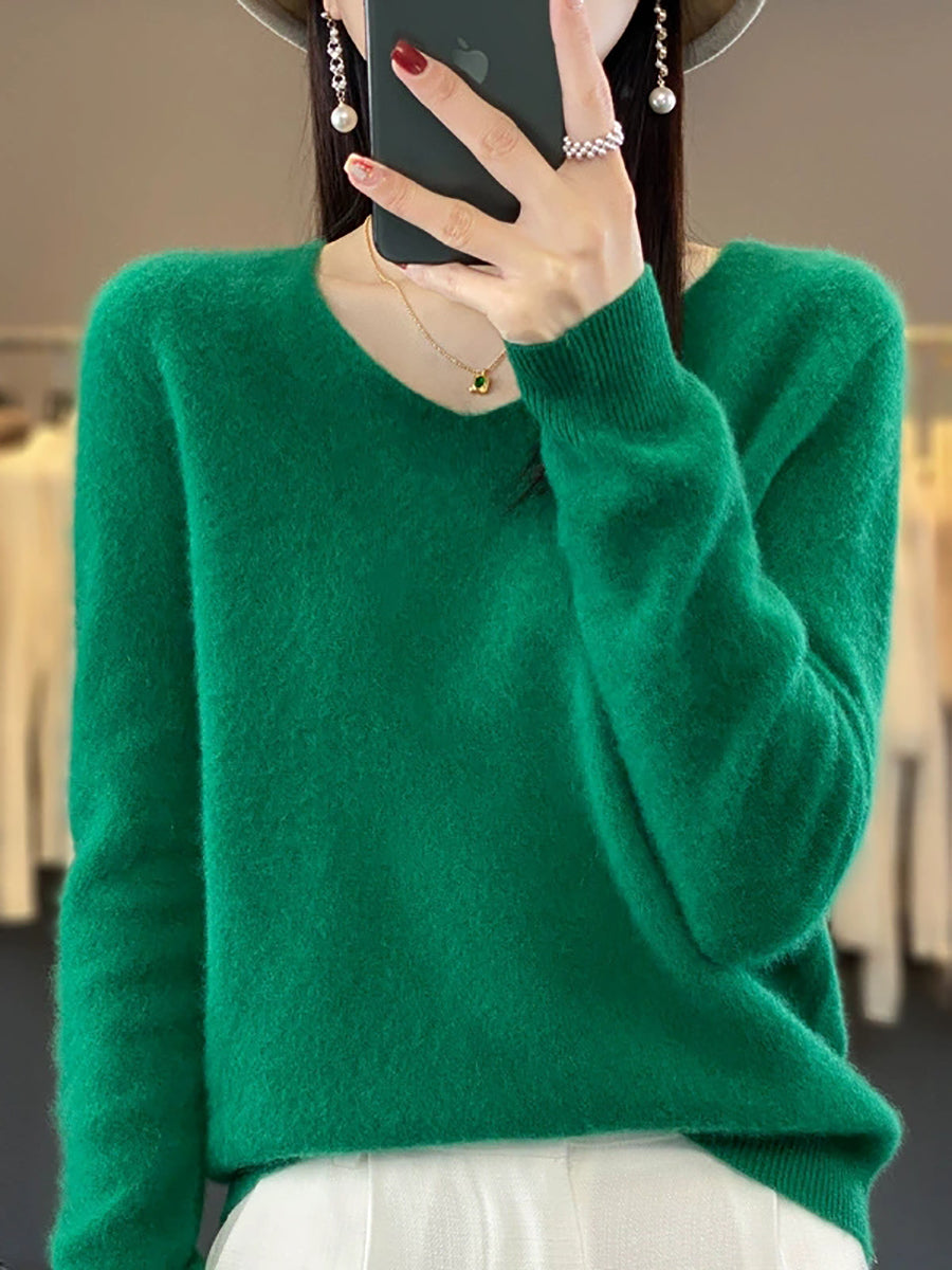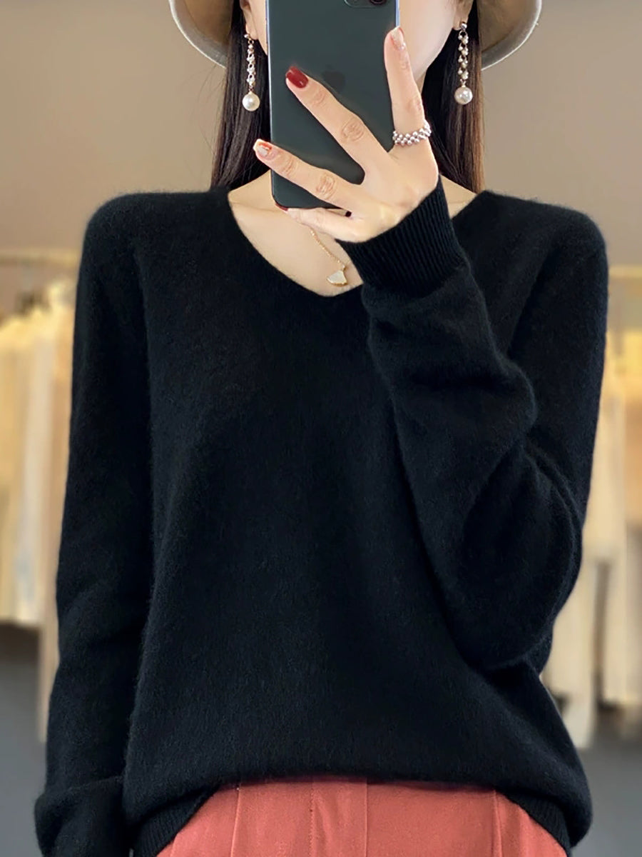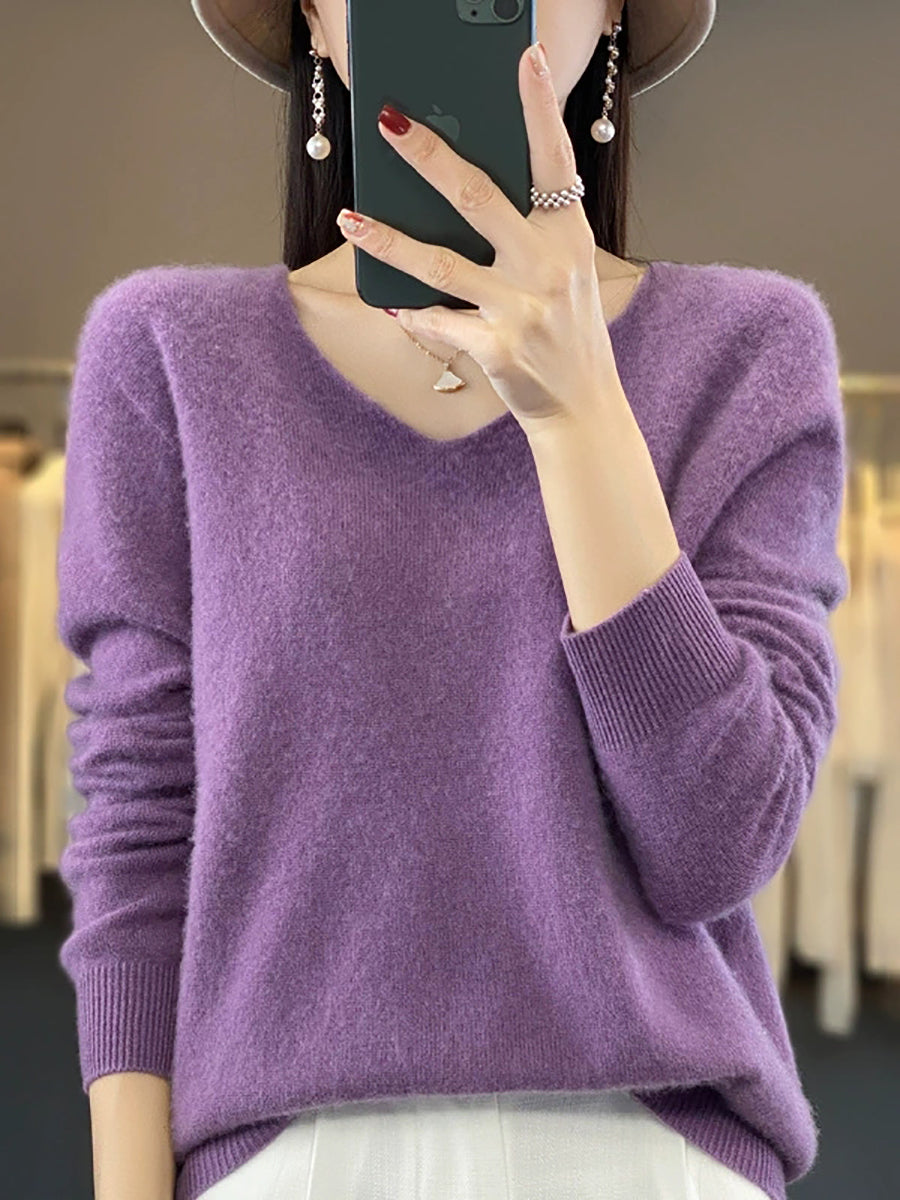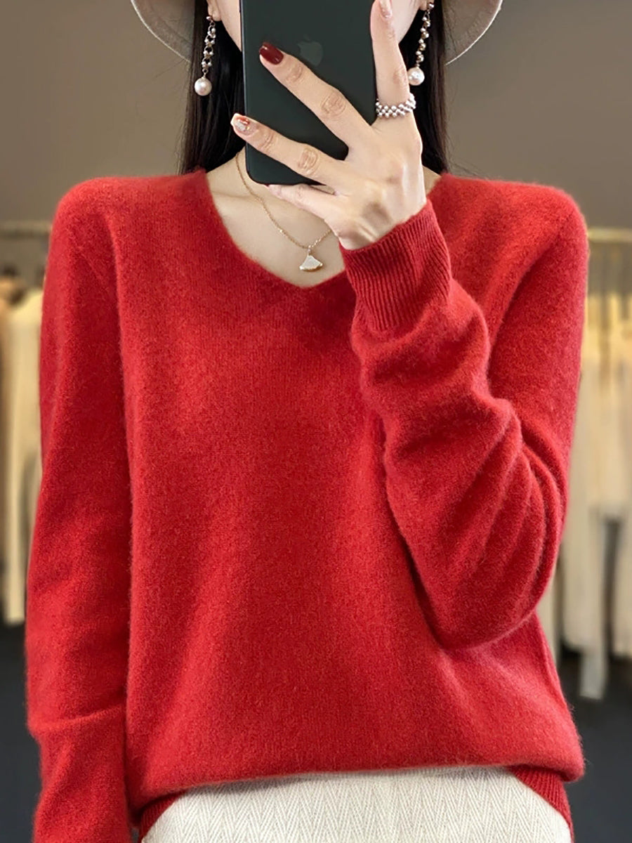 Women Autumn Artsy Pure Color V-Neck Sweater