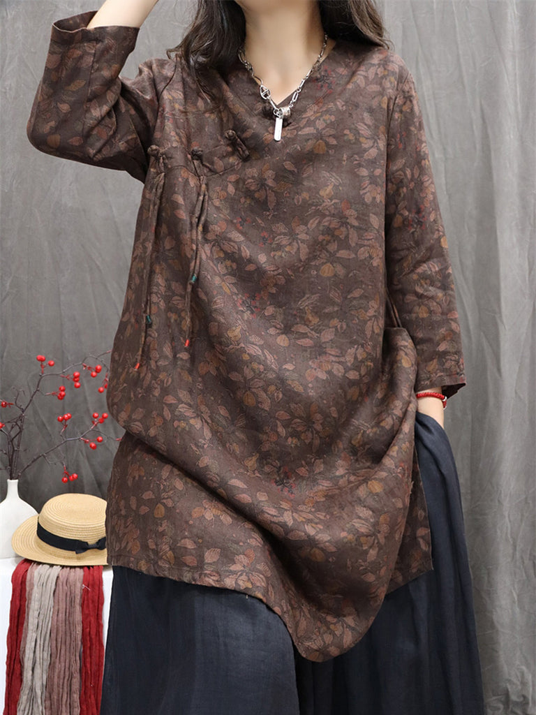 Women Autumn Retro Flower 100%Linen V-Neck Shirt