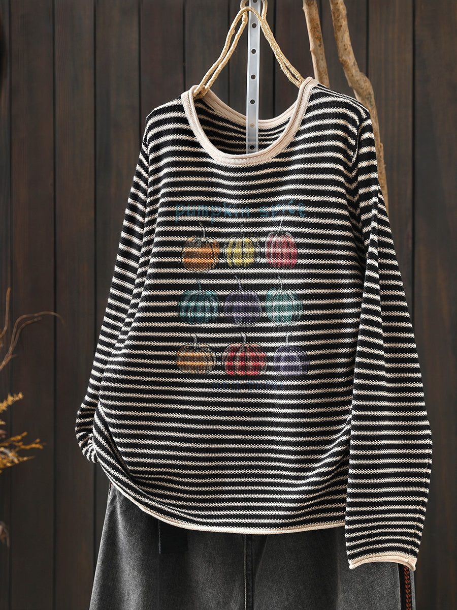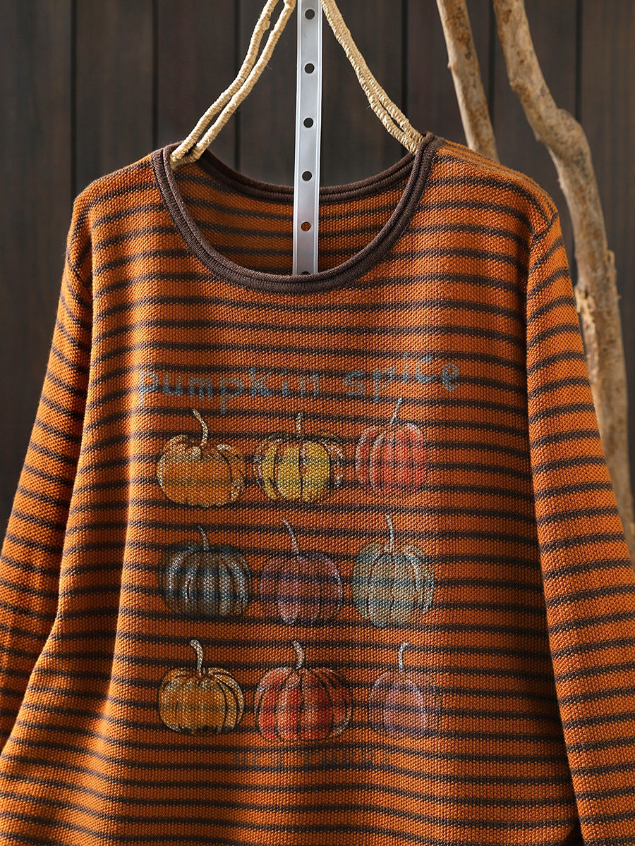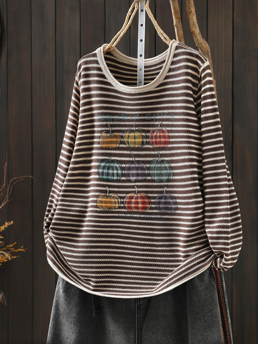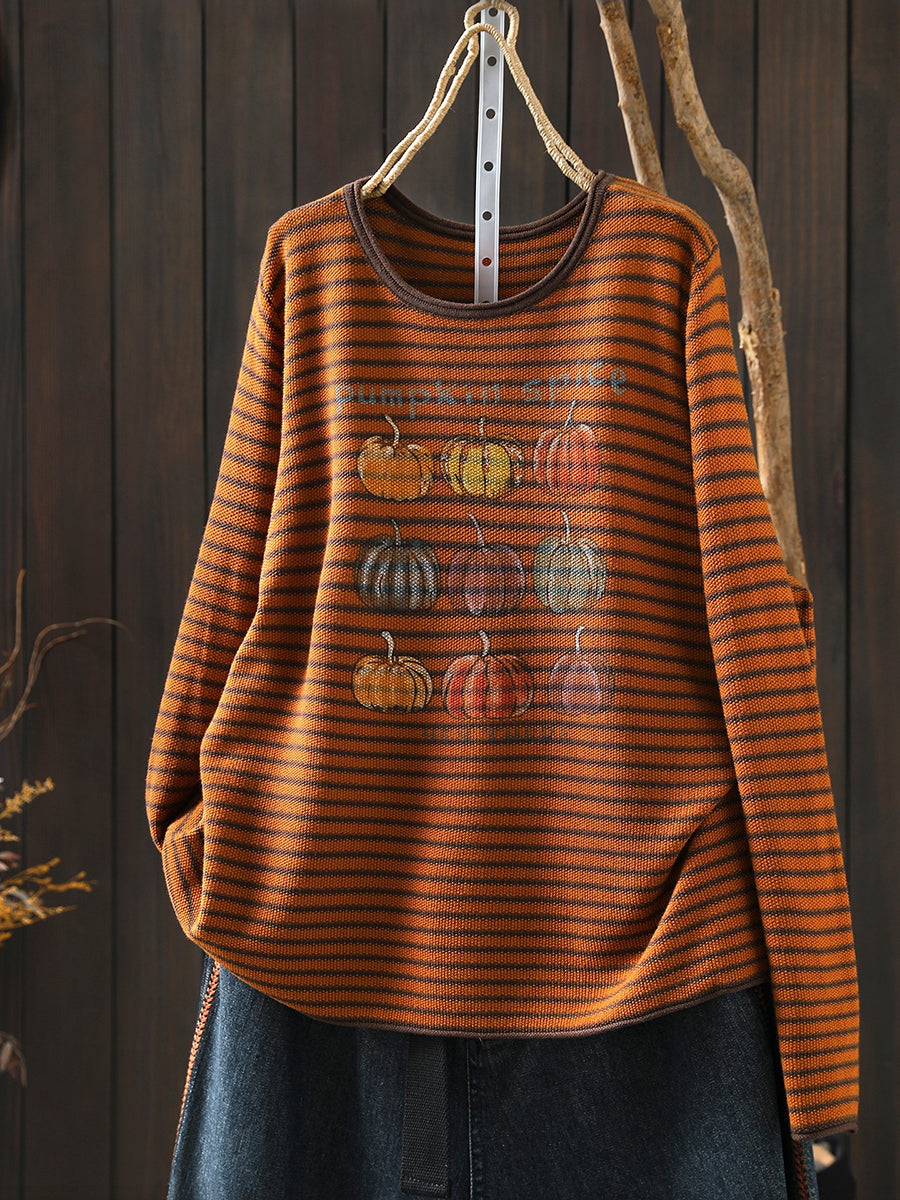 Women Casual Spring Stripe Pumpkin O-Neck Blouse