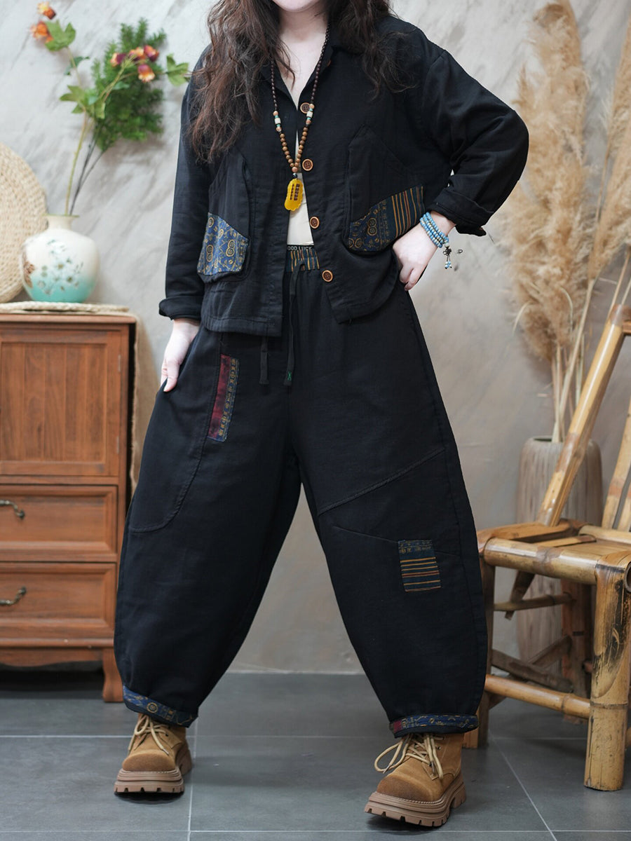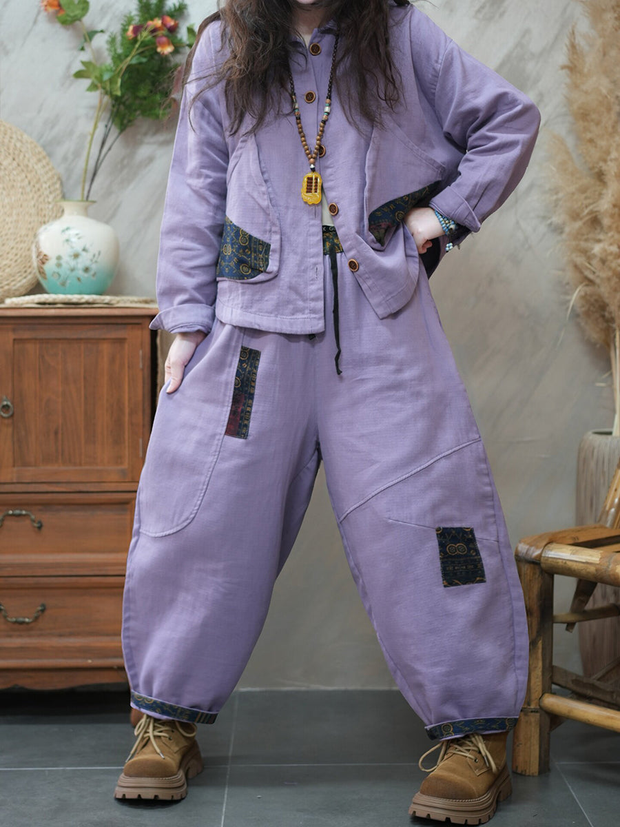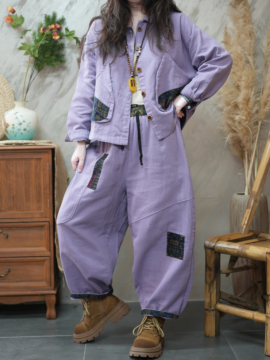 Women Spring Retro Patchwork Turn-down Collar Suits