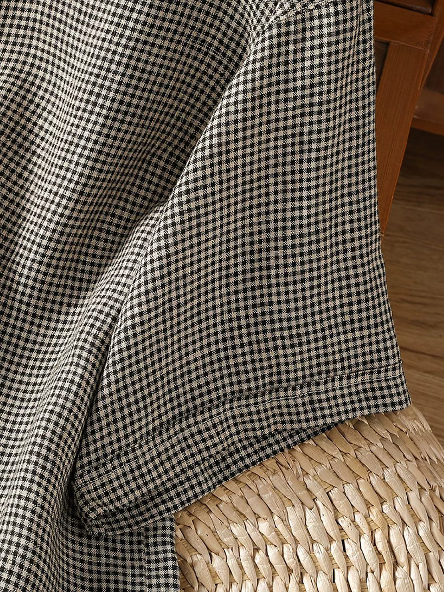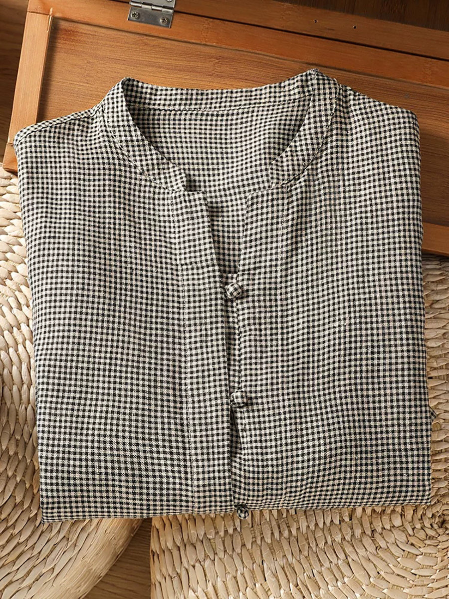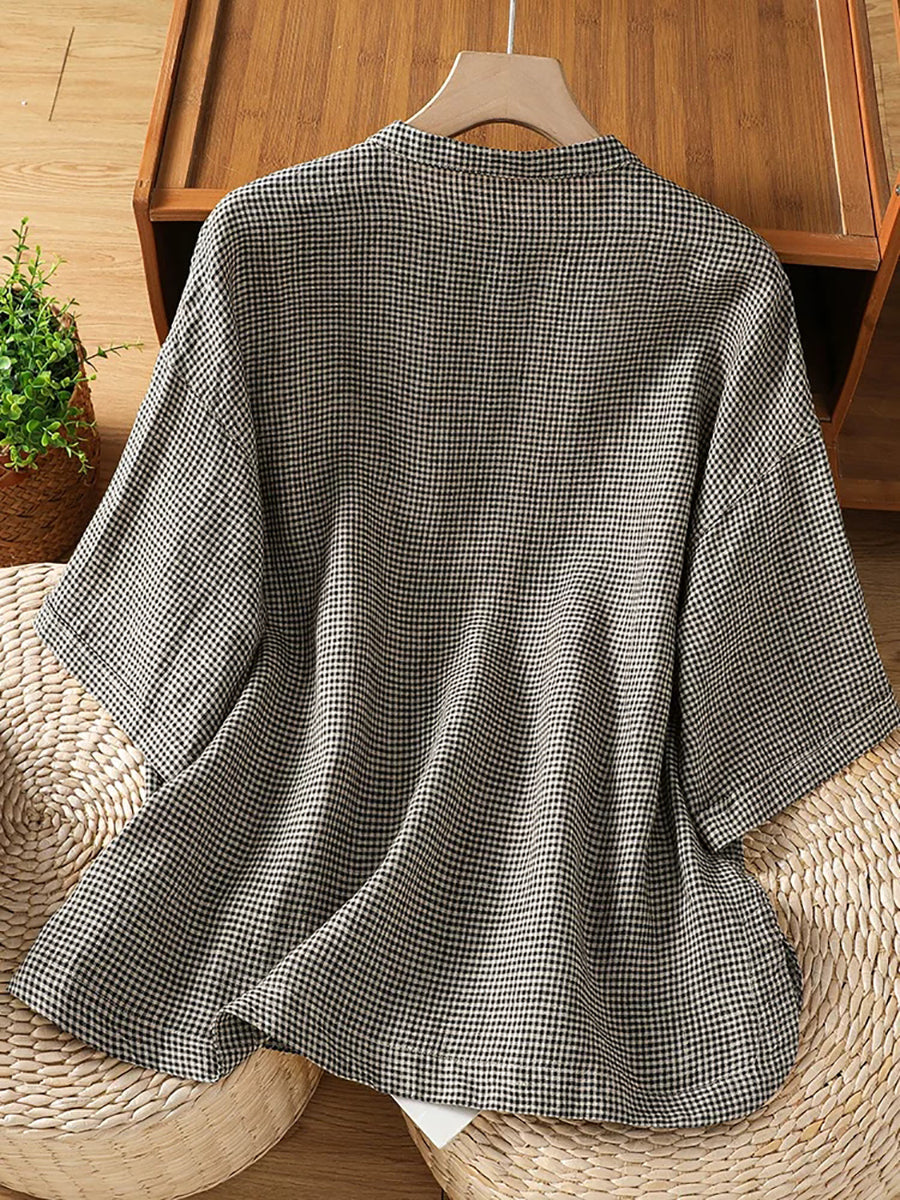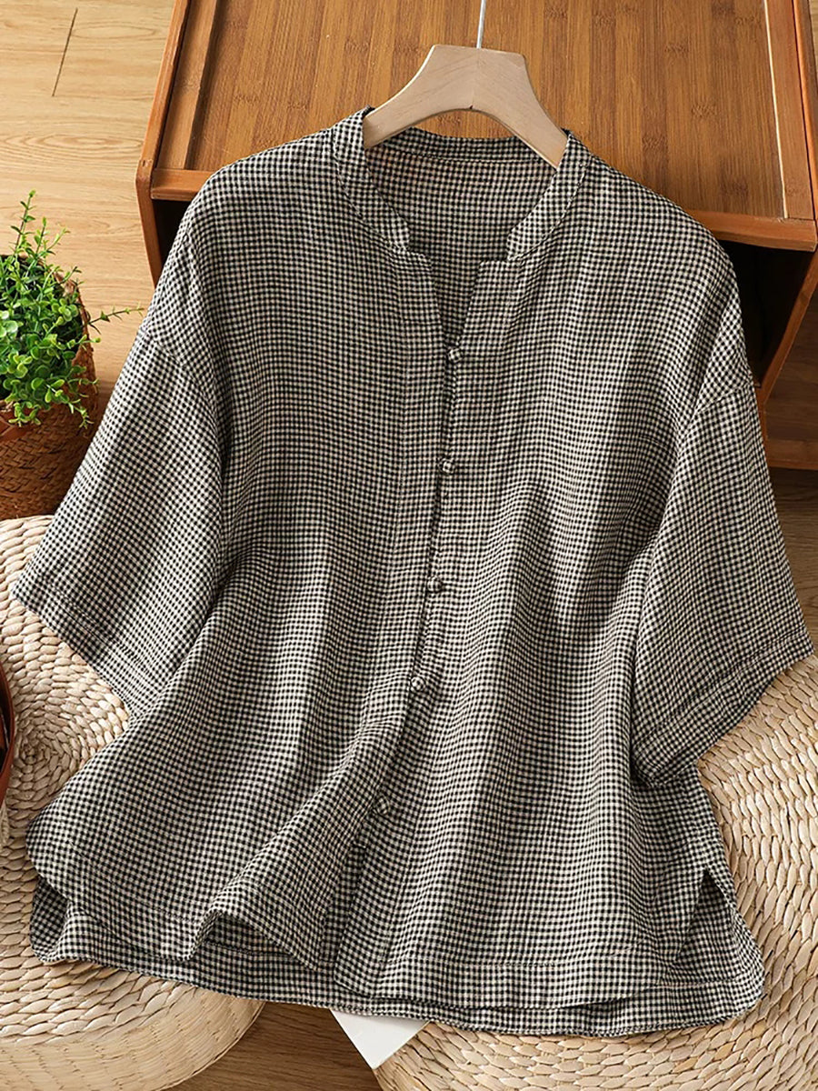 Women Summer Retro Lattice Stand Collar Blouse