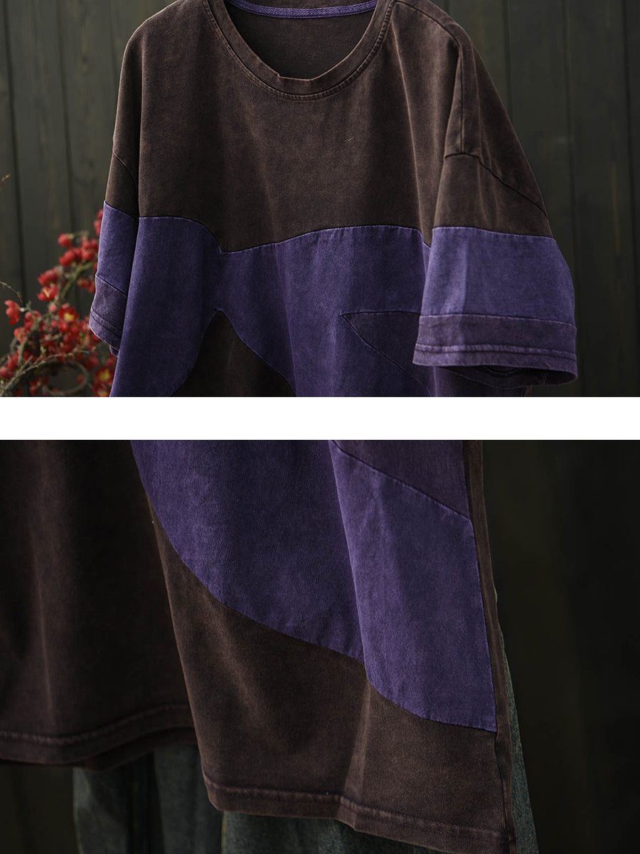 Women Summer Retro Patchwork O-Neck Cotton T-Shirt