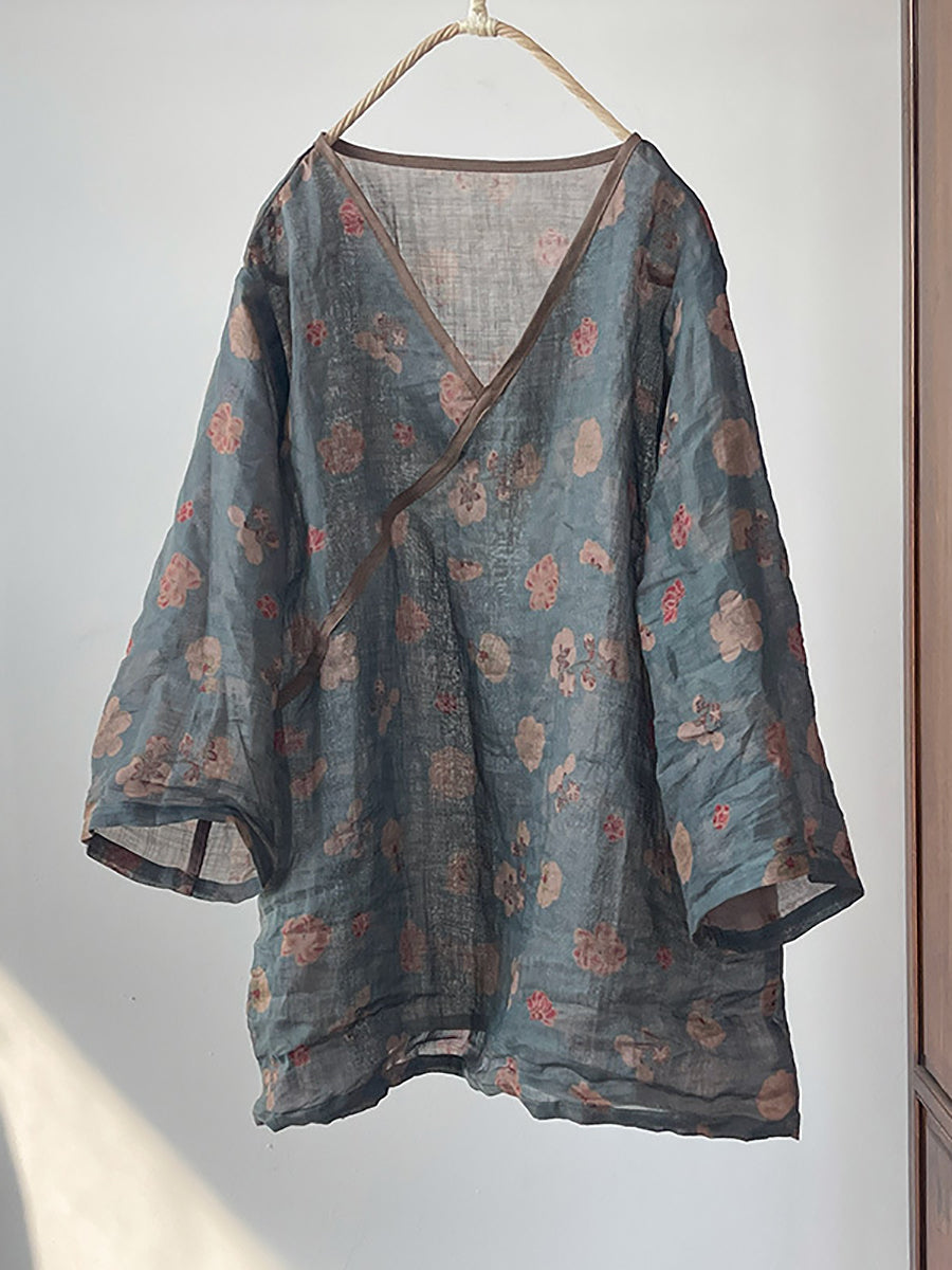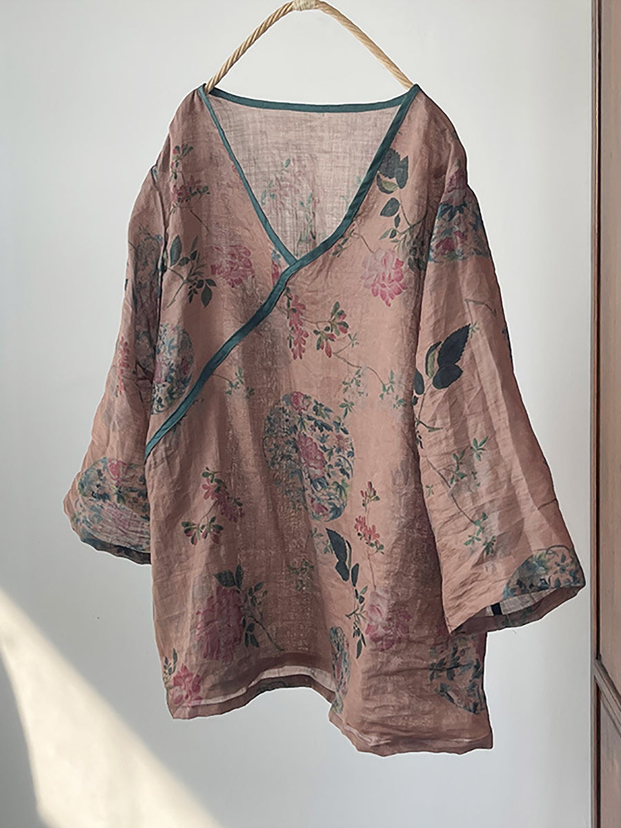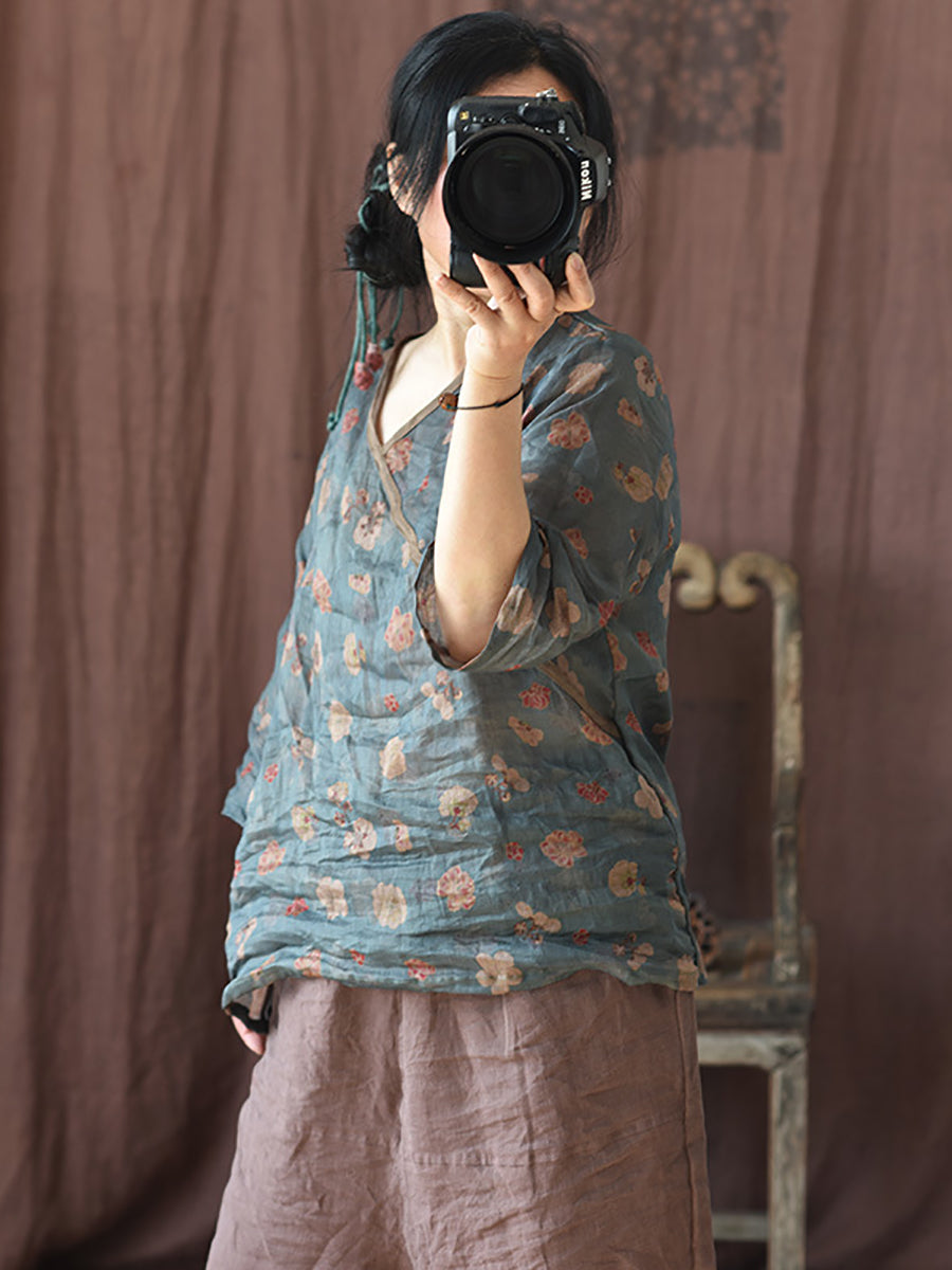Women Summer Vintage Floral V-Neck Ramie Shirt
