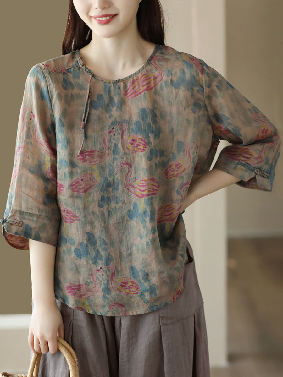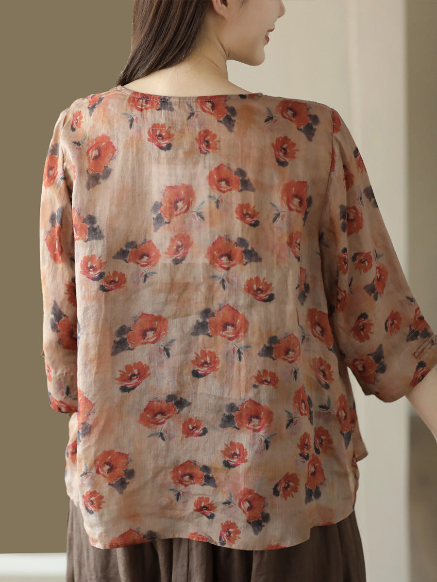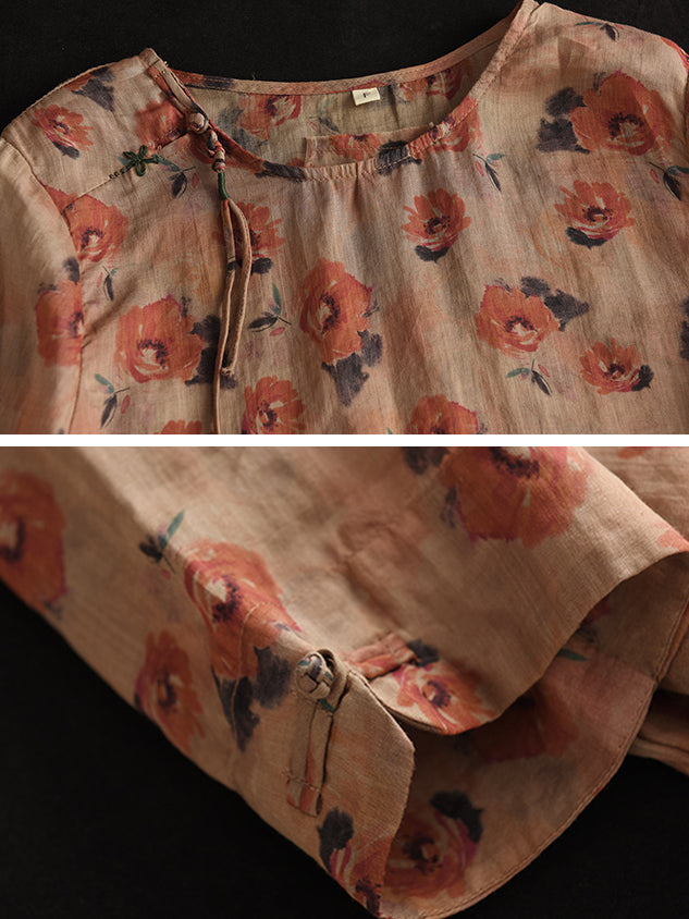 Women Vintage Summer Floral Frog Pullover Linen Shirt