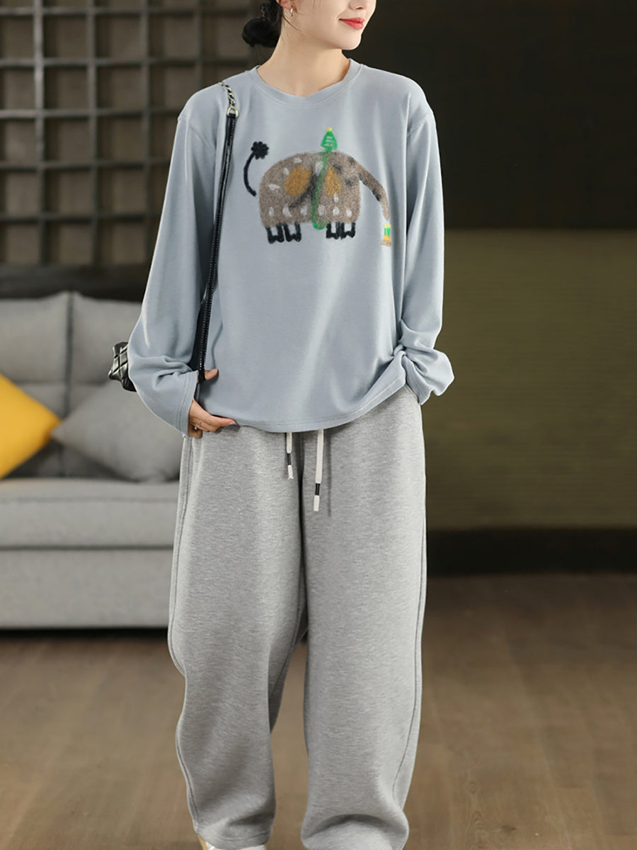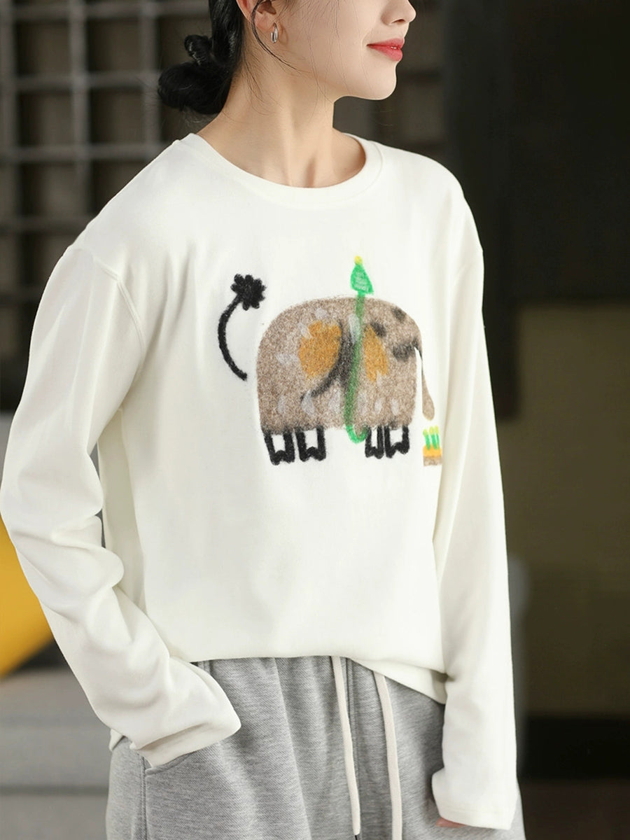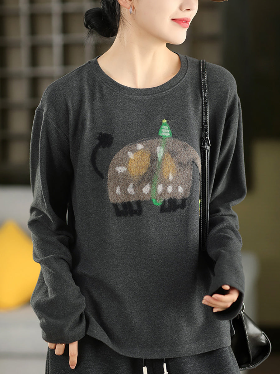 Women Winter Artsy Elephant Flocking O-Neck Blouse