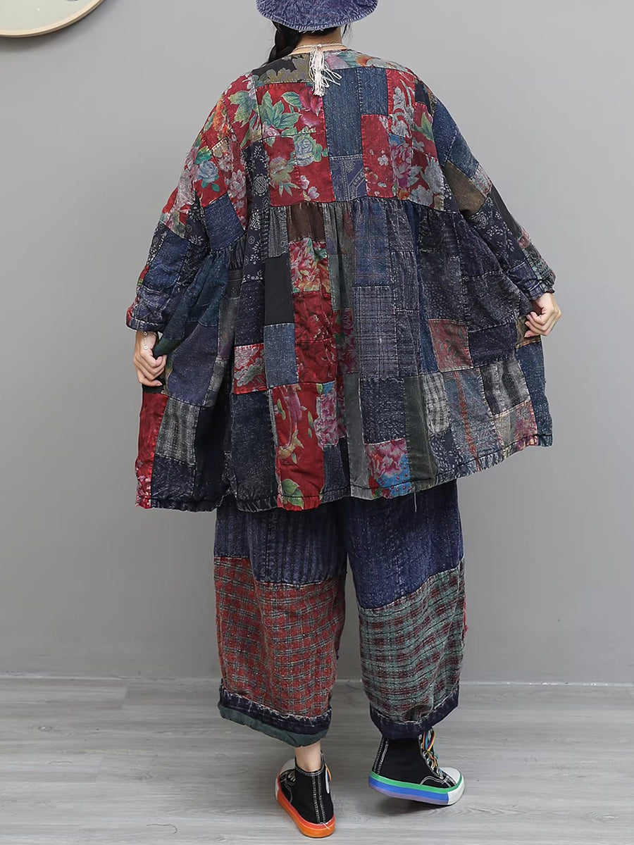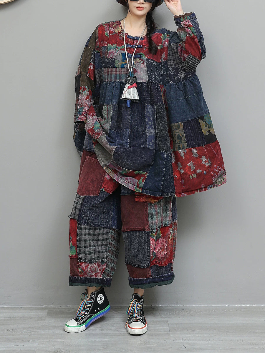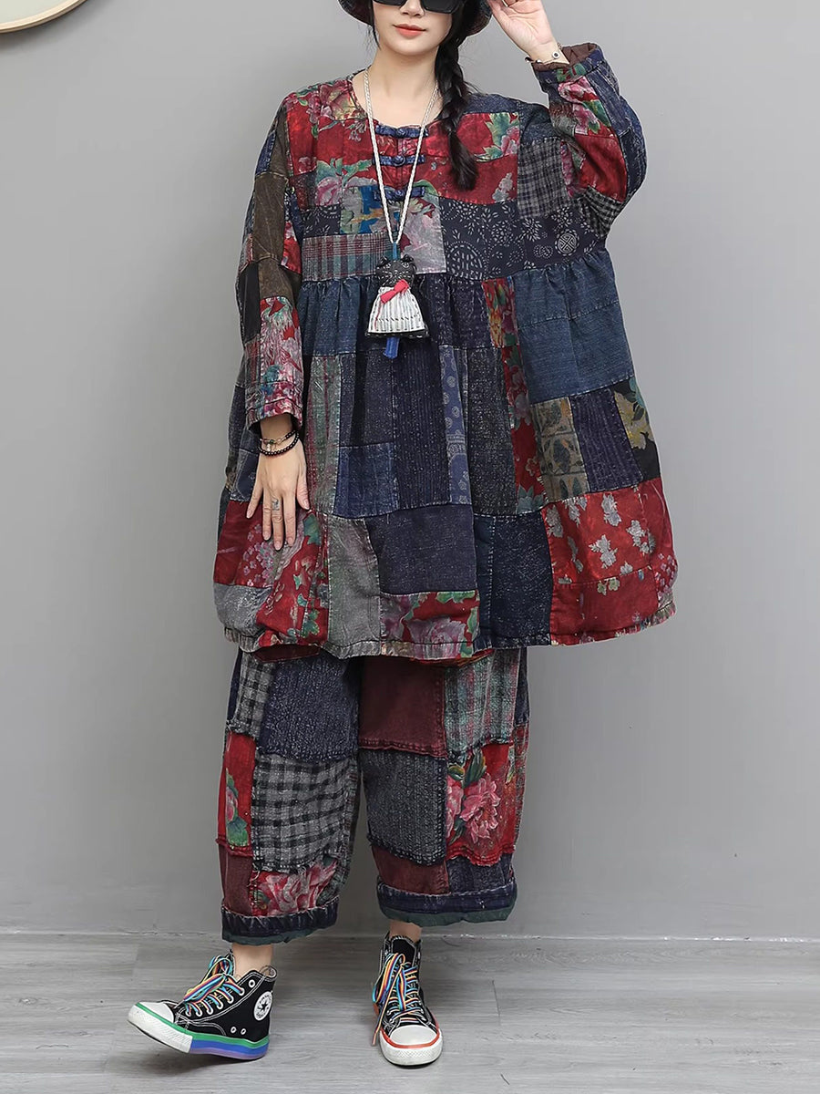 Women Winter Retro Patch Spliced O-Neck Padded Suits