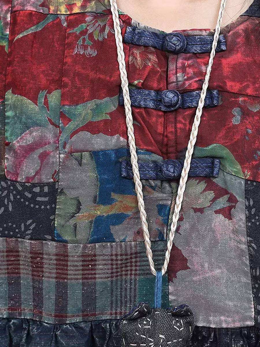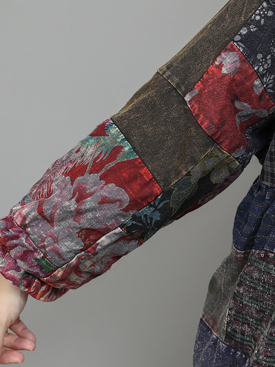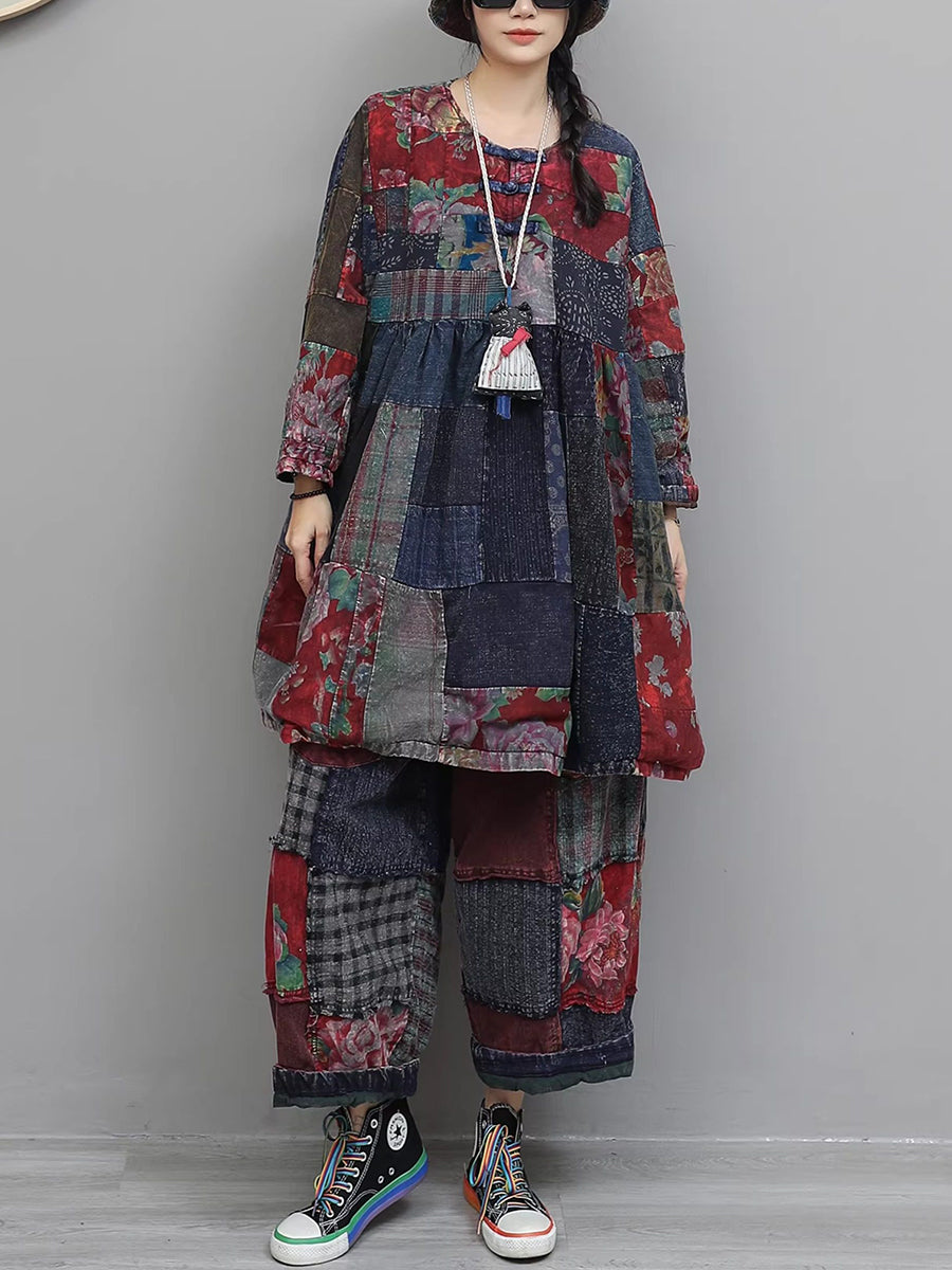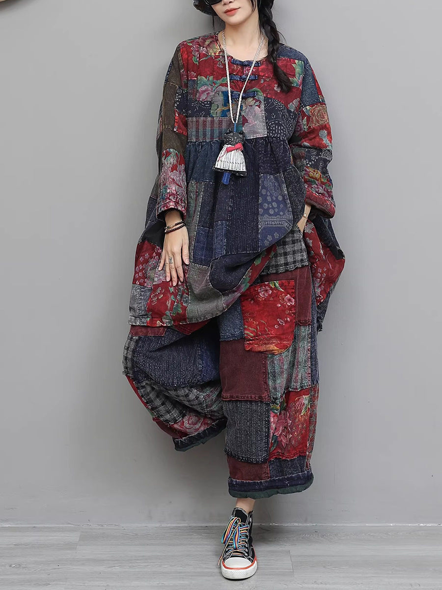Women Winter Retro Patch Spliced O-Neck Padded Suits