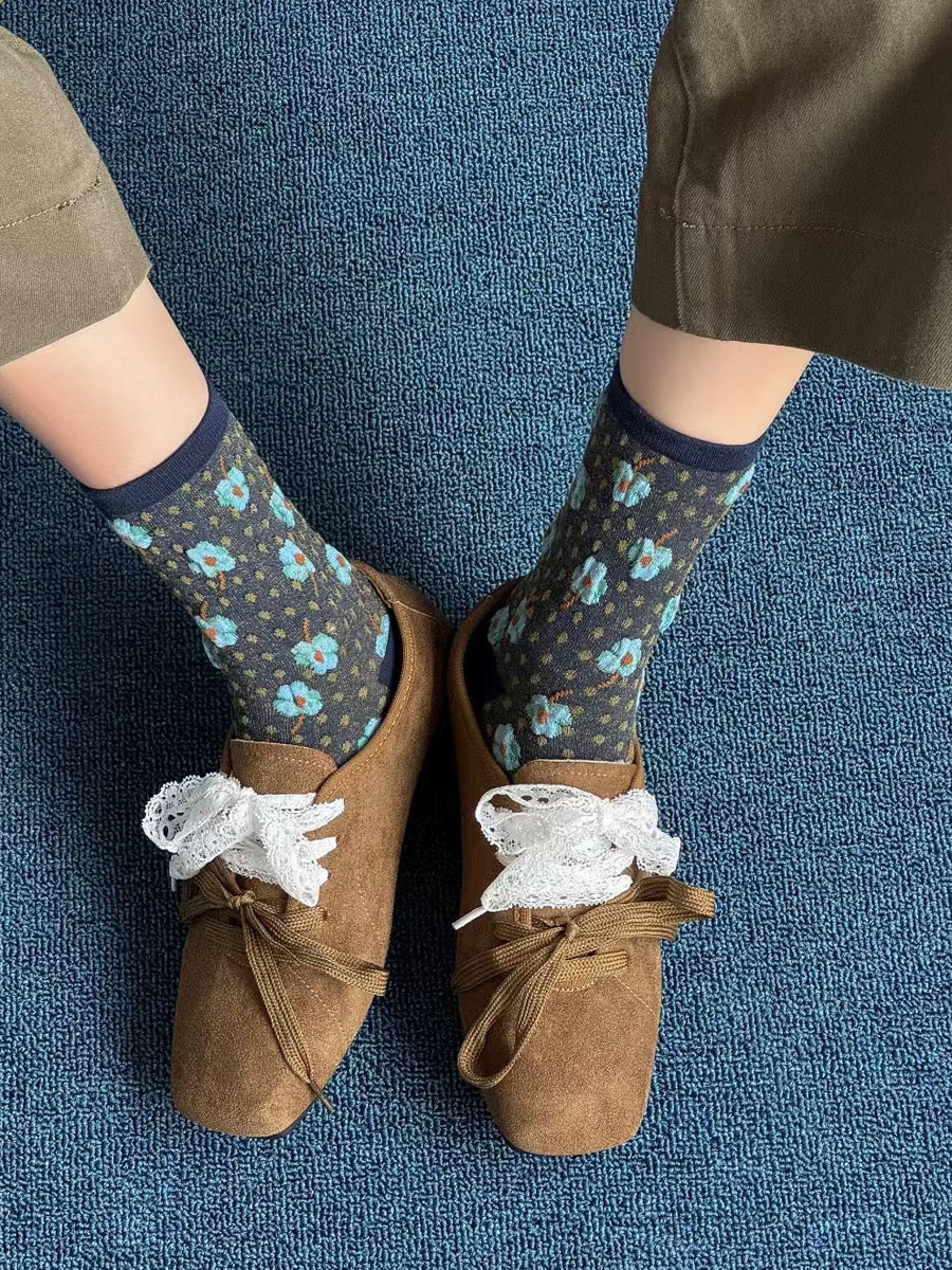 5 pares de calcetines de algodón con estampado floral artístico de otoño para mujer