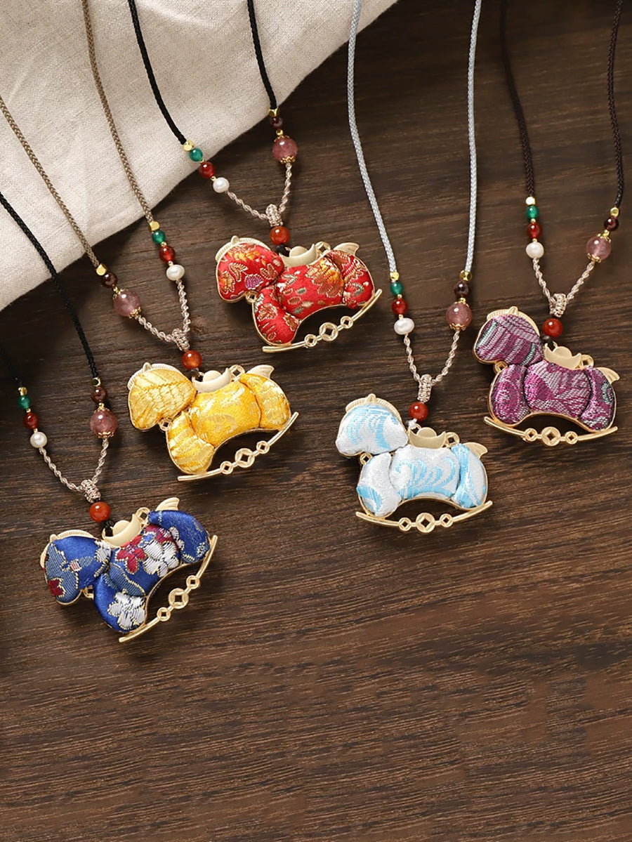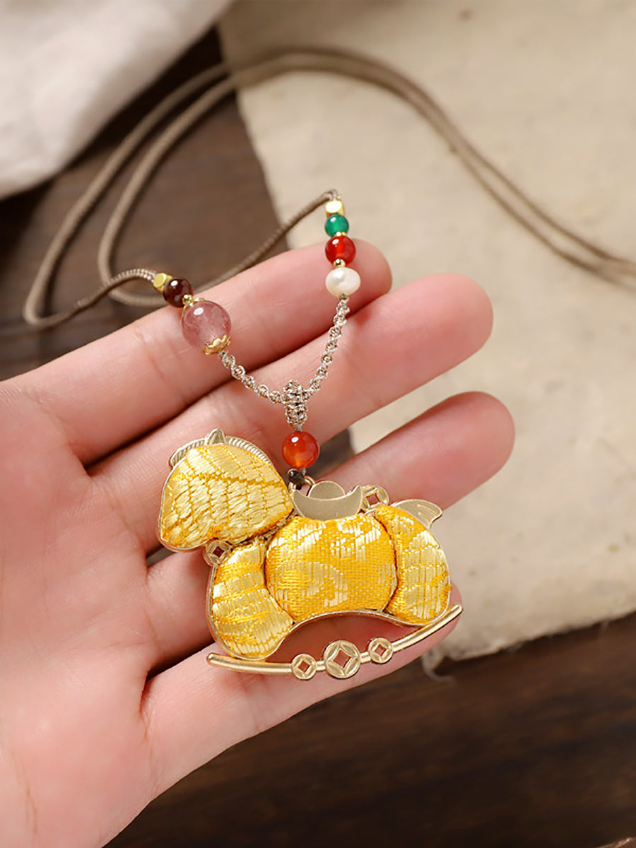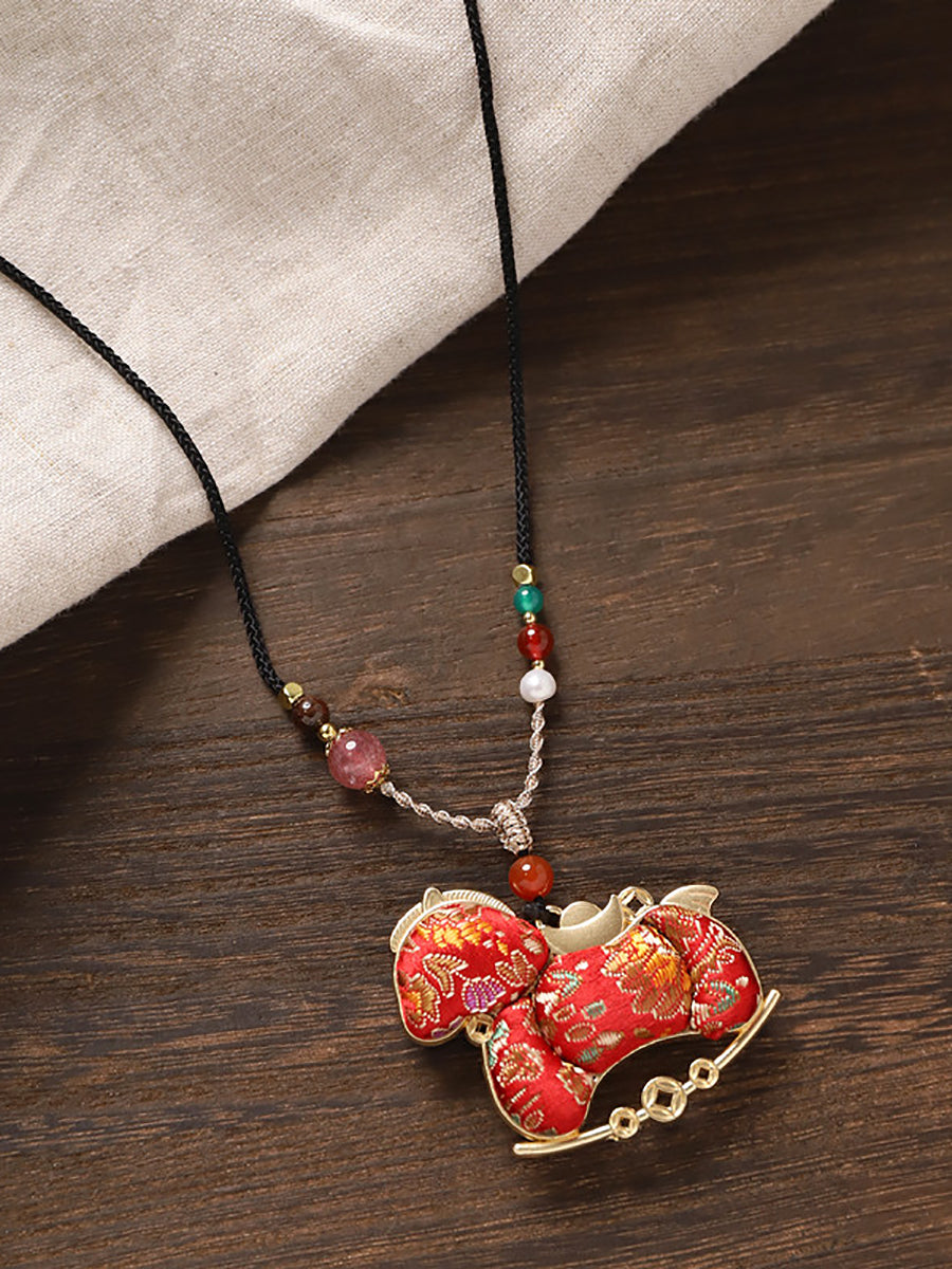 Collar largo étnico con colgante de caballo y brocado de doble cara