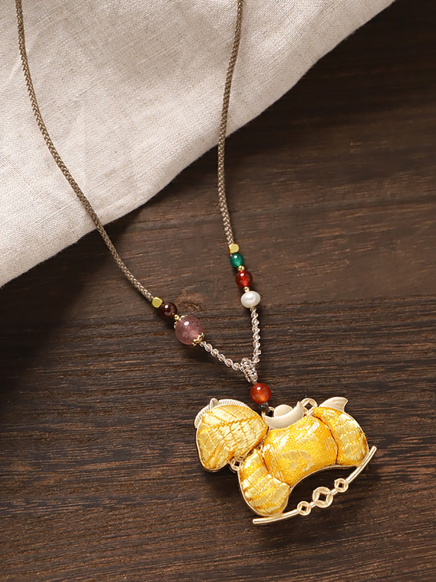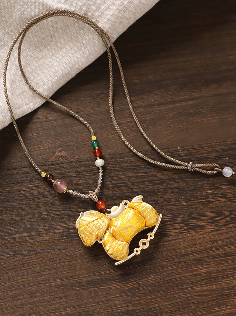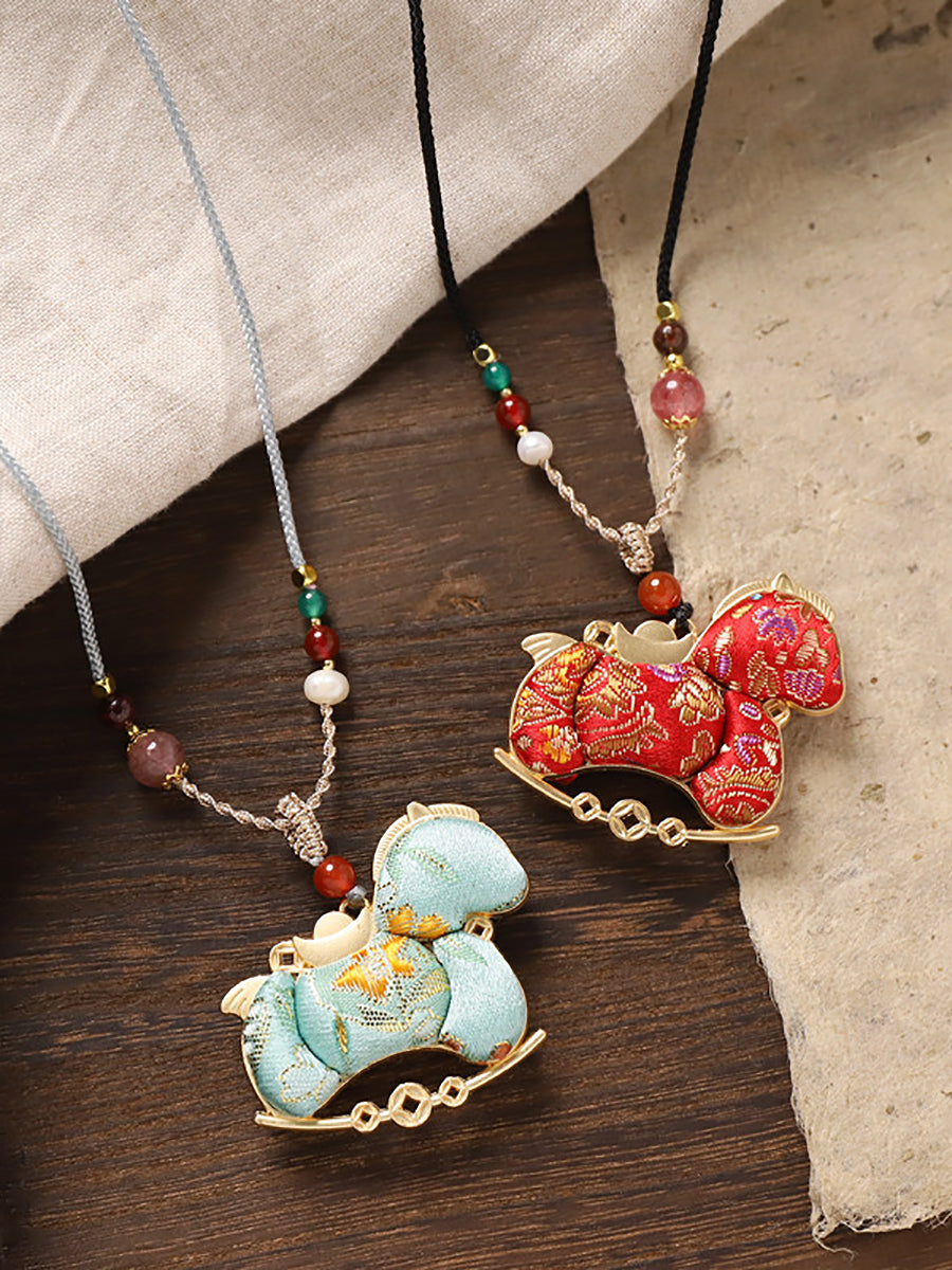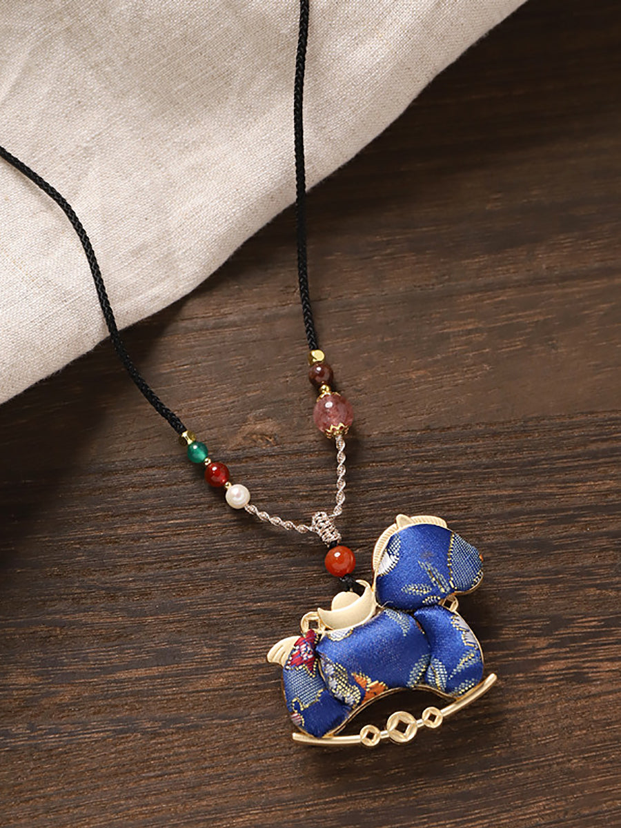 Collar largo étnico con colgante de caballo y brocado de doble cara