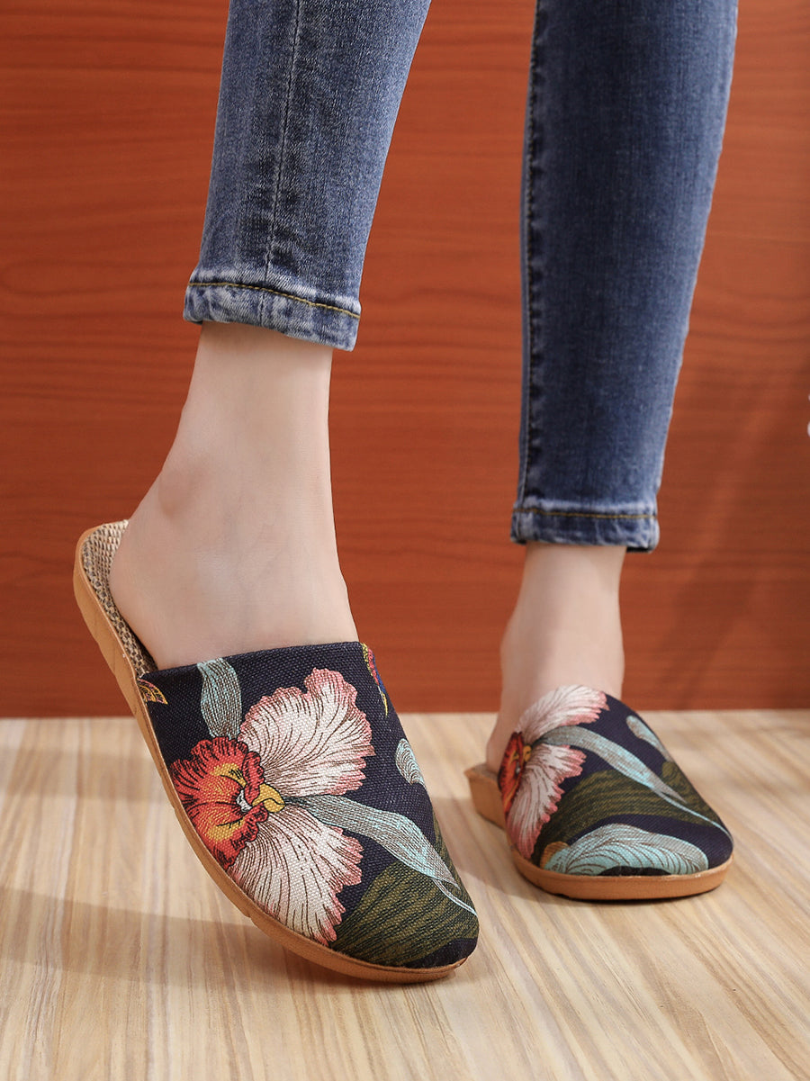 Pantuflas planas de lino con estampado floral vintage para interiores