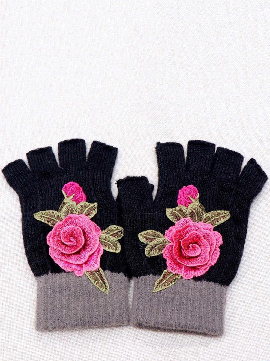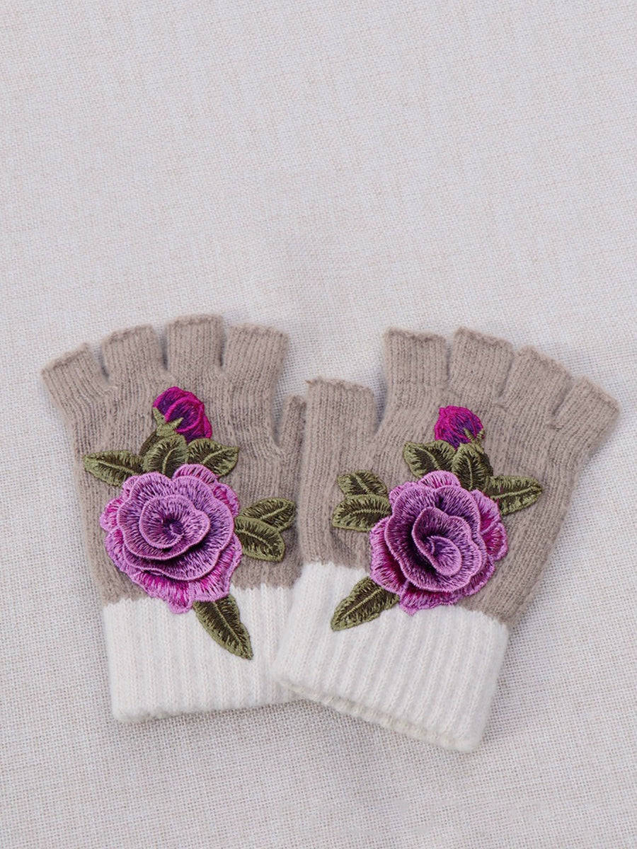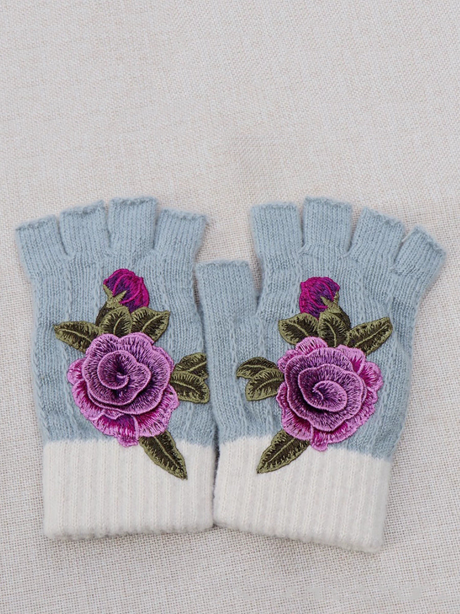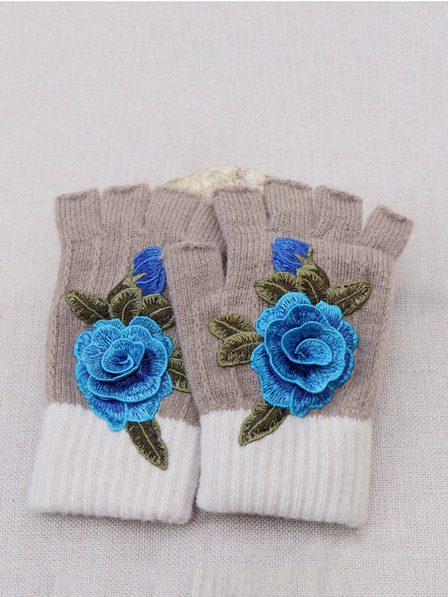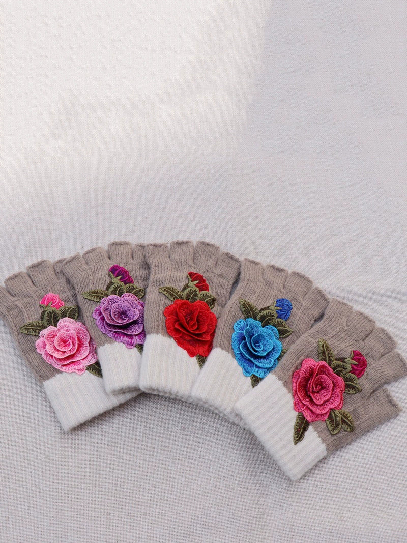 Guantes empalmados con bordado de flores artísticas de invierno
