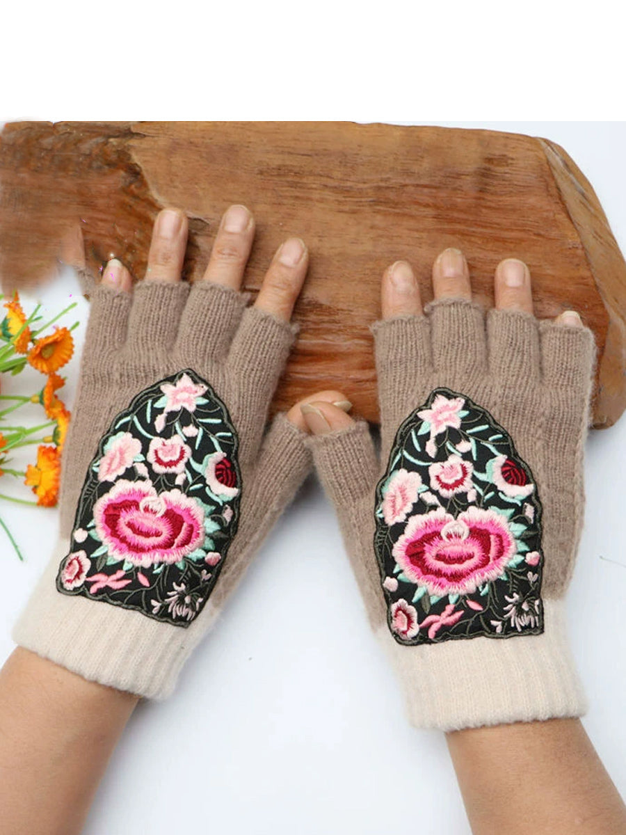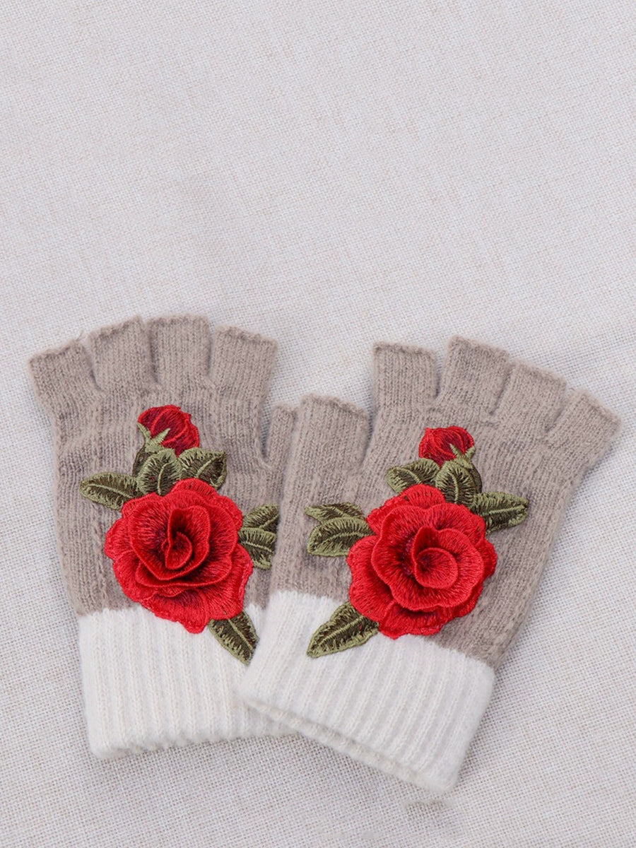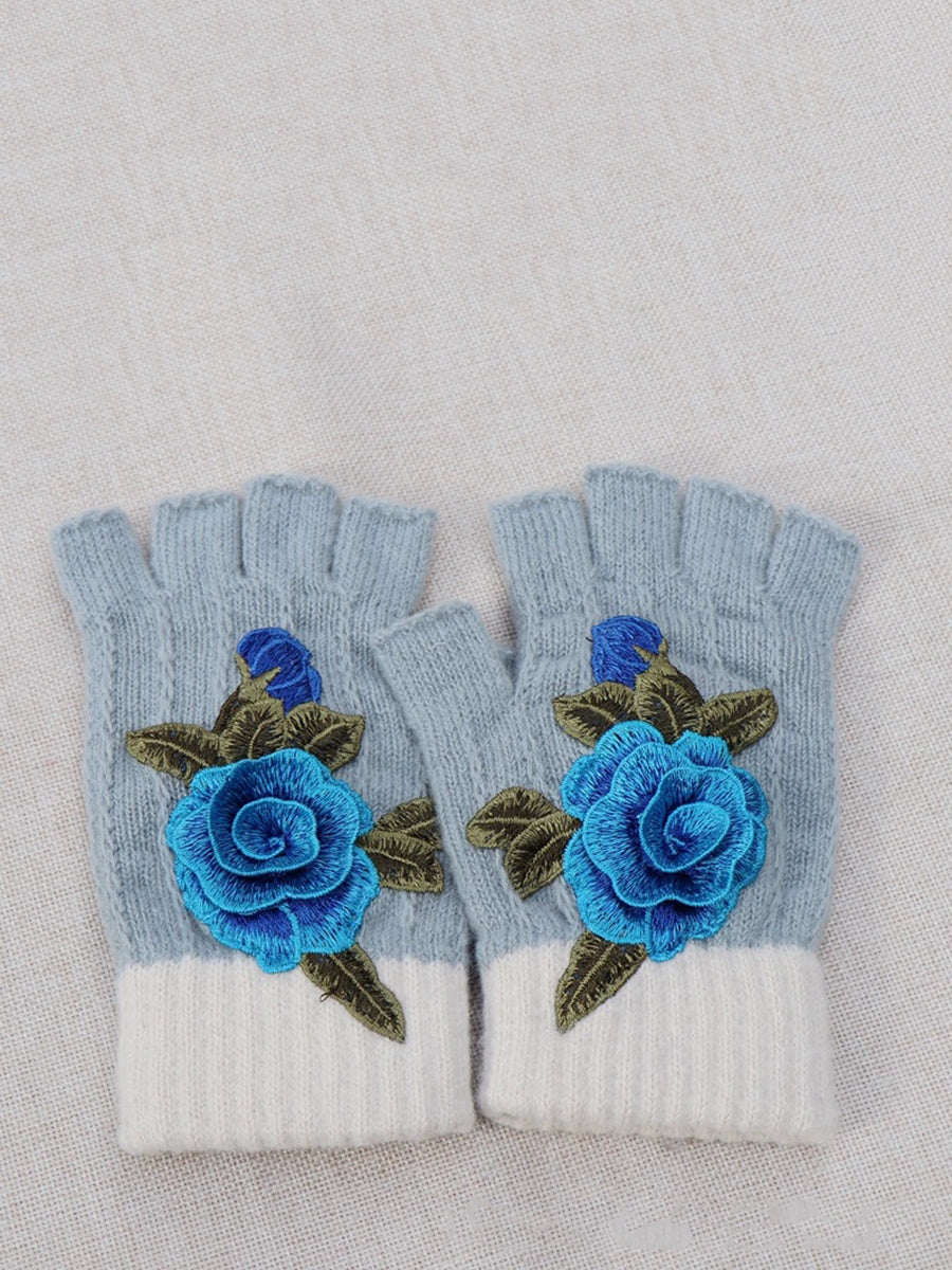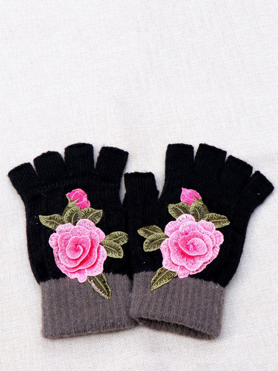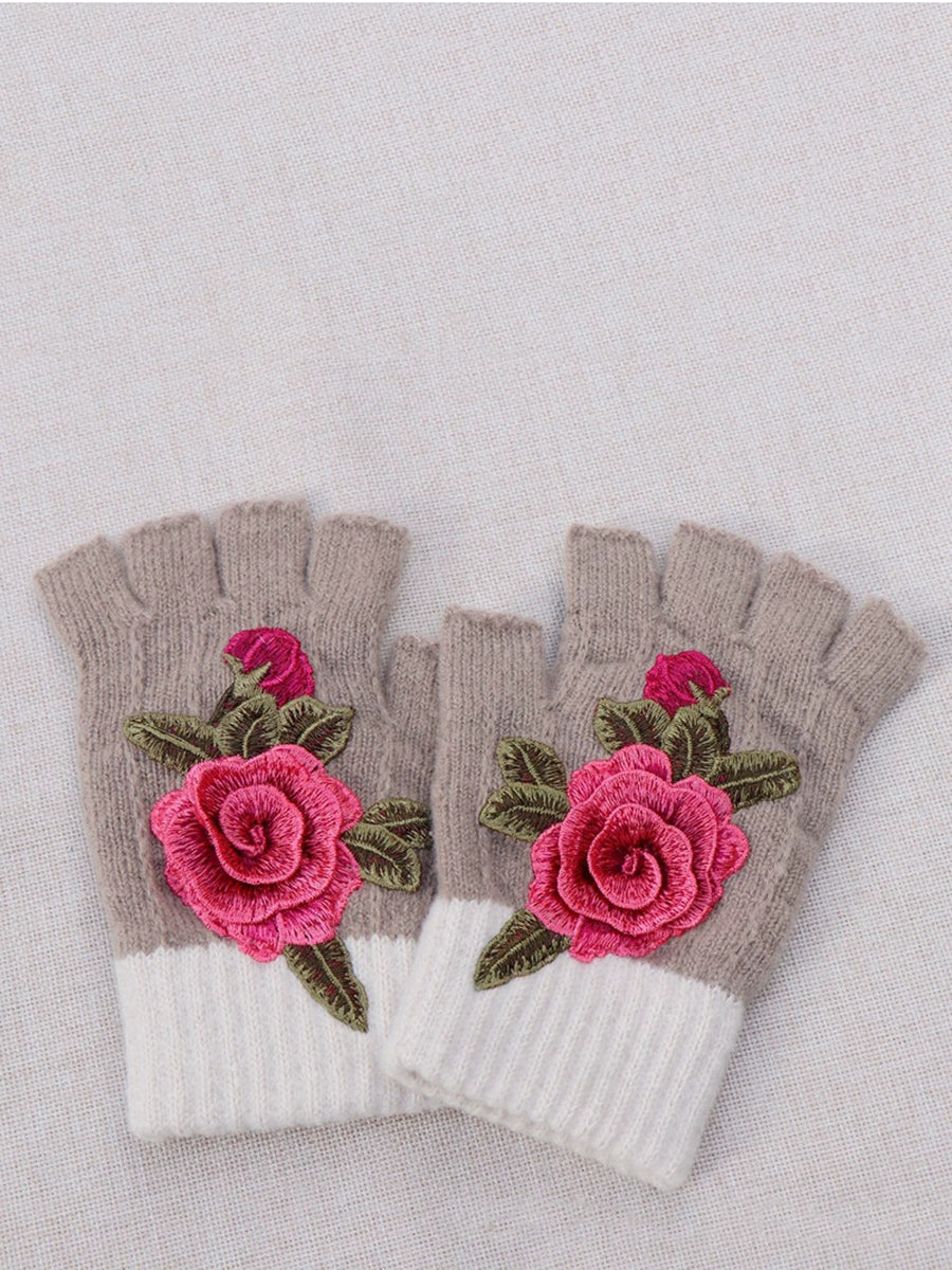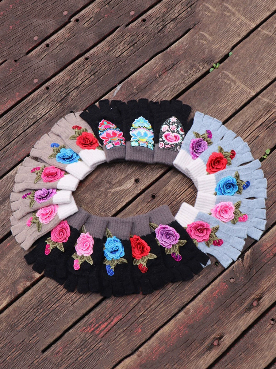 Guantes empalmados con bordado de flores artísticas de invierno