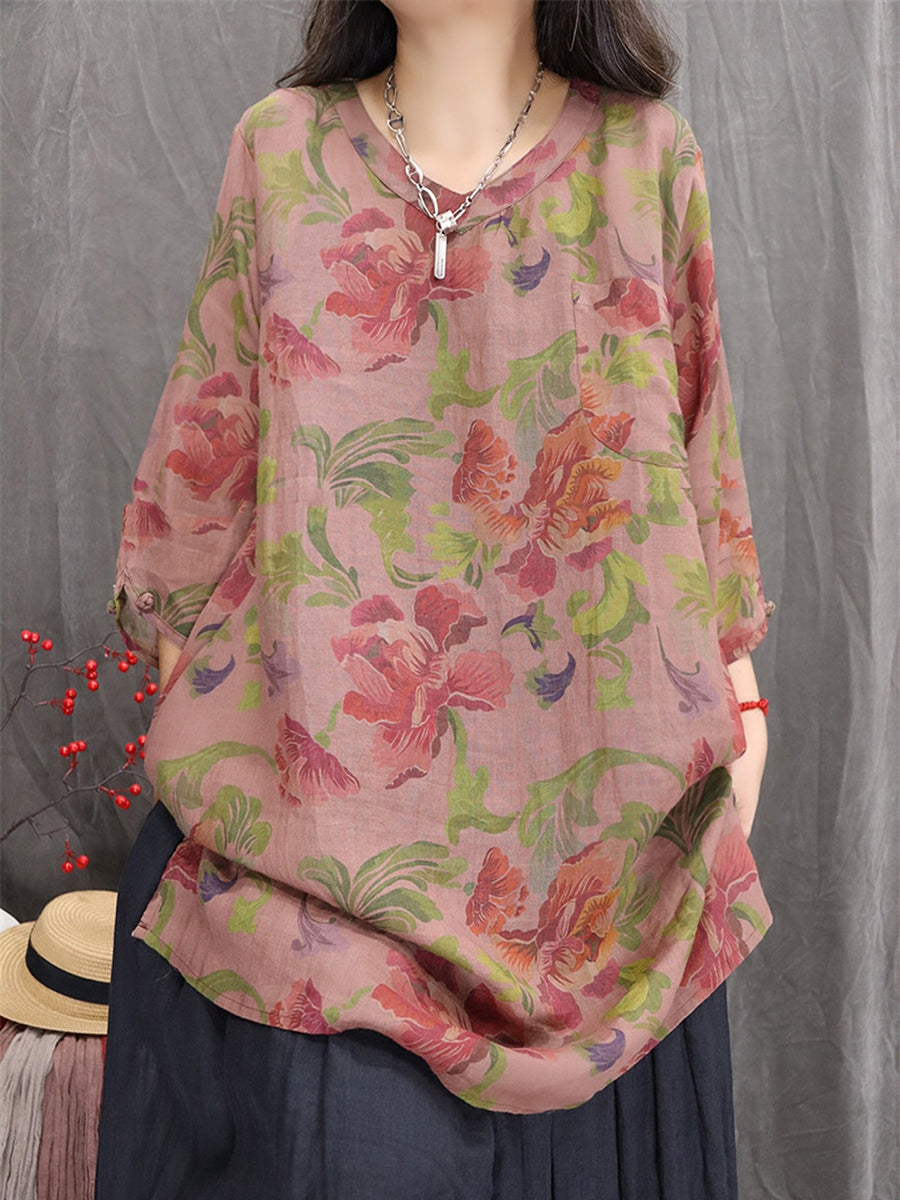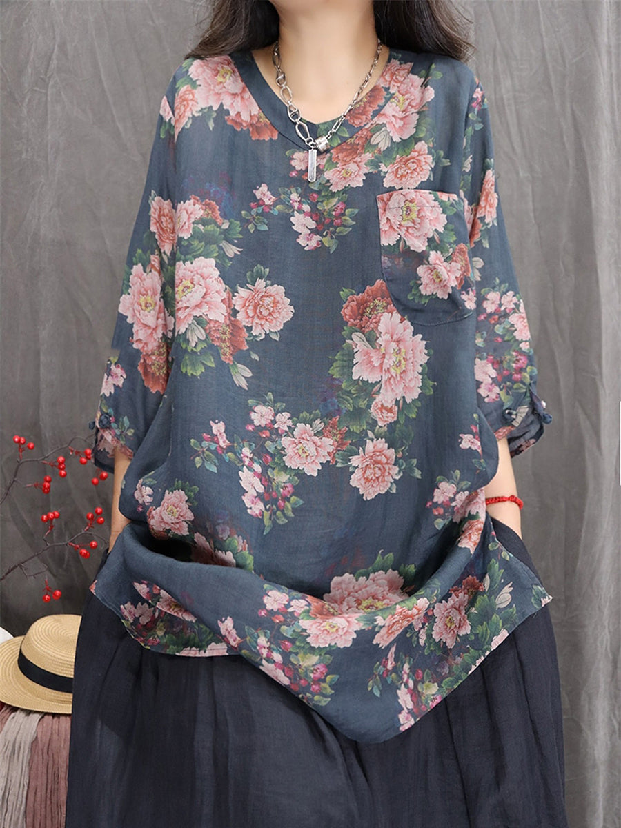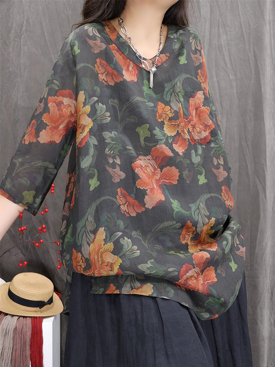 Blusa de mujer con escote en V y flores primaverales artísticas de 100 % ramio