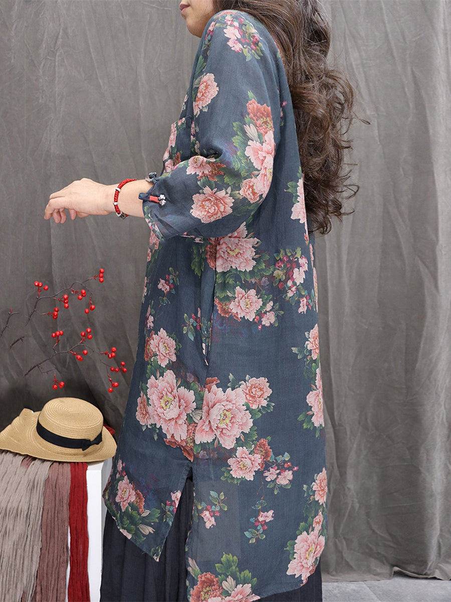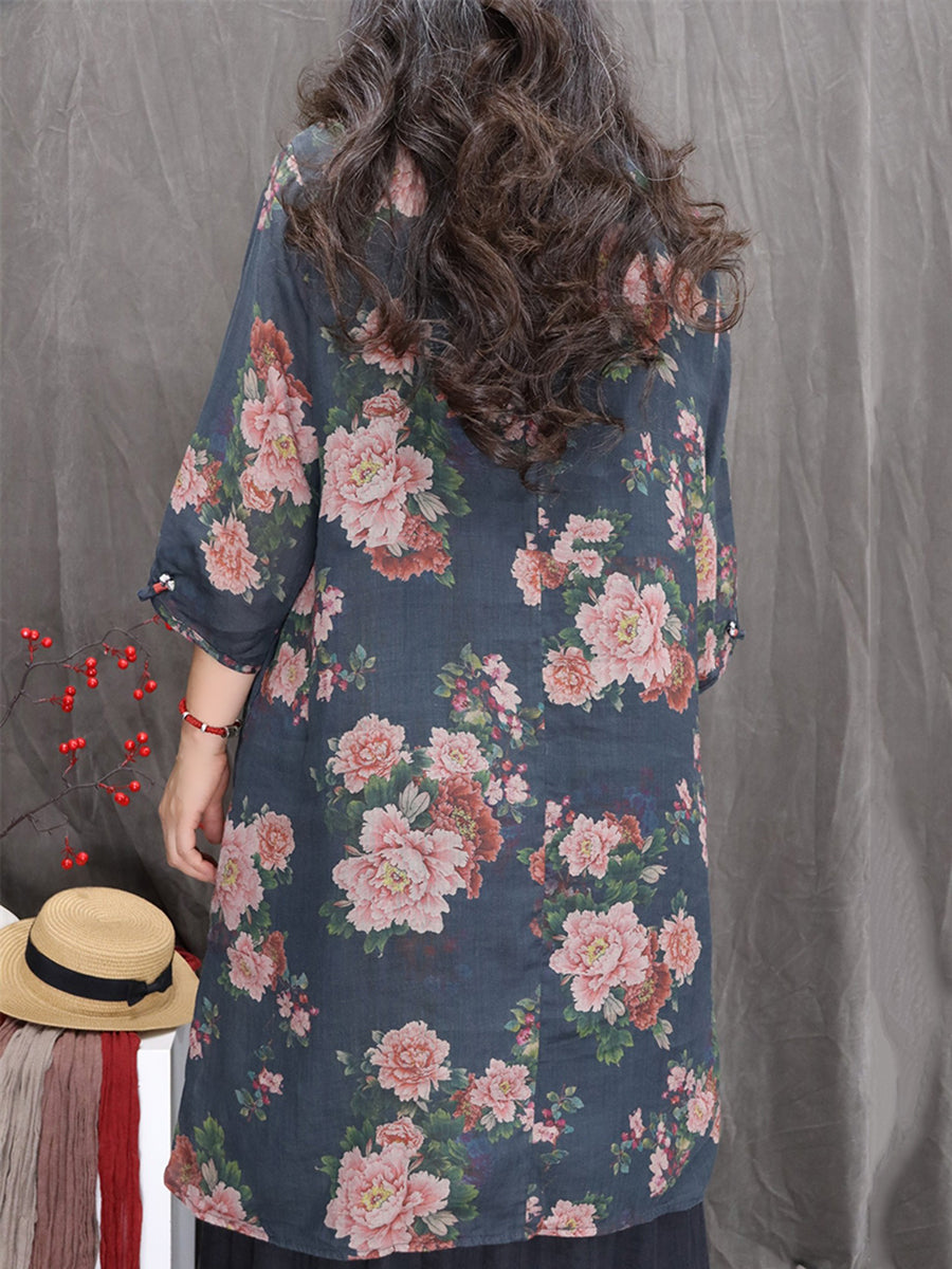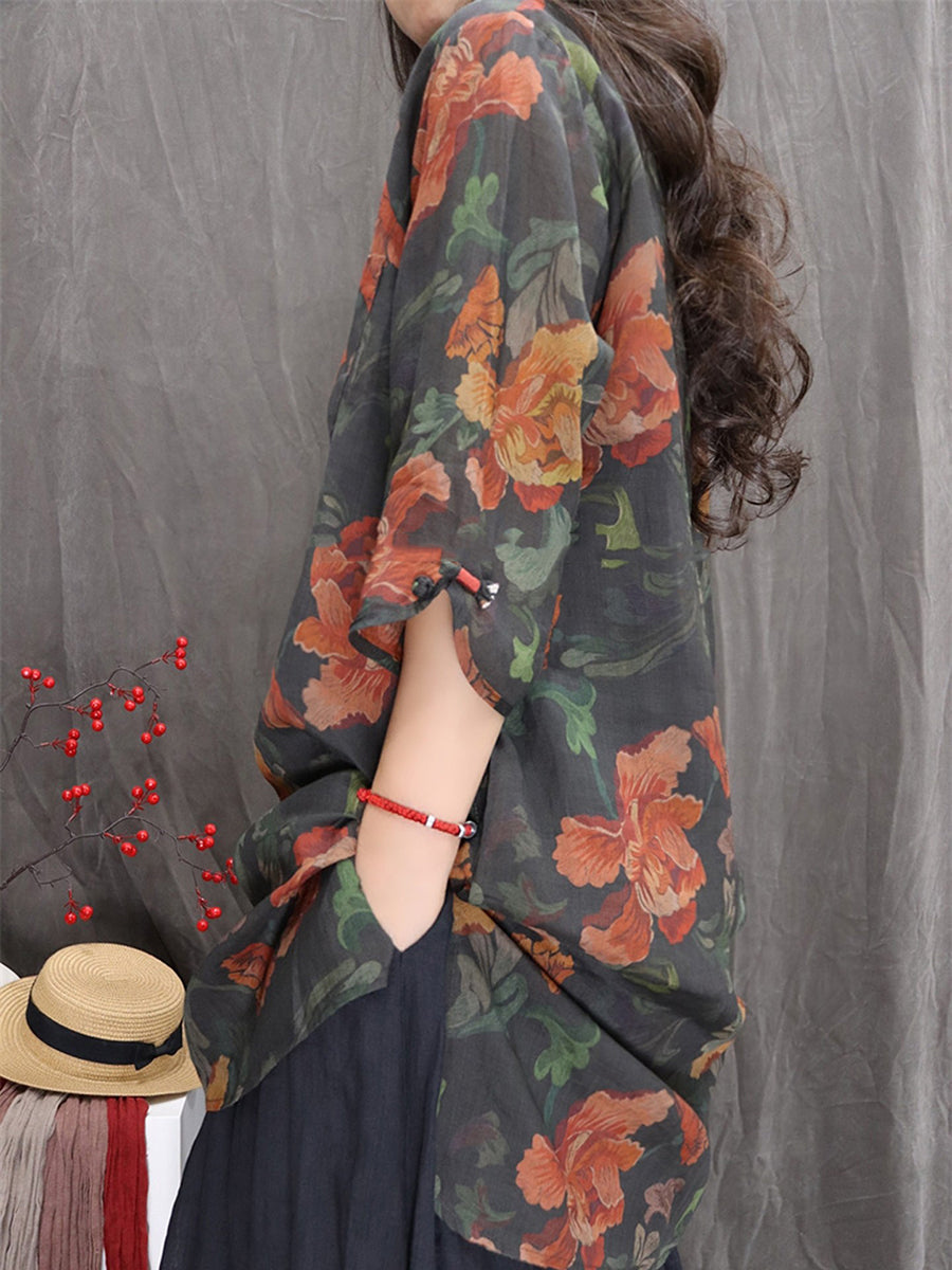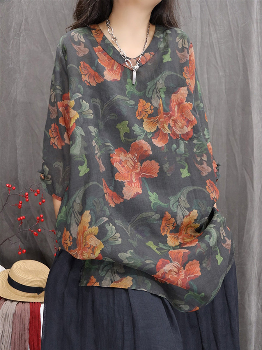 Blusa de mujer con escote en V y flores primaverales artísticas de 100 % ramio