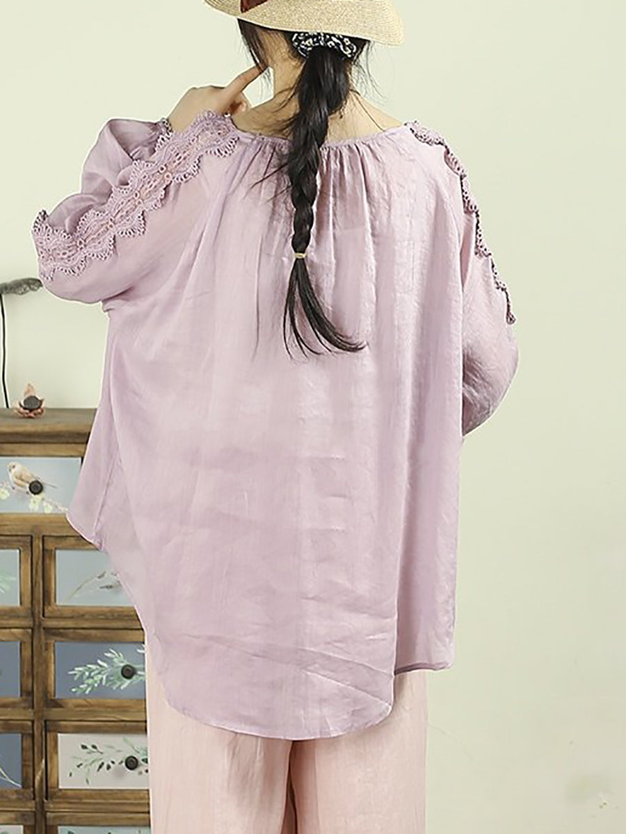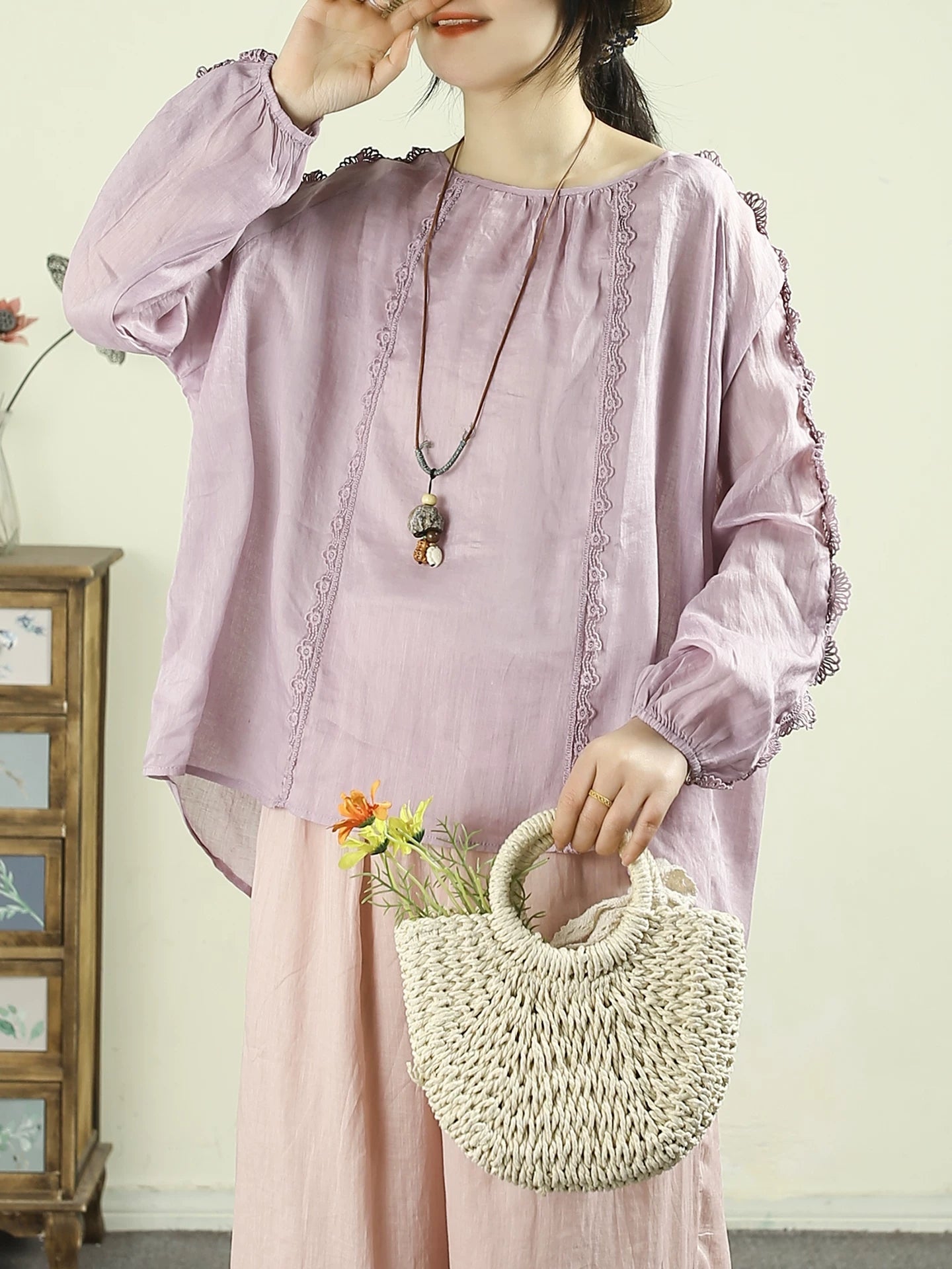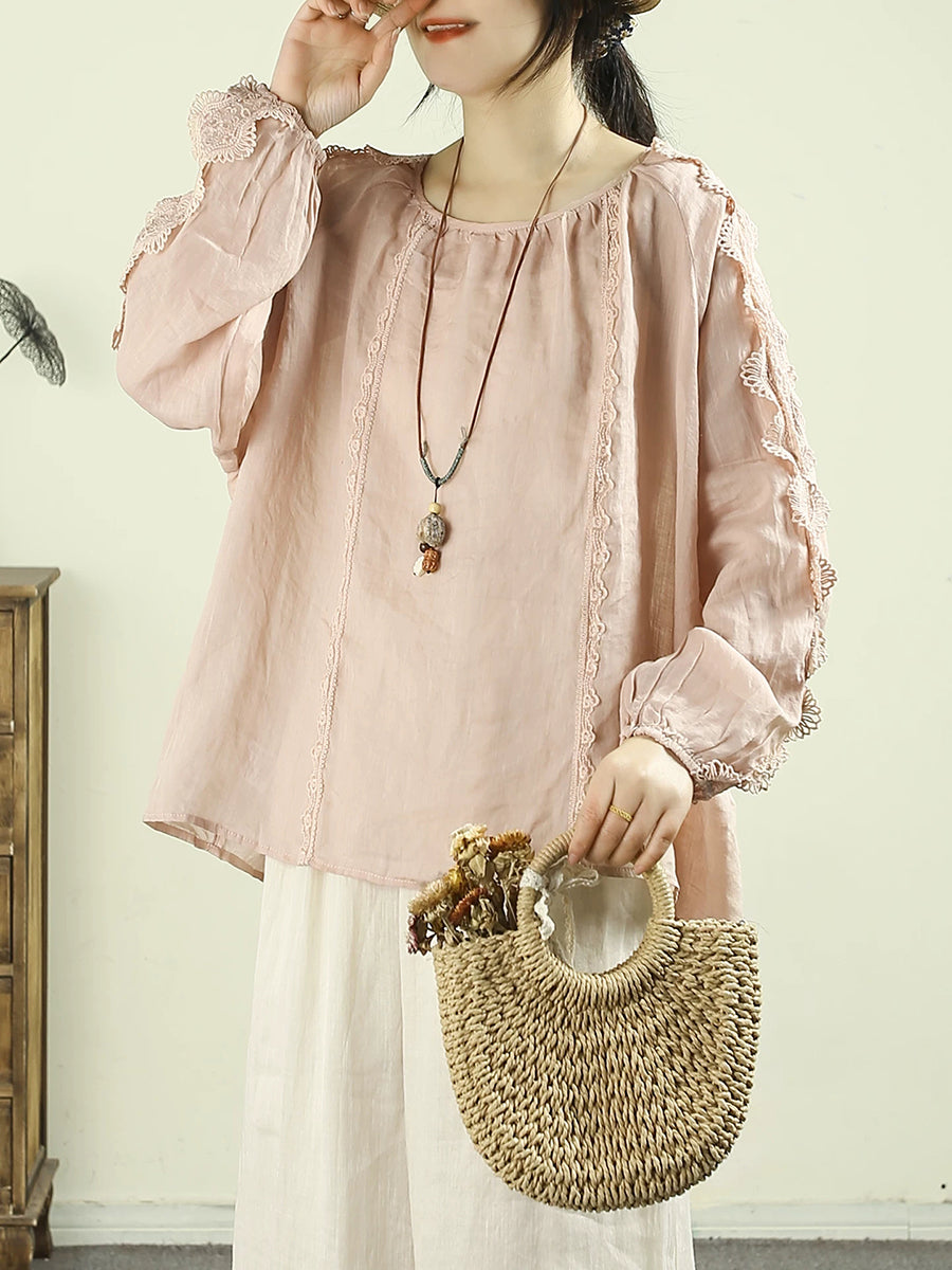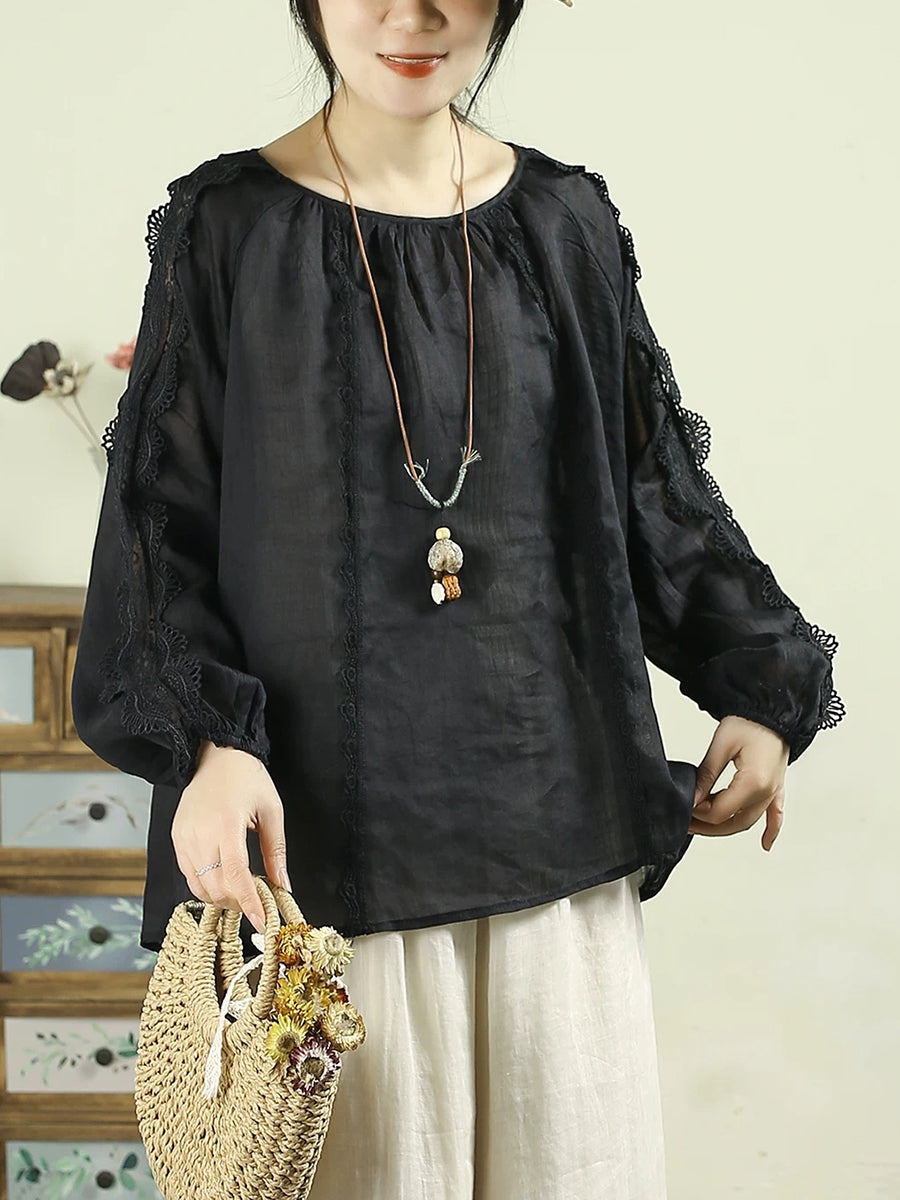 Camisa de mujer Artsy Spring con cuello redondo y encaje empalmado, 100 % ramio