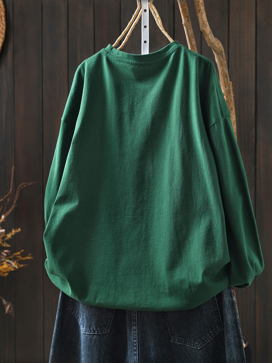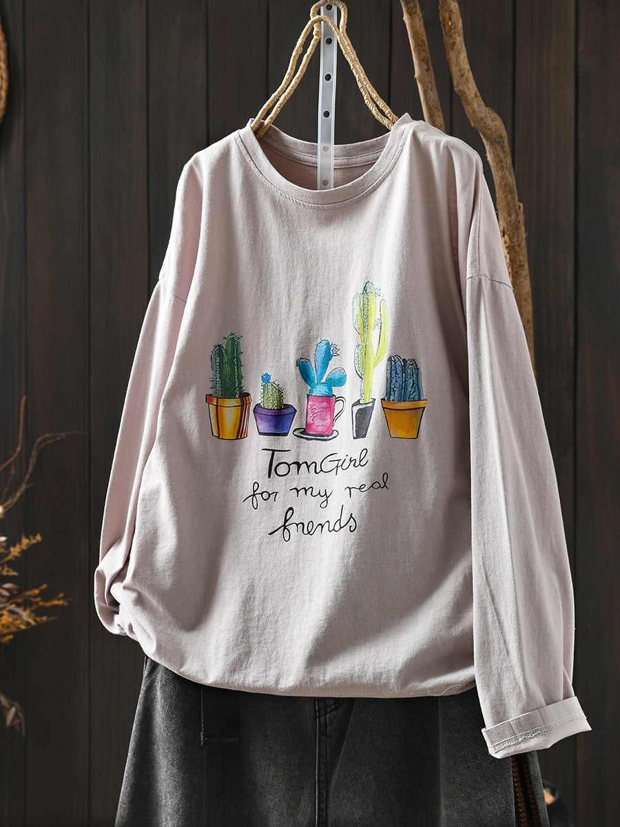 Blusa de algodón con cuello redondo y estampado de plantas en maceta de primavera para mujer