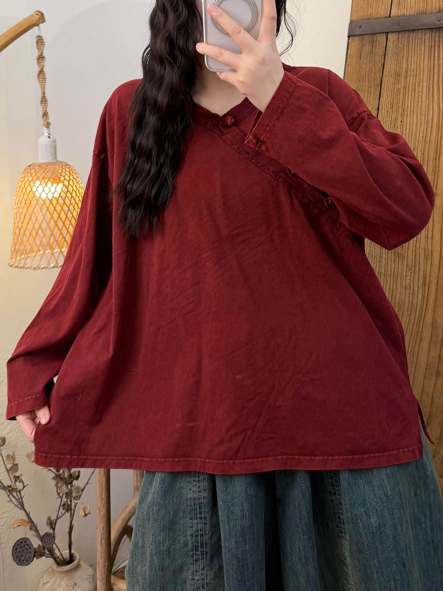 Blusa de algodón con cuello en V vintage de primavera para mujer