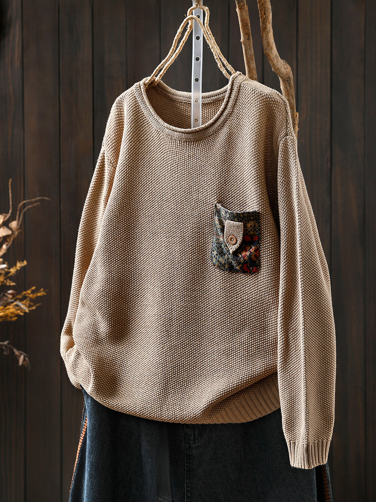 Suéter de punto con cuello redondo y bolsillo de parche artístico de otoño para mujer