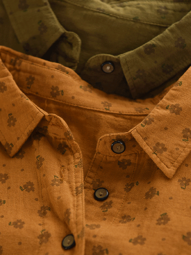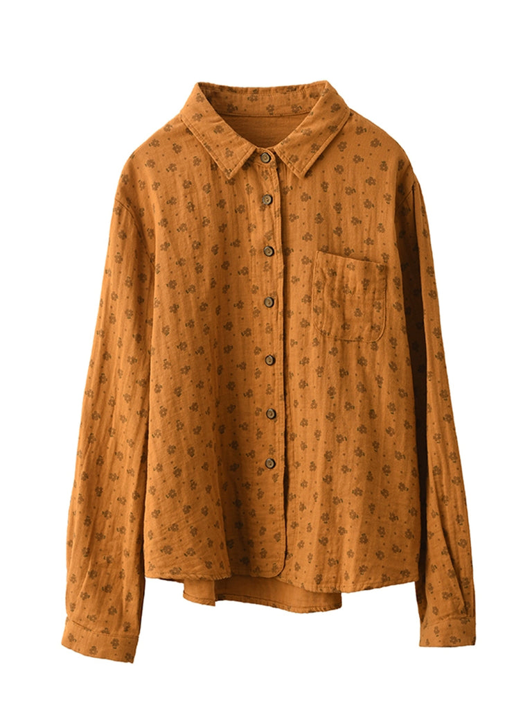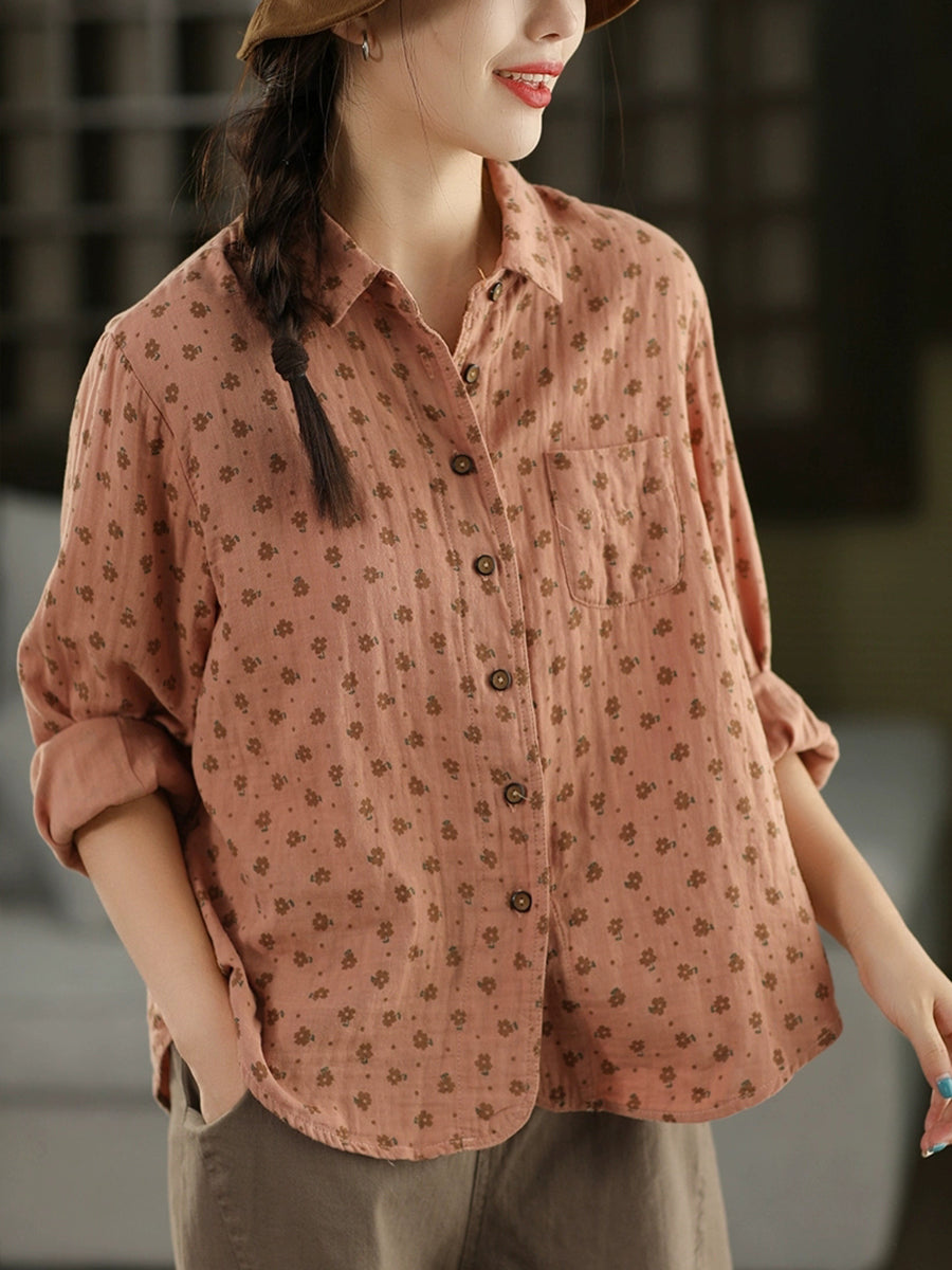 Camisa de cuello vuelto 100 % algodón con estampado floral vintage de otoño para mujer