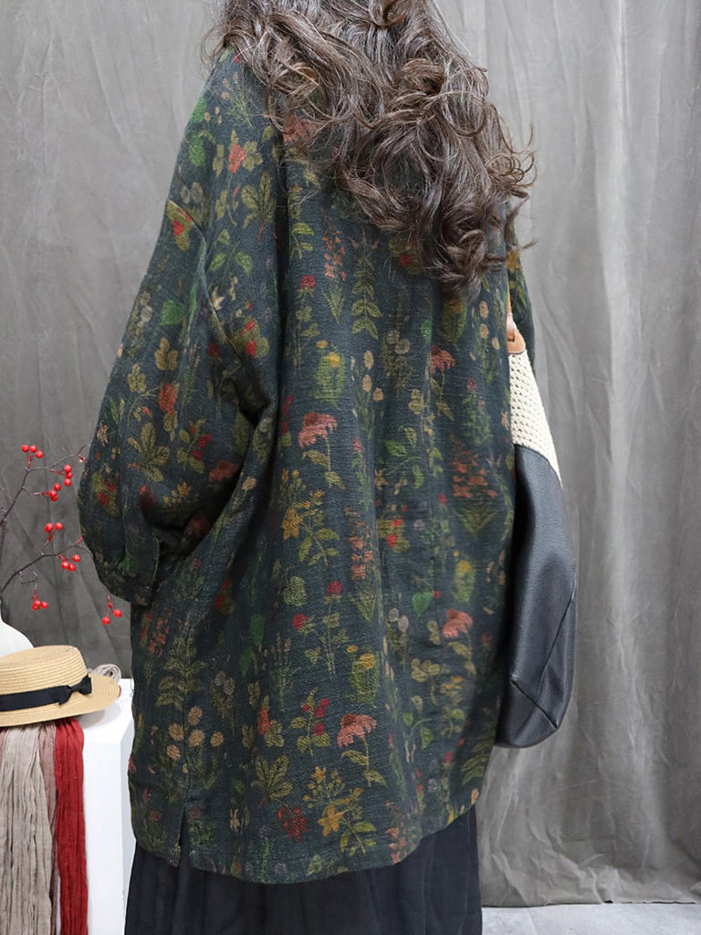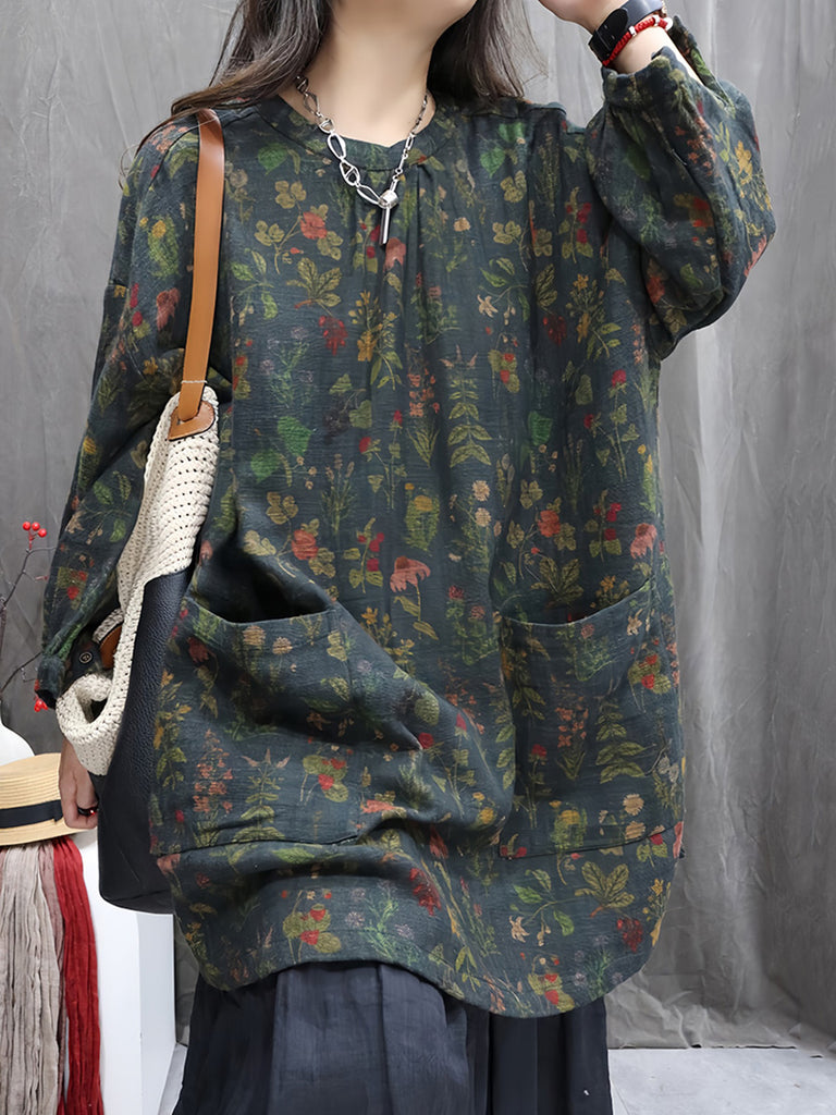 Camisa de lino con cuello redondo y flores vintage de otoño para mujer