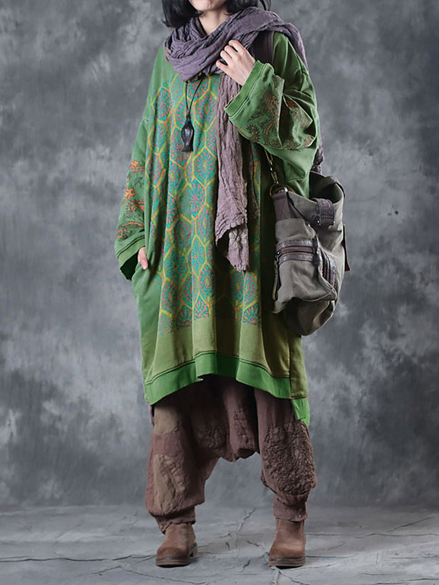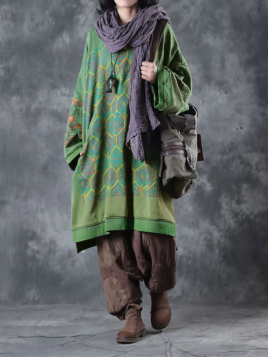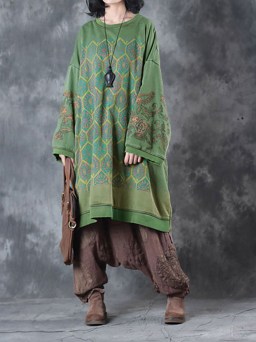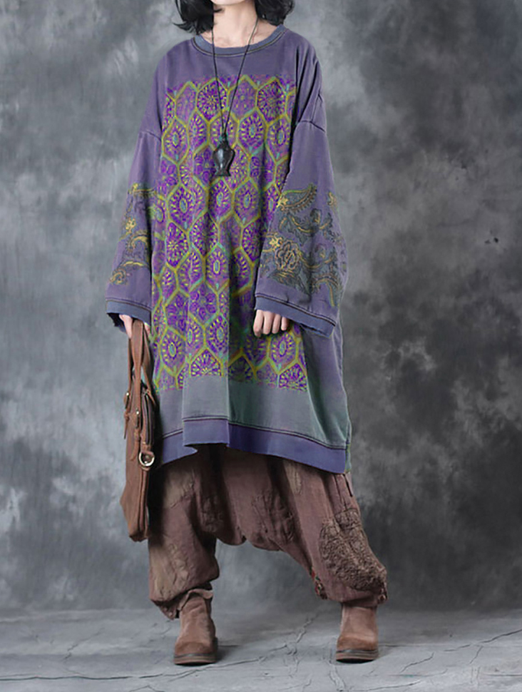 Este vestido está confeccionado en algodón y presenta un estampado de flores. Tiene cuello redondo, mangas raglán largas y un estilo vintage que es perfecto tanto para otoño como para primavera.