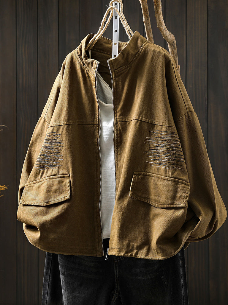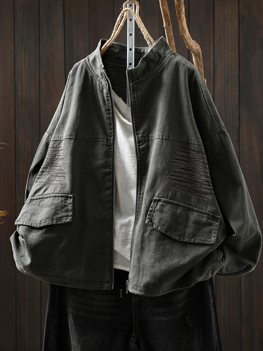 Camisa informal de mujer, color puro, cuello alto, bordado, 100 % algodón