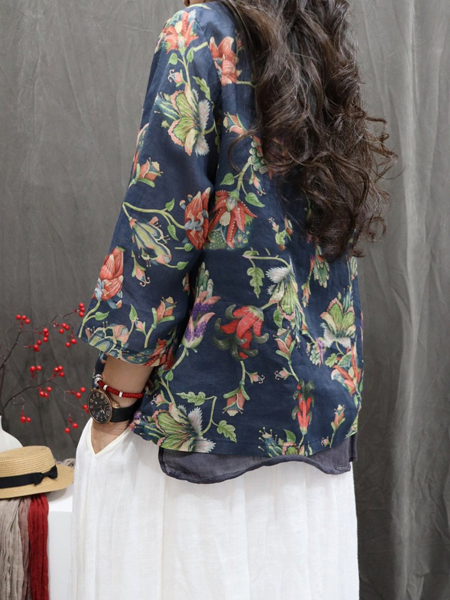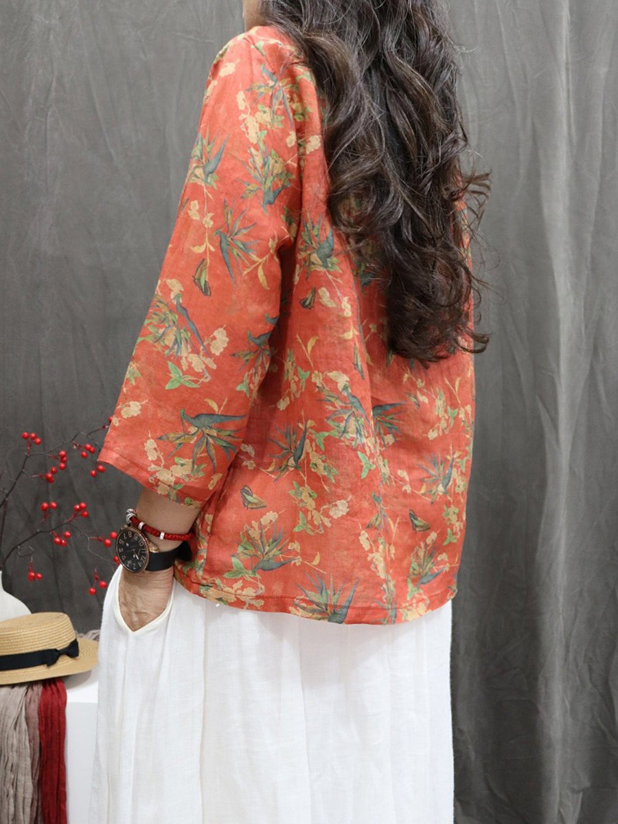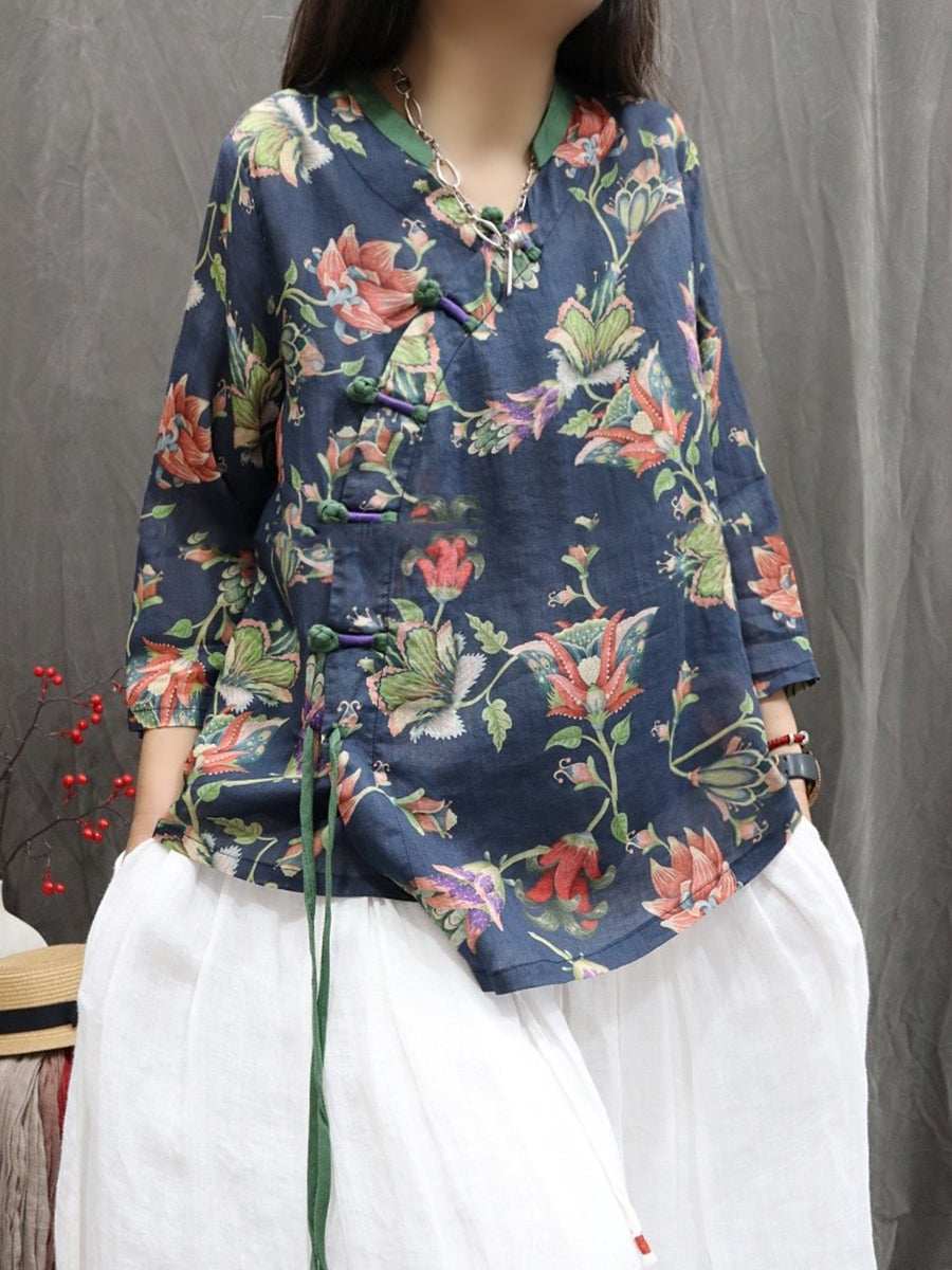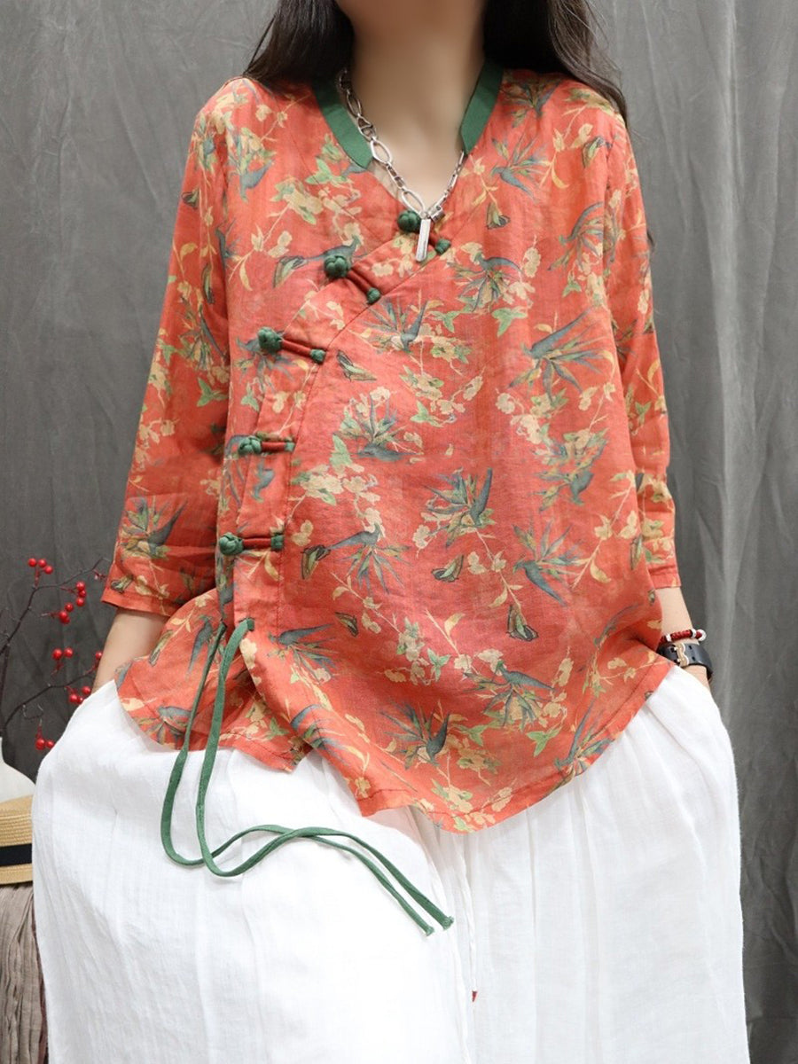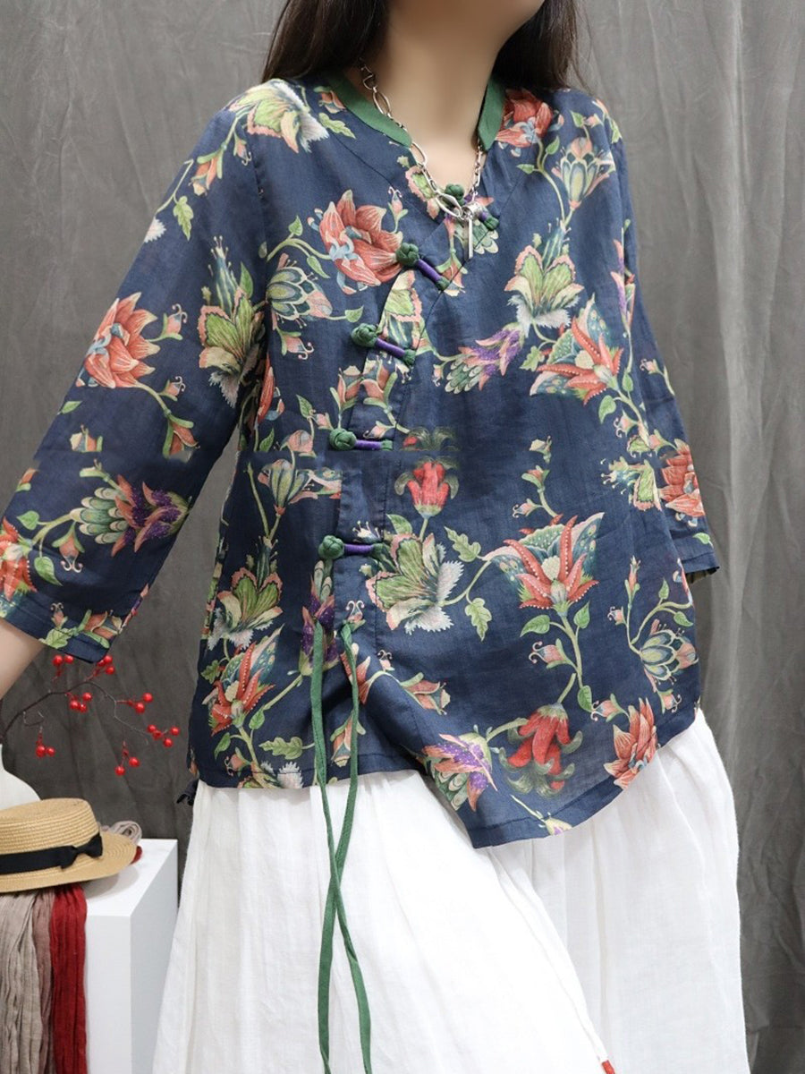 Camisa étnica de primavera para mujer, cuello en V, 100 % ramio
