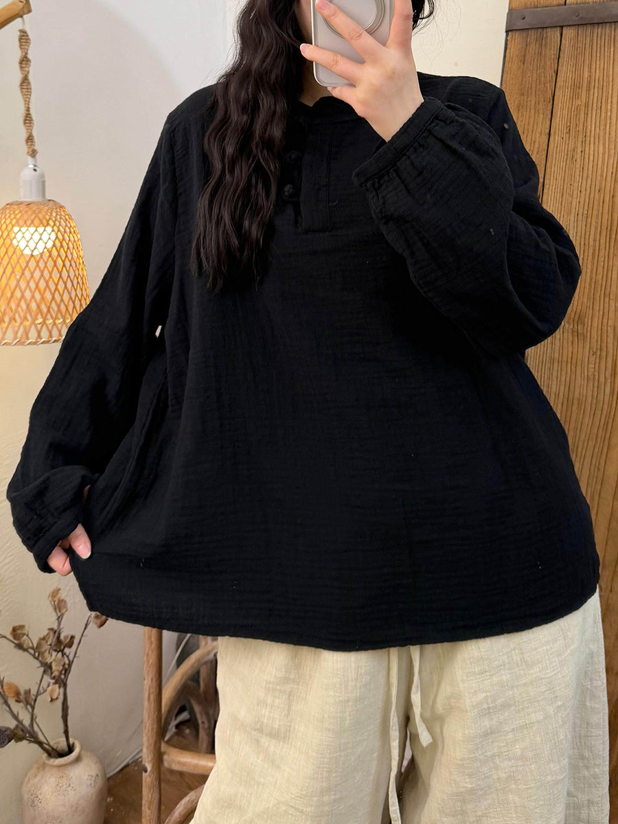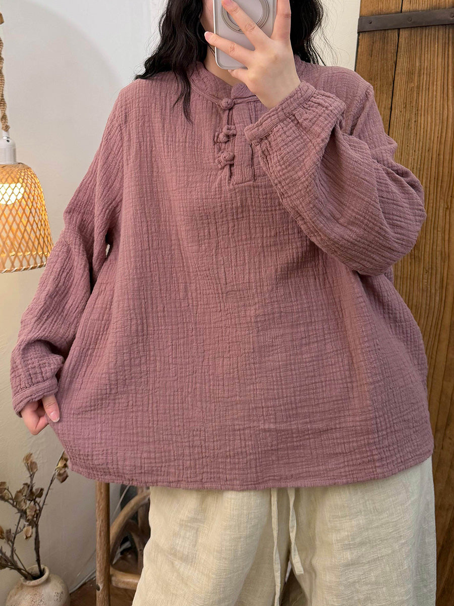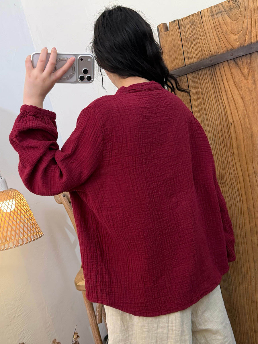 Blusa étnica de algodón con cuello alto y color puro para mujer