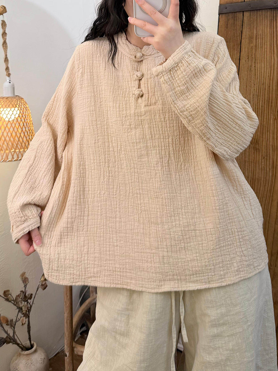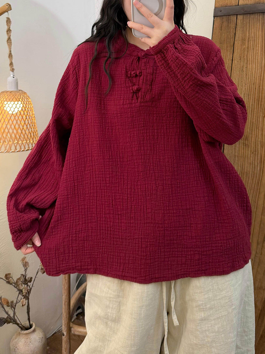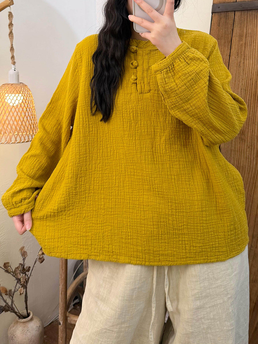 Blusa étnica de algodón con cuello alto y color puro para mujer