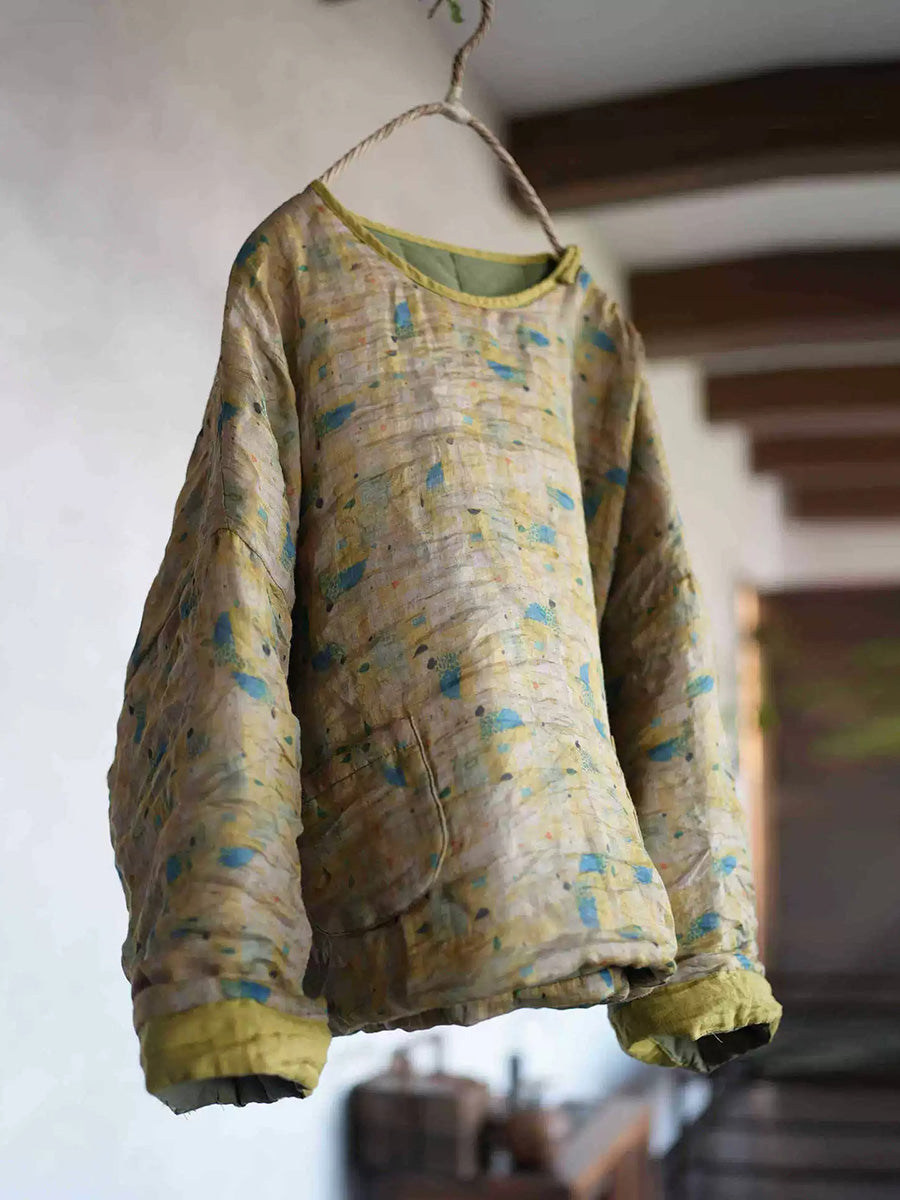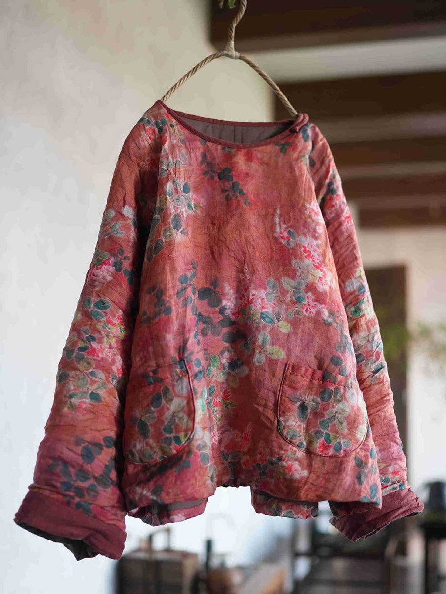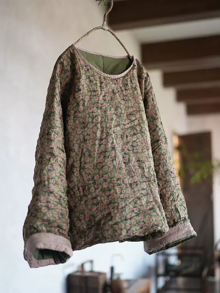 Abrigo acolchado retro floral de ramio con cuello redondo para mujer