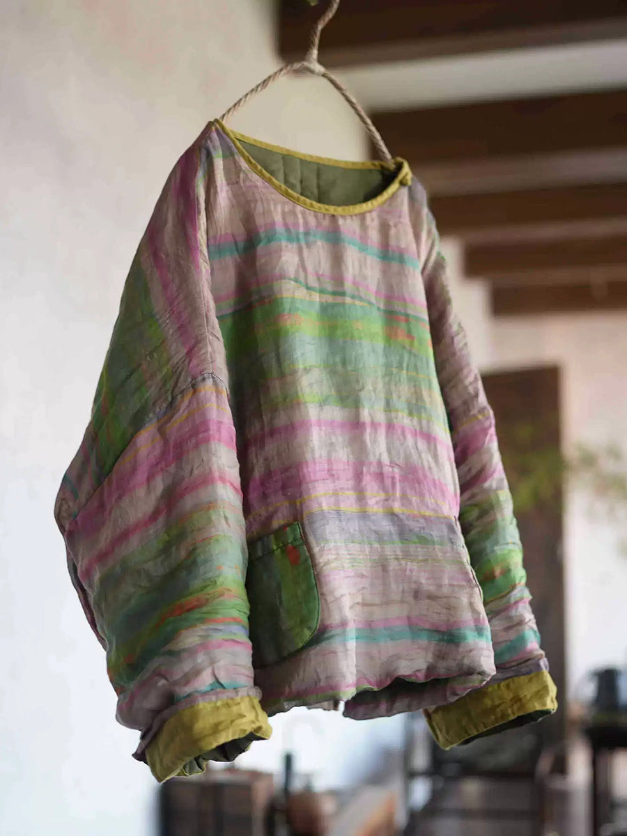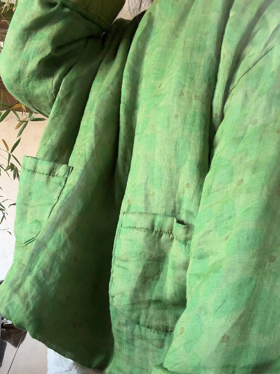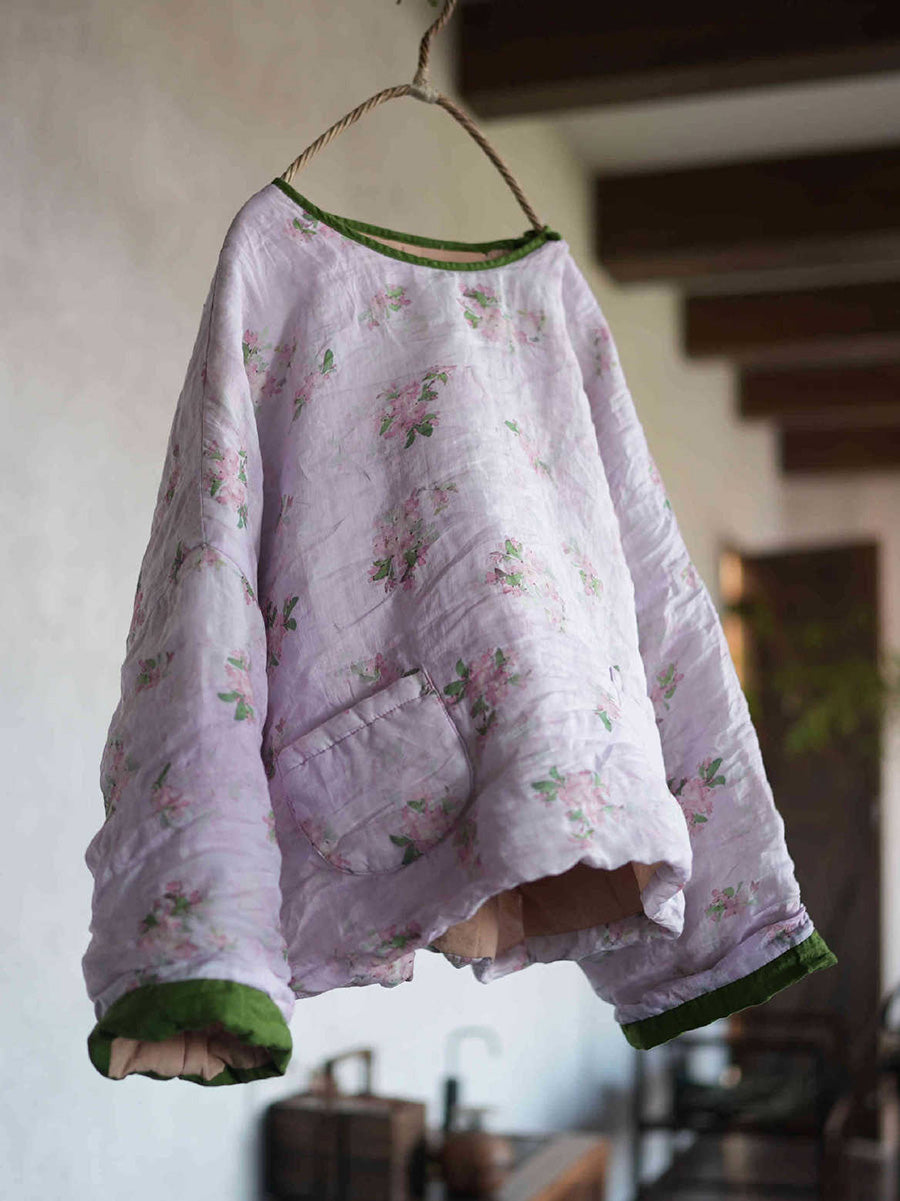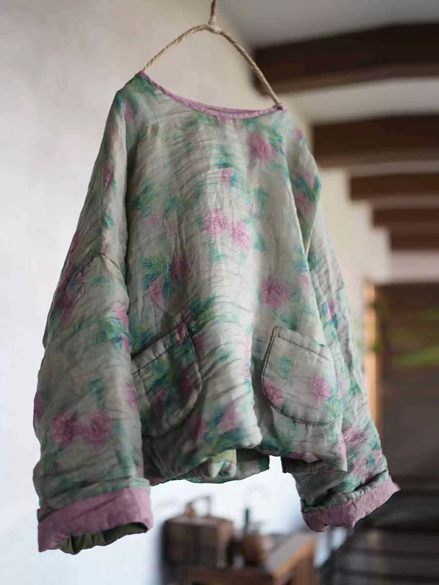 Abrigo acolchado retro floral de ramio con cuello redondo para mujer