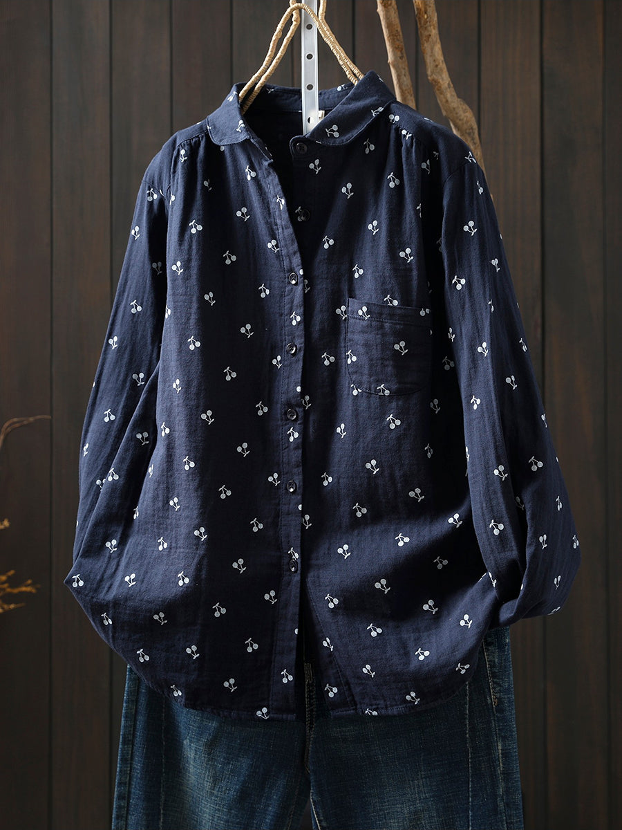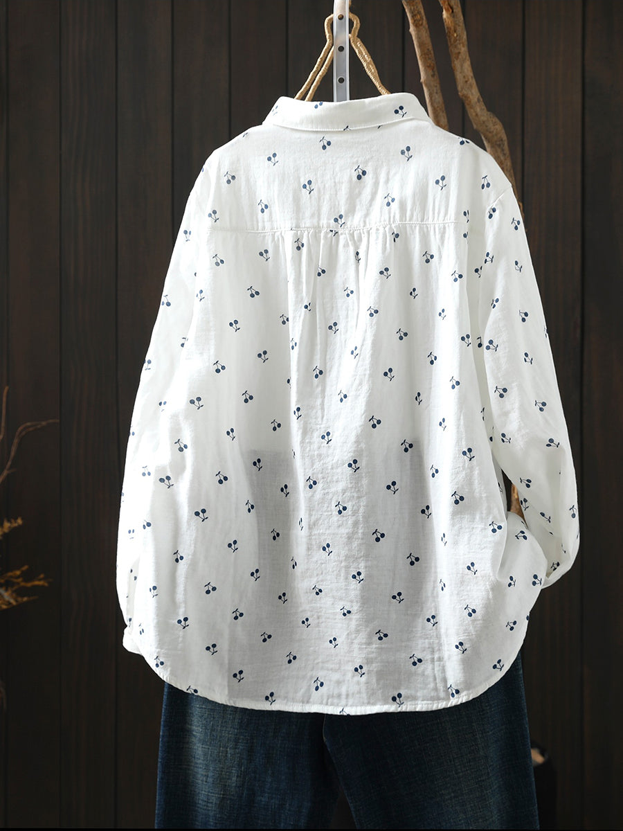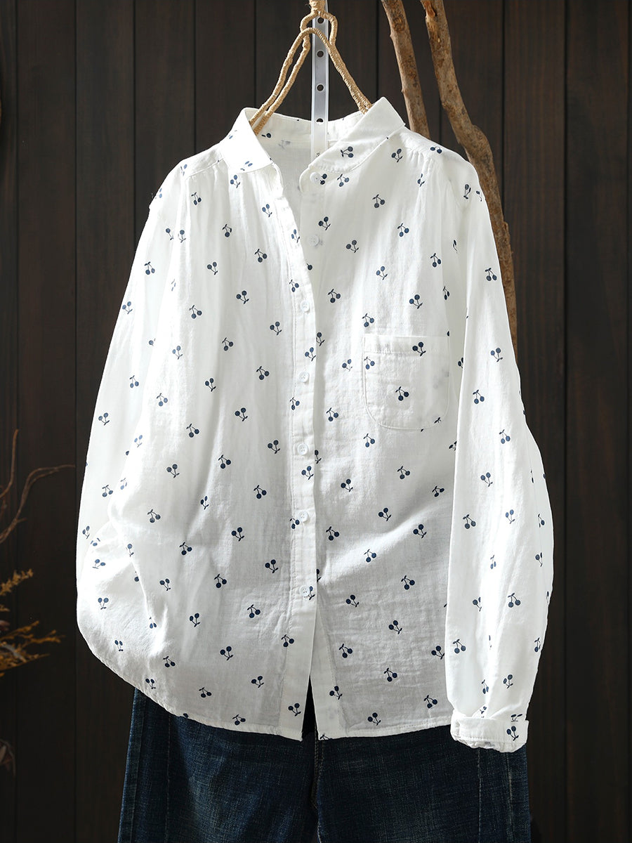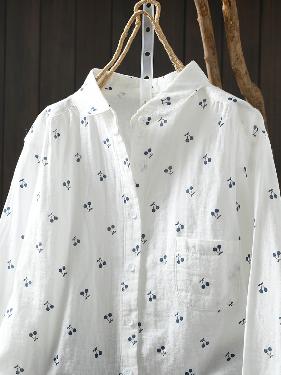 Camisa de primavera para mujer con bordado de cerezas artísticas, 100 % algodón