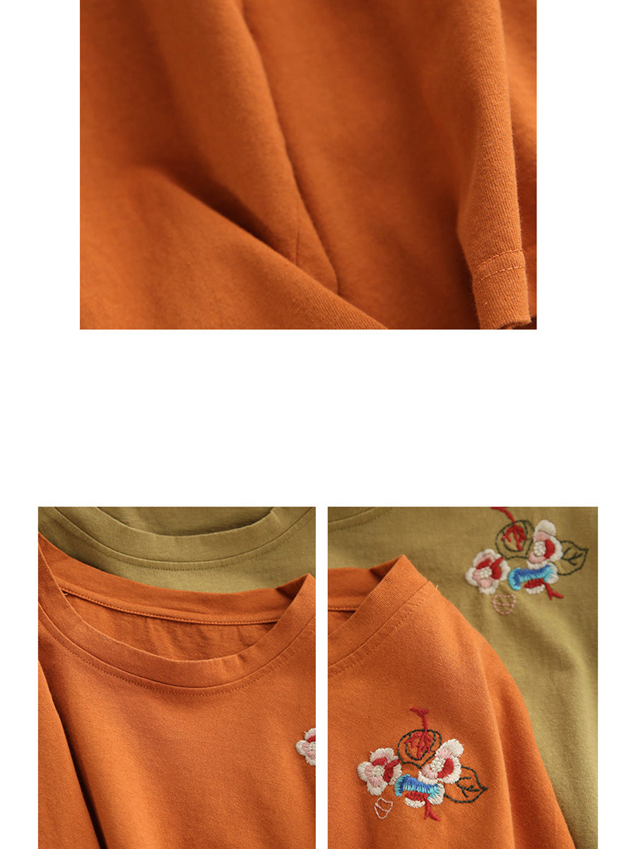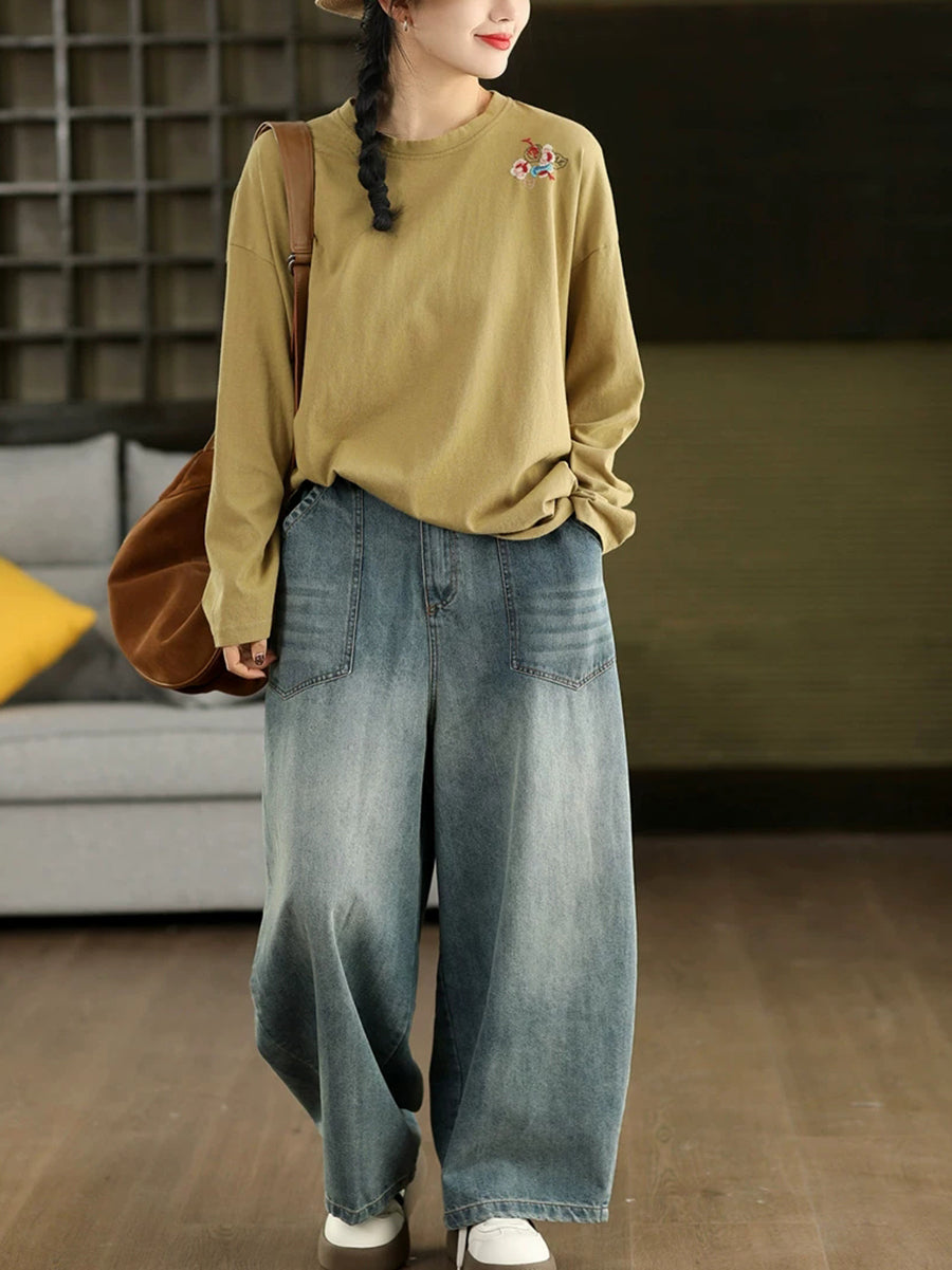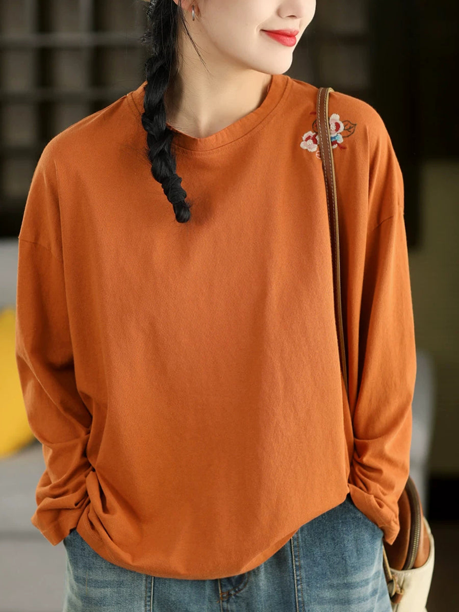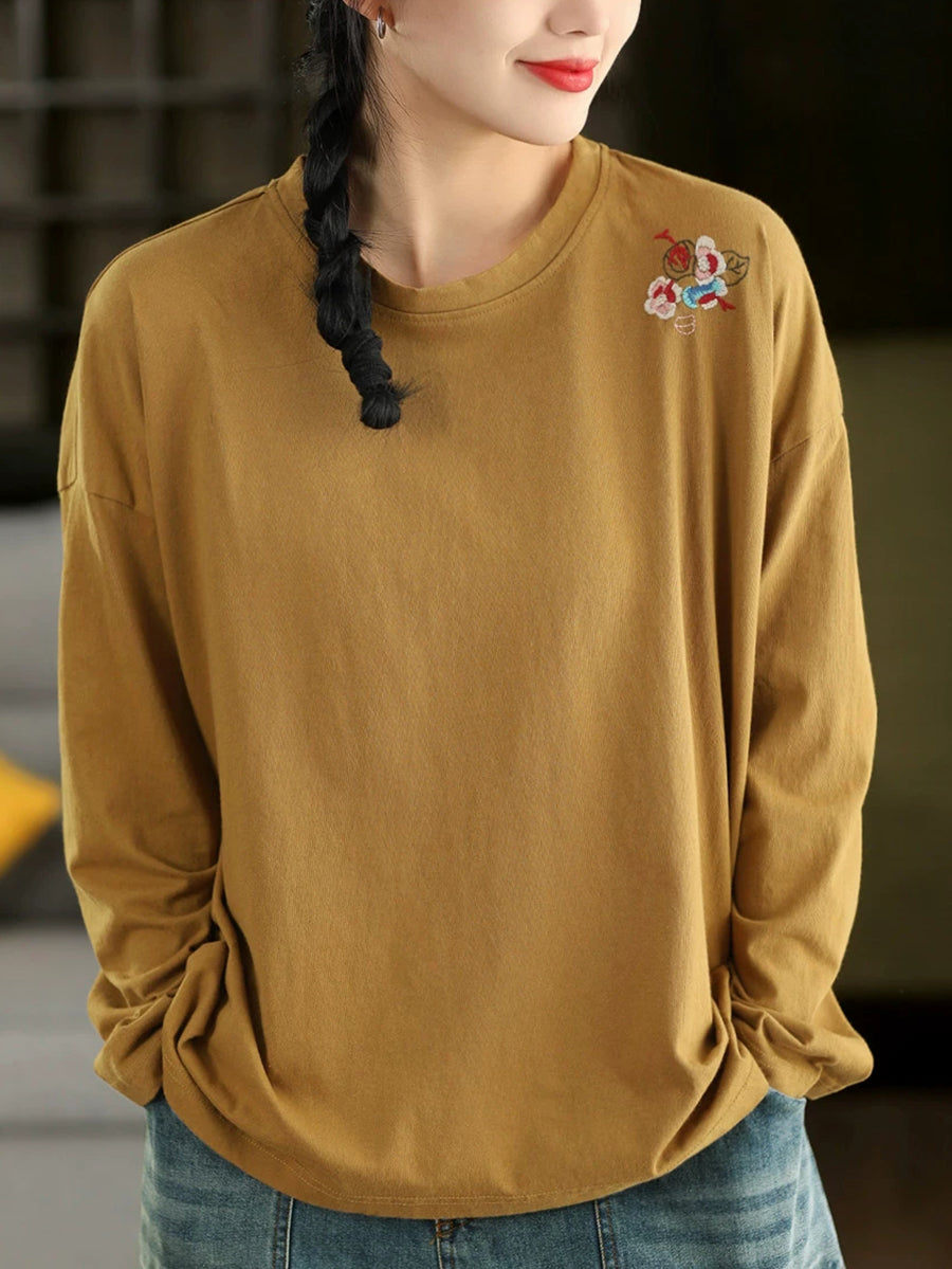 Blusa de cuello redondo 100 % algodón con bordado artístico de primavera para mujer