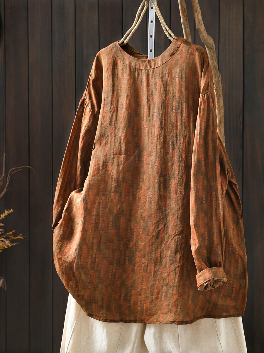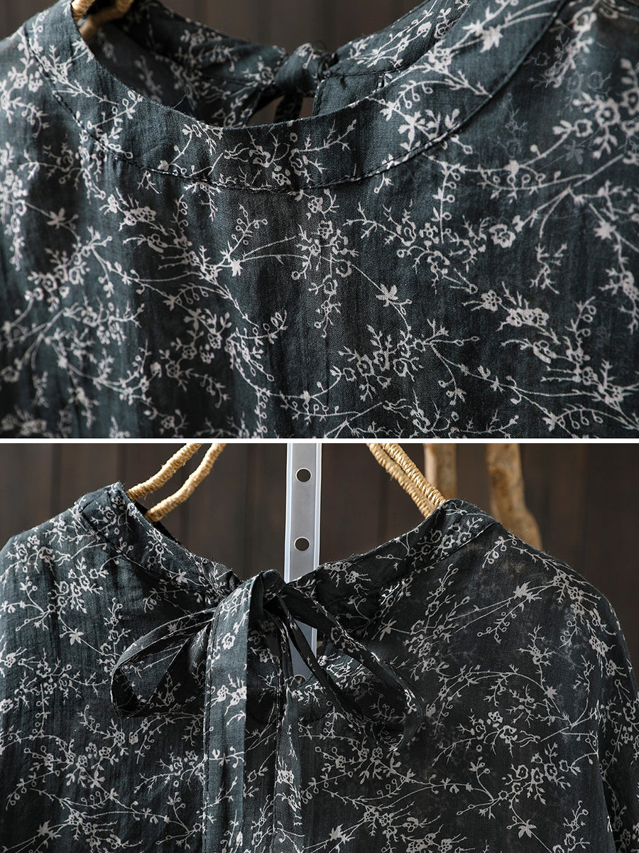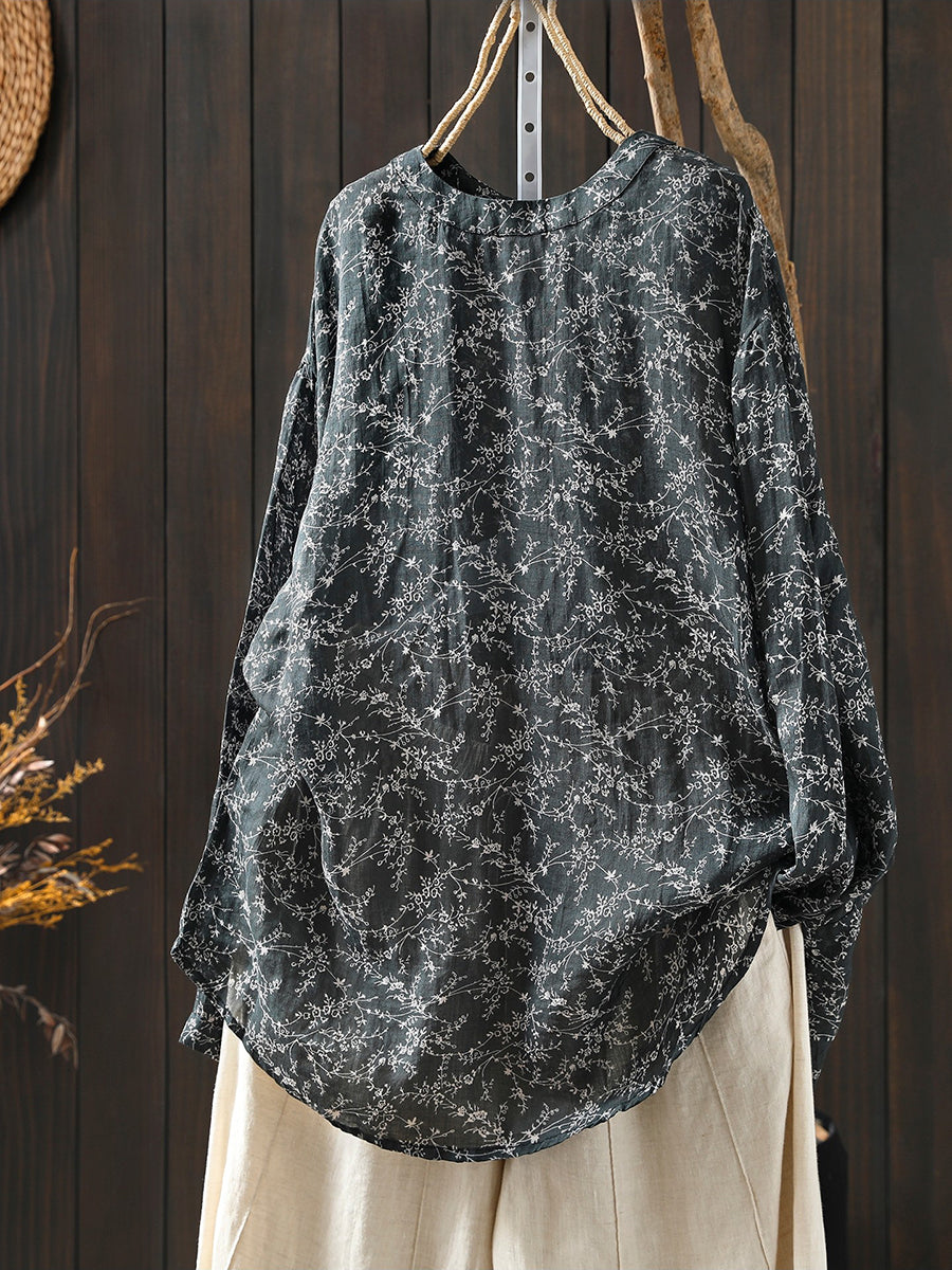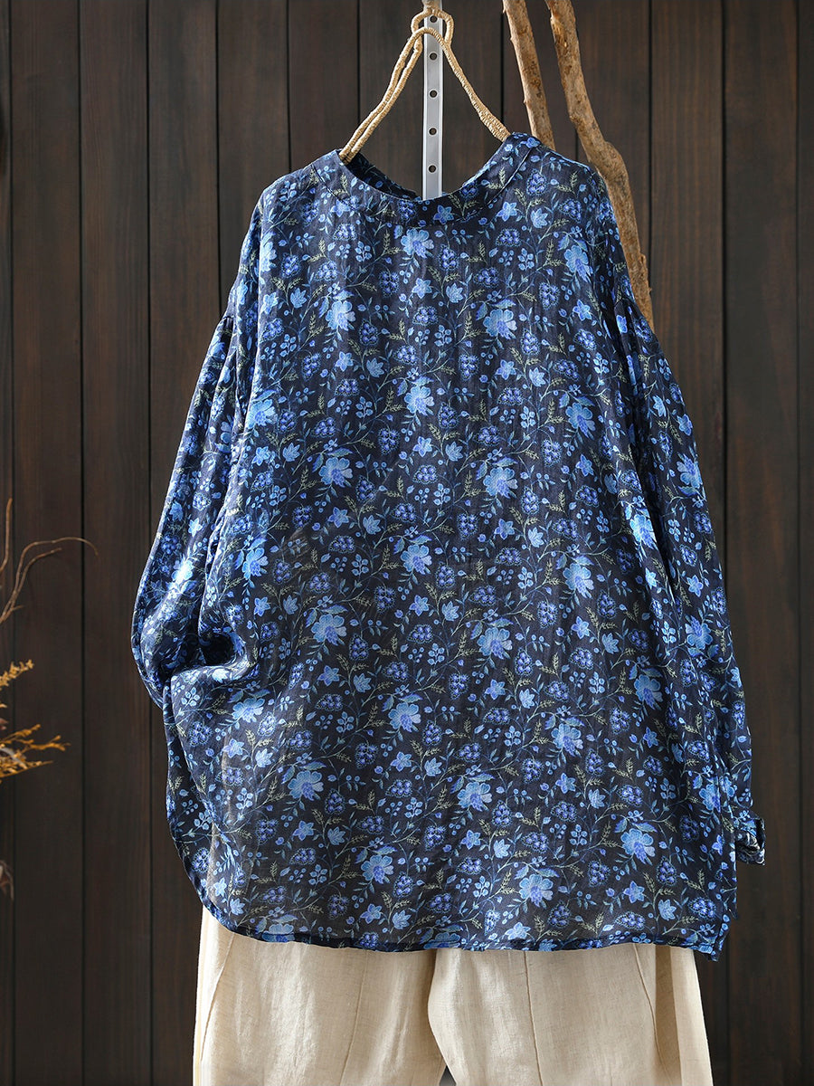 Blusa de primavera para mujer con cuello redondo, 100 % ramio y estampado floral artístico