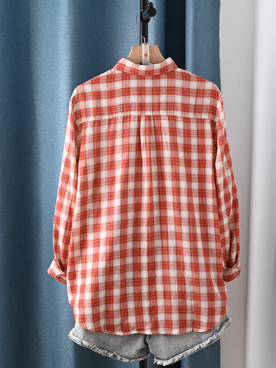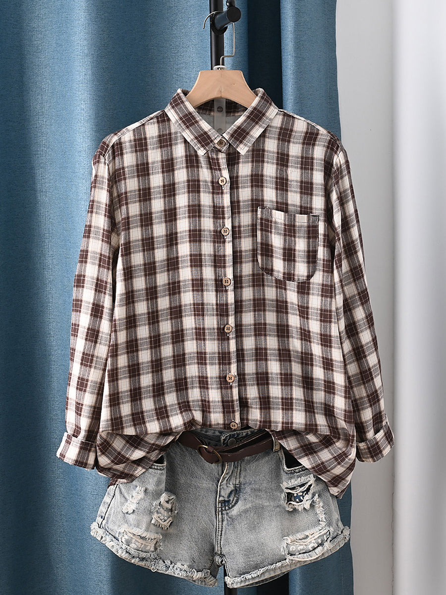 Camisa de algodón 100 % con cuello vuelto y estampado artístico de cuadros para mujer, primavera